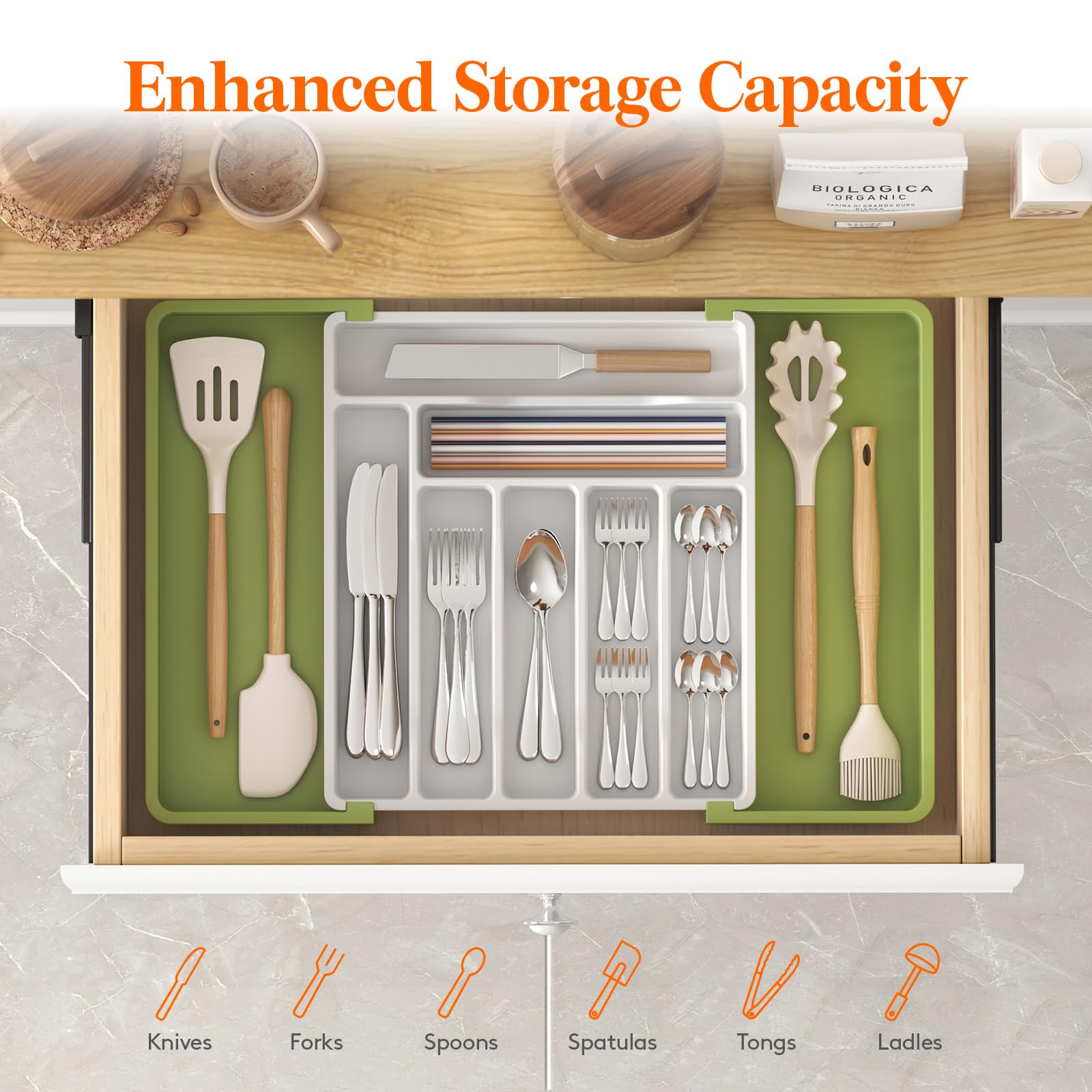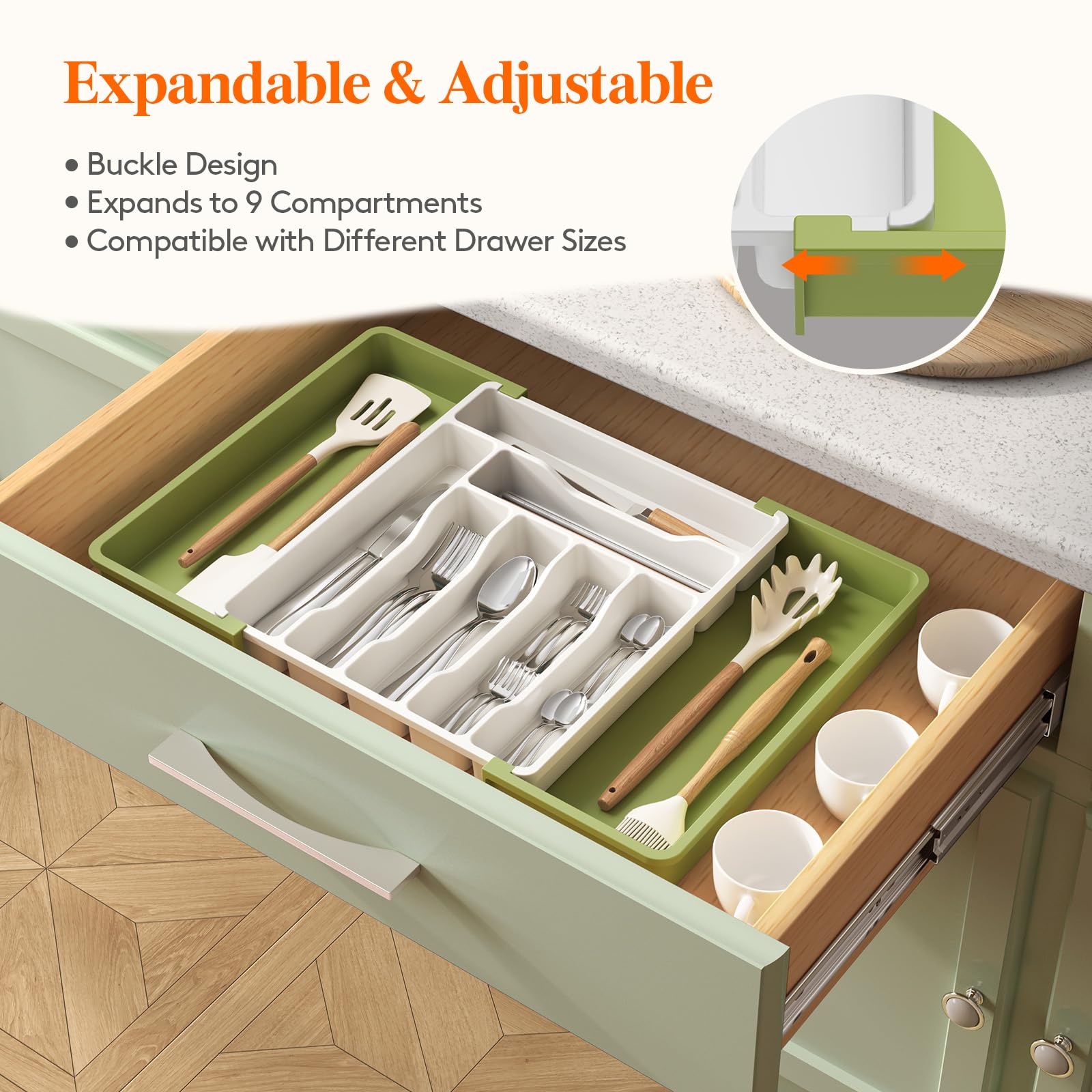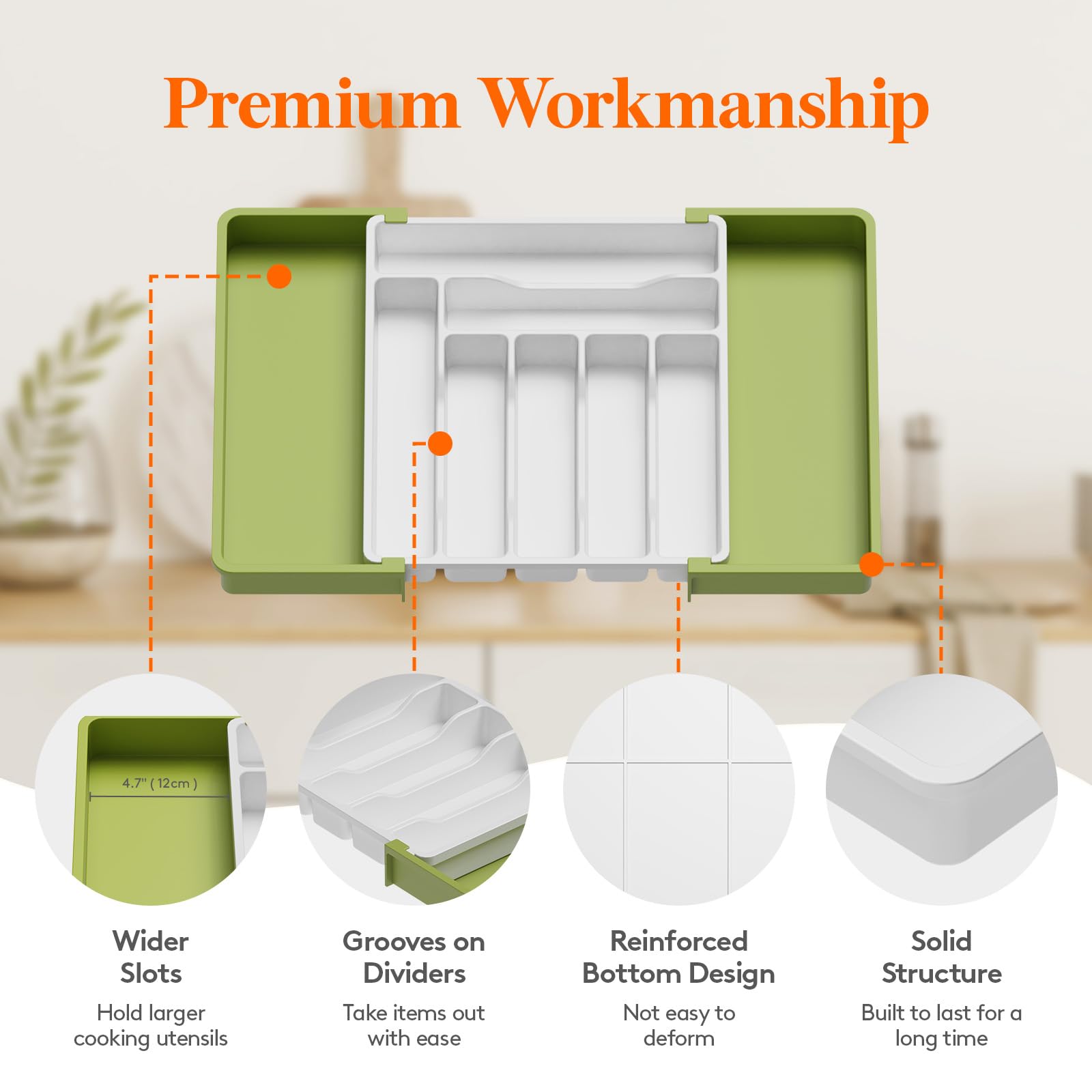 Sort Your Silverware: The silverware tray comes with 7-9 compartments, creating more space in drawers for spoons, cutlery, and flatware. The expandable sections are ideal for storing larger cooking utensils. Streamline your cooking with a no-install organizer that keeps cutlery at your fingertips