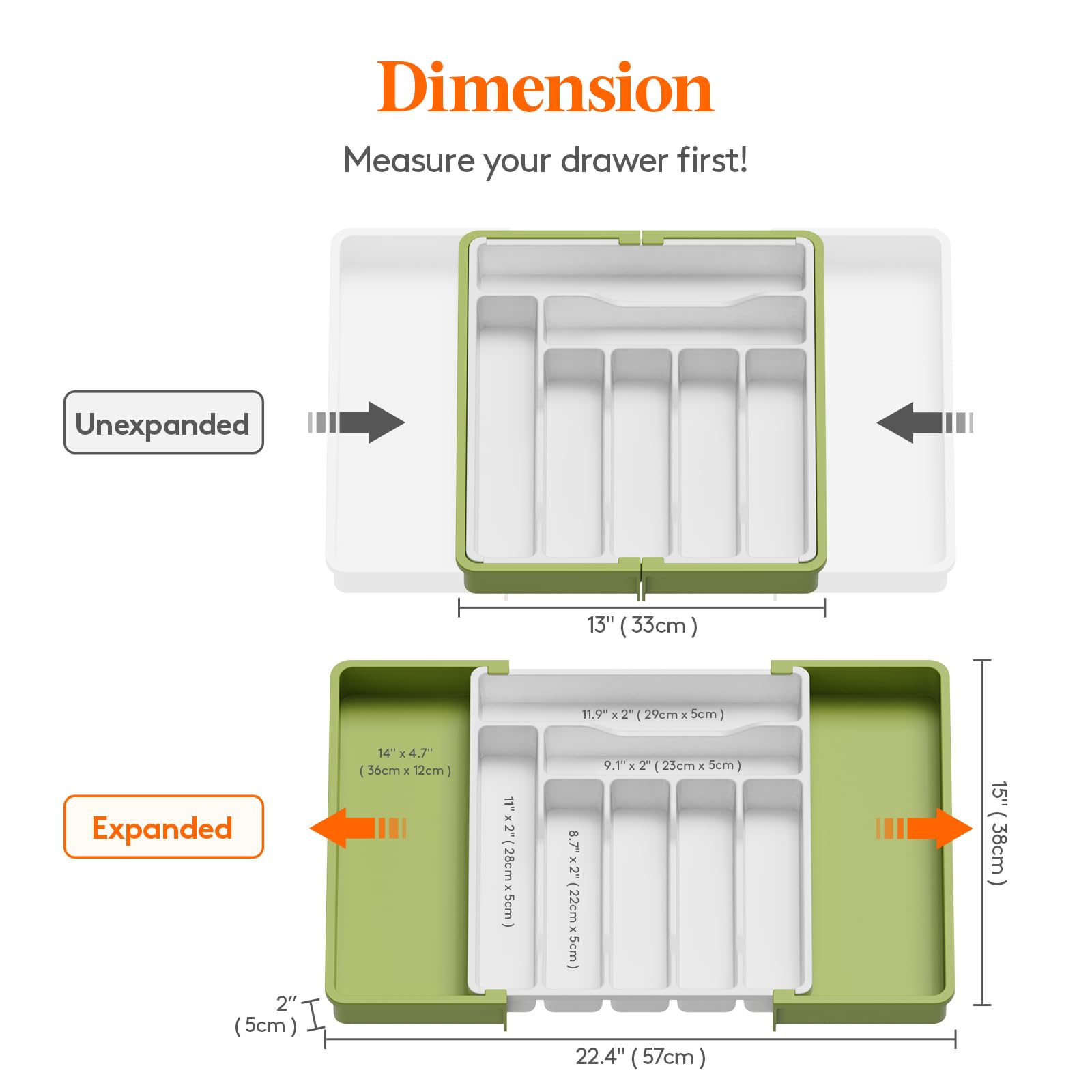 Adjustable Design: With its retractable design, The Lifewit silverware organizer fits drawers of various sizes and shapes. It measures 13'' wide when folded while reaching 22.4'' when fully expanded. This universal utensil drawer organizer helps you maximize storage space efficiently while keeping your utensils neatly organized and easily accessible