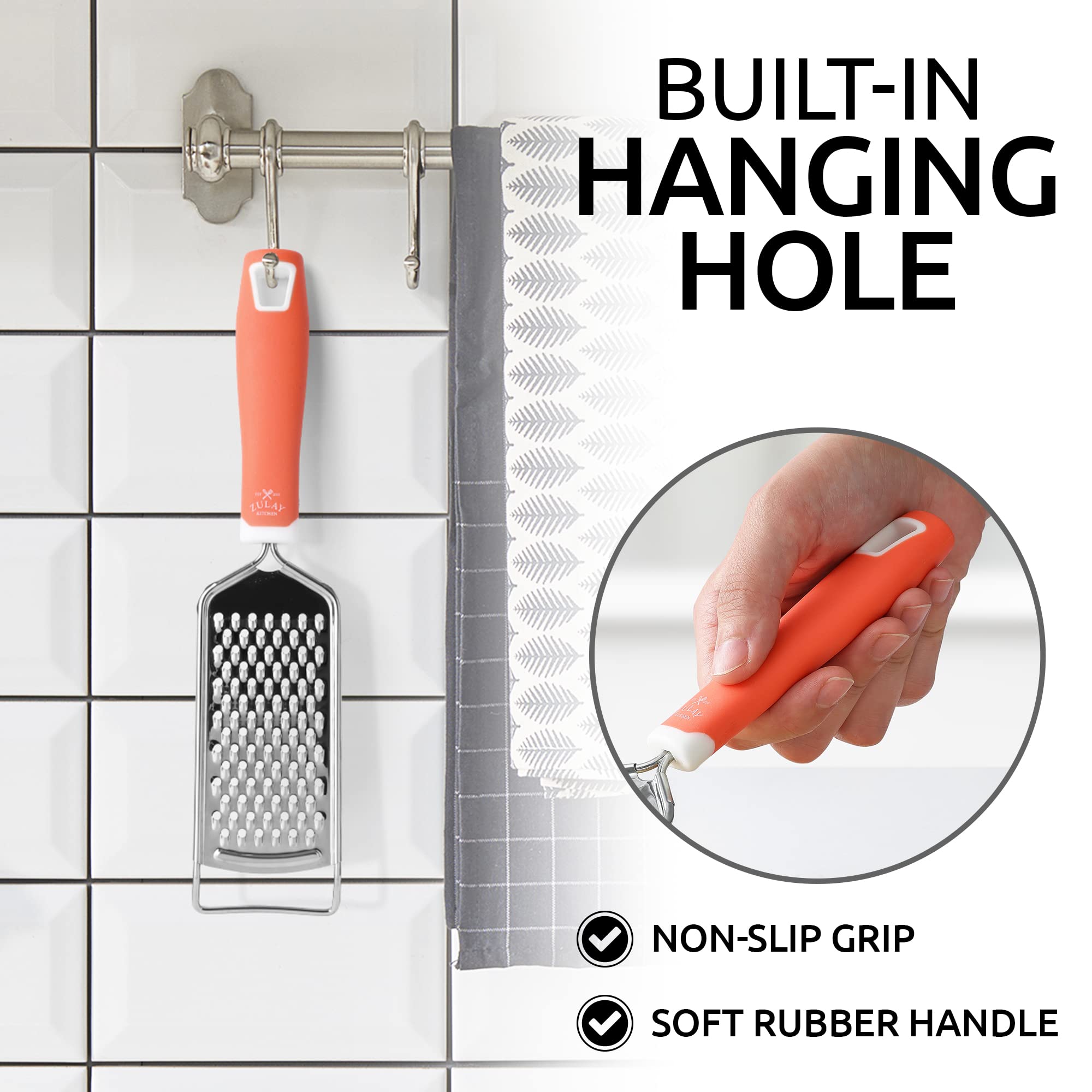 Easy To Clean & Store: Replace your old style box grater that is super difficult to clean and takes so much space with this handheld flat grater that will surely save you so much time and effort just by cleaning through the running water or by a dishwasher. Its handle is thoughtfully designed with a hanging hole for convenient storage.