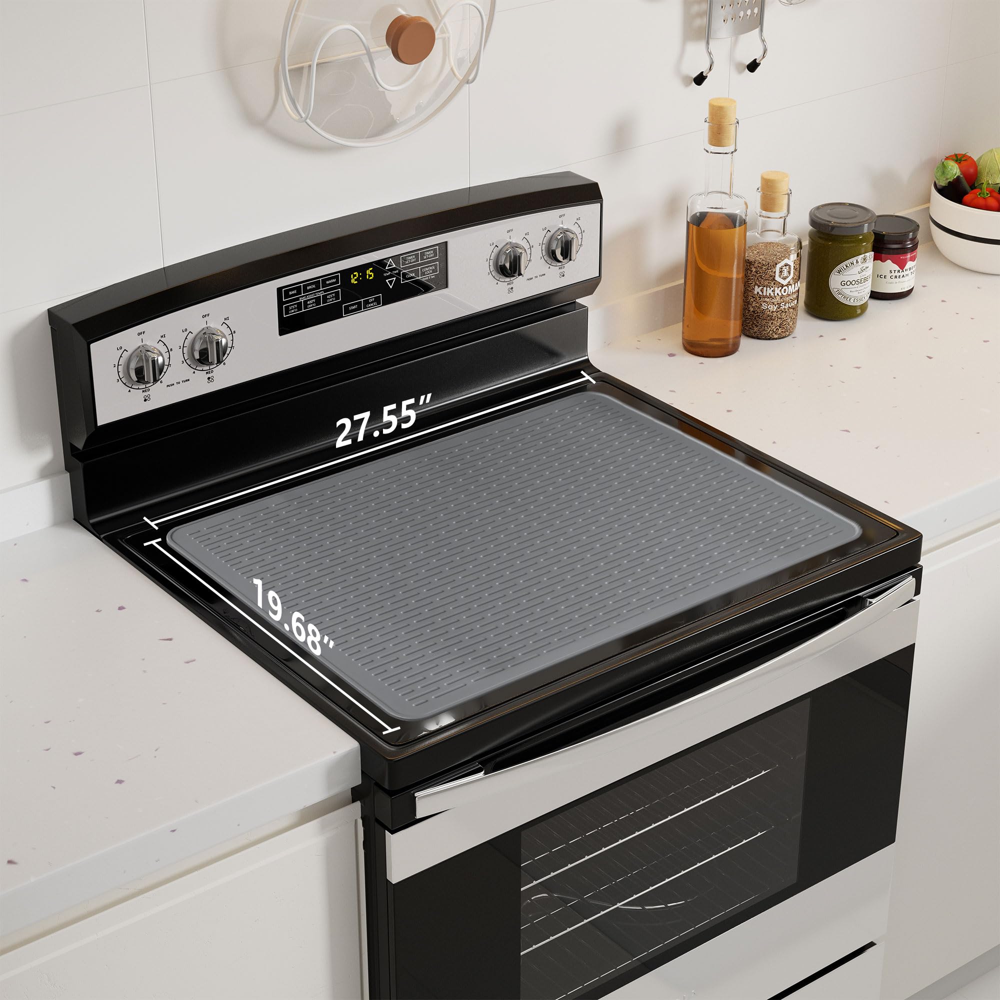 Glass Top Stove Cover:This extra large 28" x 20" inches silicone stove cover for glass top electric stove is perfect for protecting your electric stove top, kitchen counter top, electric cooktop, table, or washer-dryer top from scratches, spills, stains, scrapes, and dirt. It keeps the surface clean and tidy while providing an expandable workbench for food preparation.