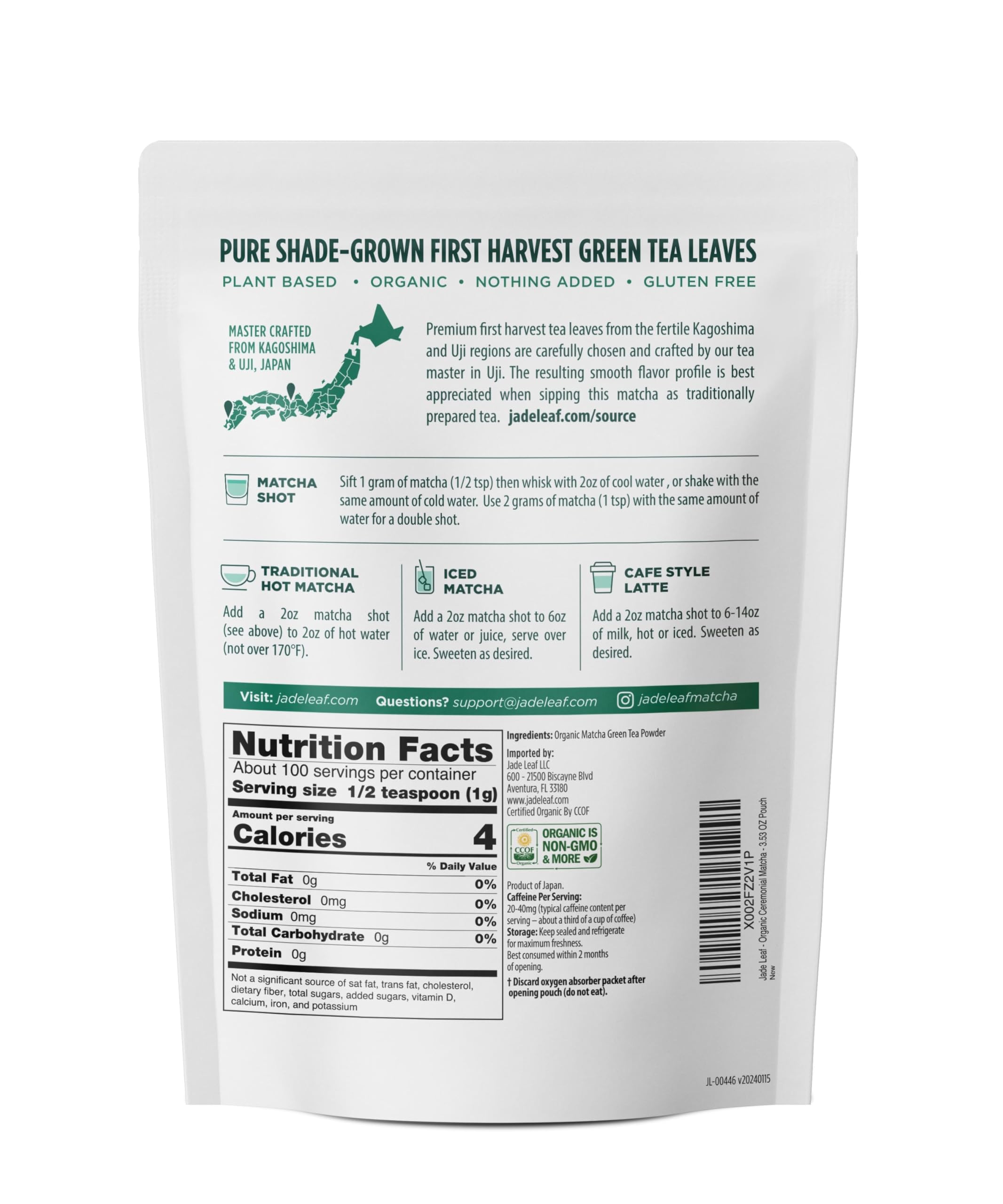 JADE LEAF MATCHA: Jade Leaf is proudly the #1 Matcha brand in the US*. We source our matcha directly from family owned partner farms across the Uji and Kagoshima regions. Our tea masters fuse traditional and modern techniques to cultivate leaves brimming with flavor and nutrients, creating well rounded flavor blends, not found anywhere else.