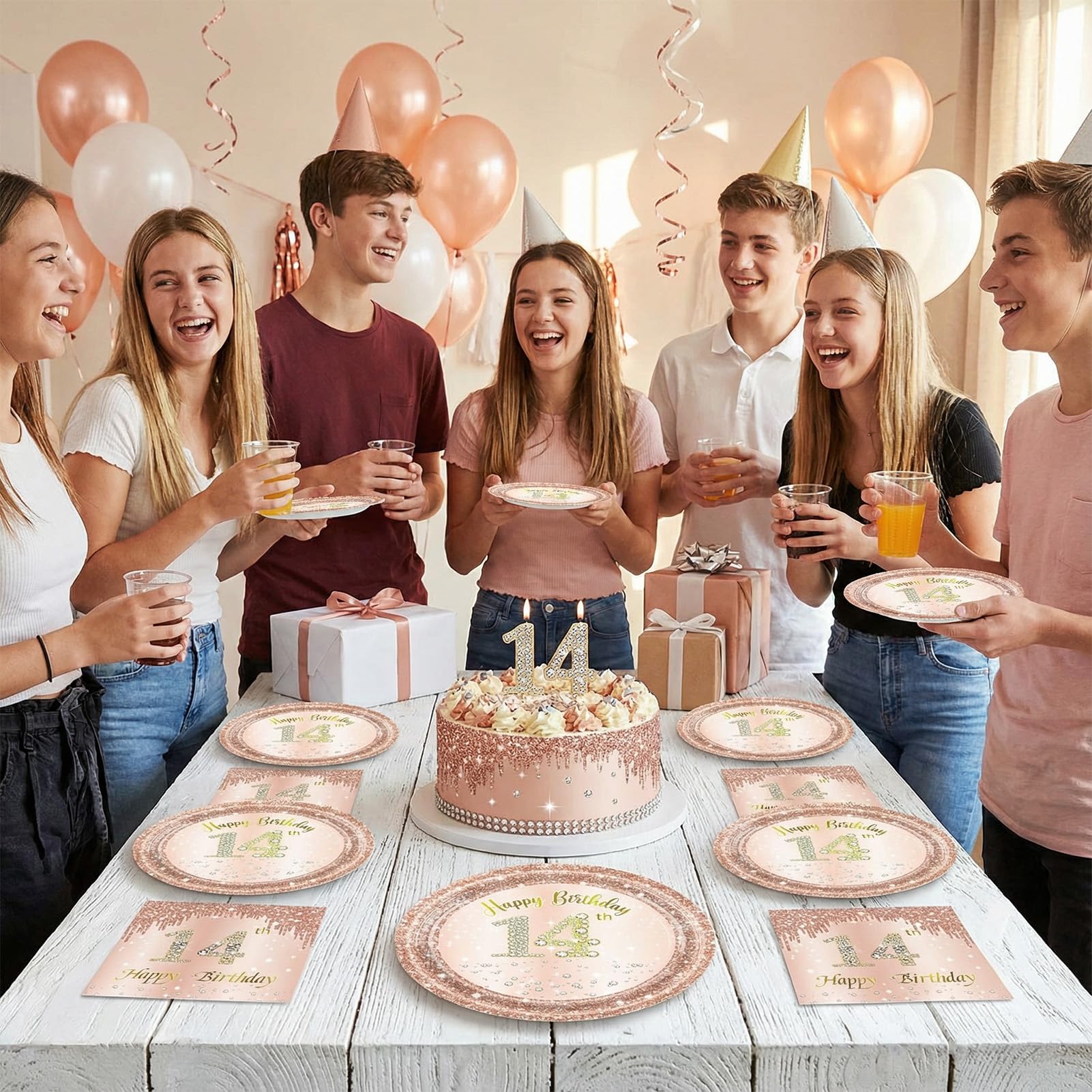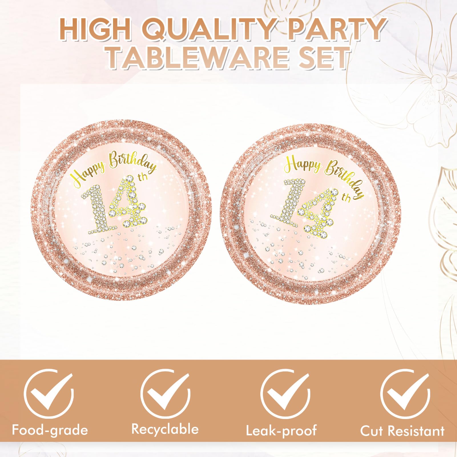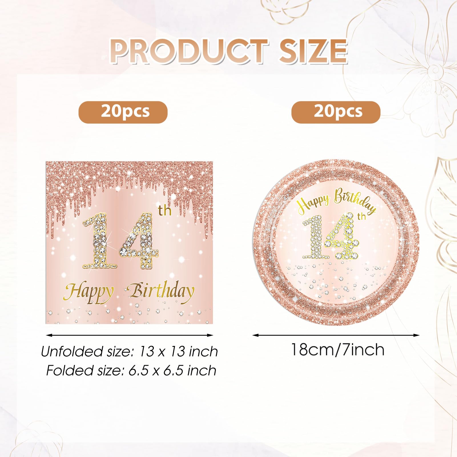 14 Birthday Decorations for Girls: You will receive 40Pcs 14 year old girl birthday decorations set,Including 20 pieces 7'' rose gold happy birthday party plates and 20 pieces 6.5'' 14th birthday napkins.these high quality 14th birthday table decorations and elaborate design will surely be the highlight of your wonderful party.