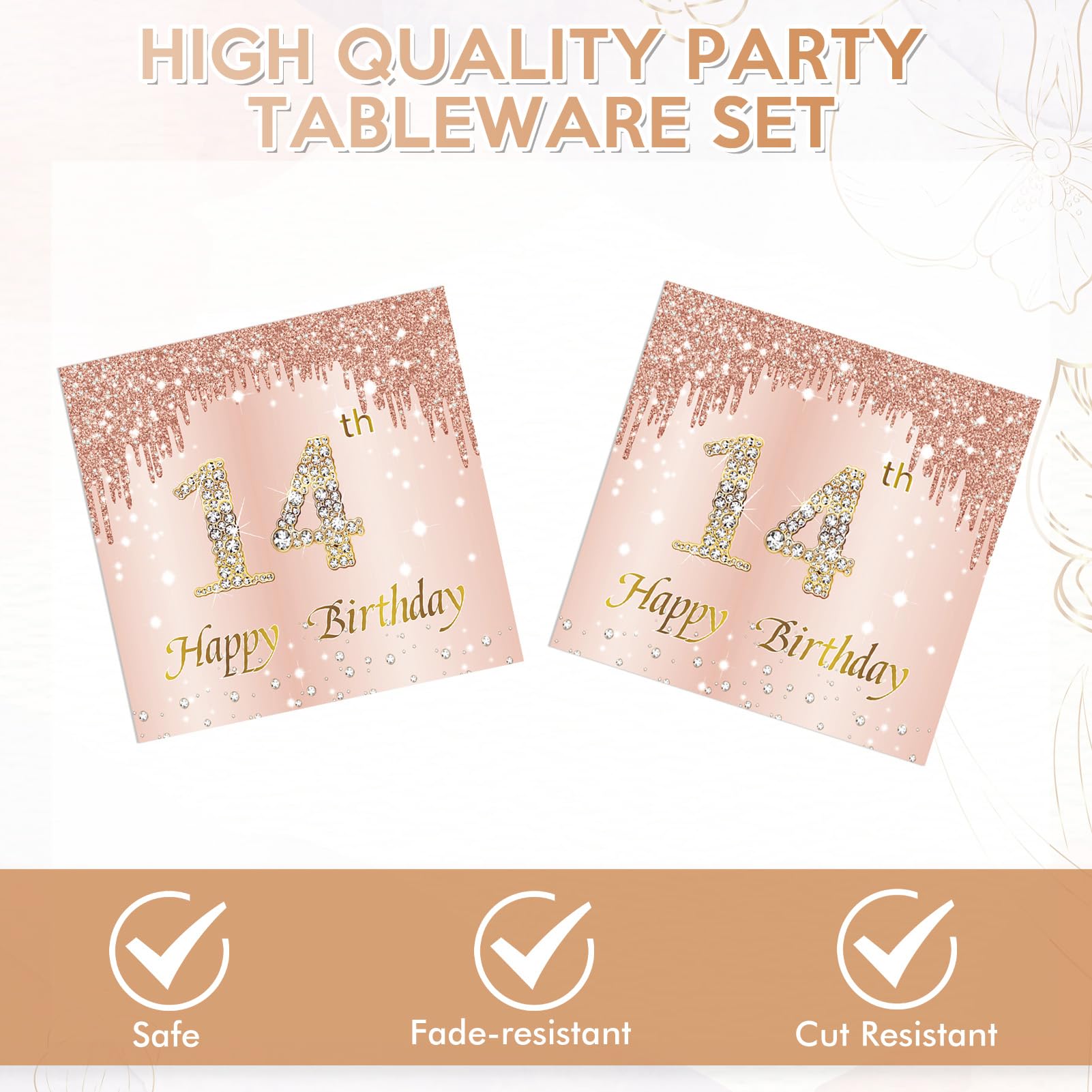 Premium Material: Our rose gold plates and napkins party supplies are all made of high quality thick paper, not easy to break or deform. The 14th birthday plates are coated with film, waterproof, with well printing, and the 14th birthday napkins are of good quality, soft, and not easy to break, ensuring a pleasant dining experience for your various party.