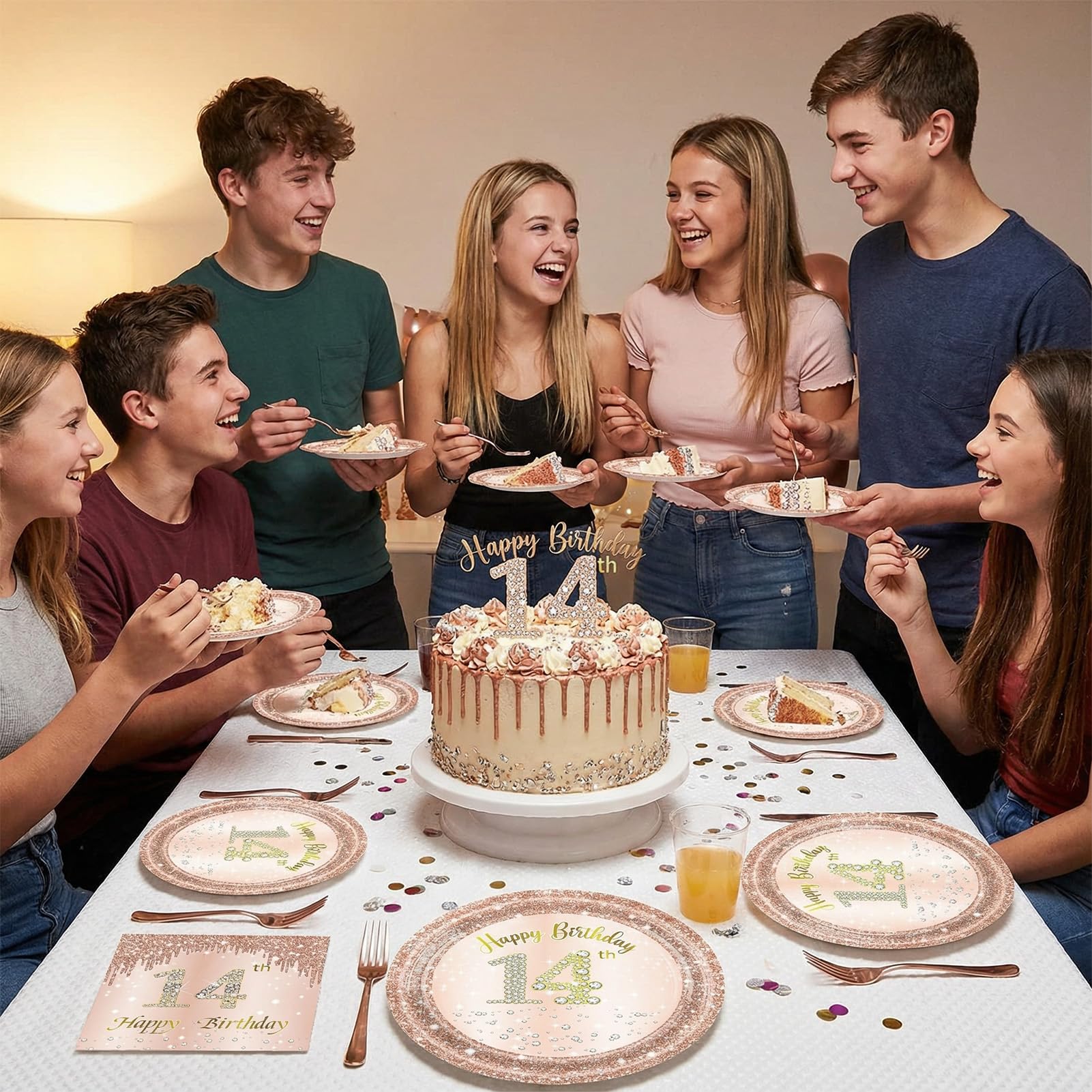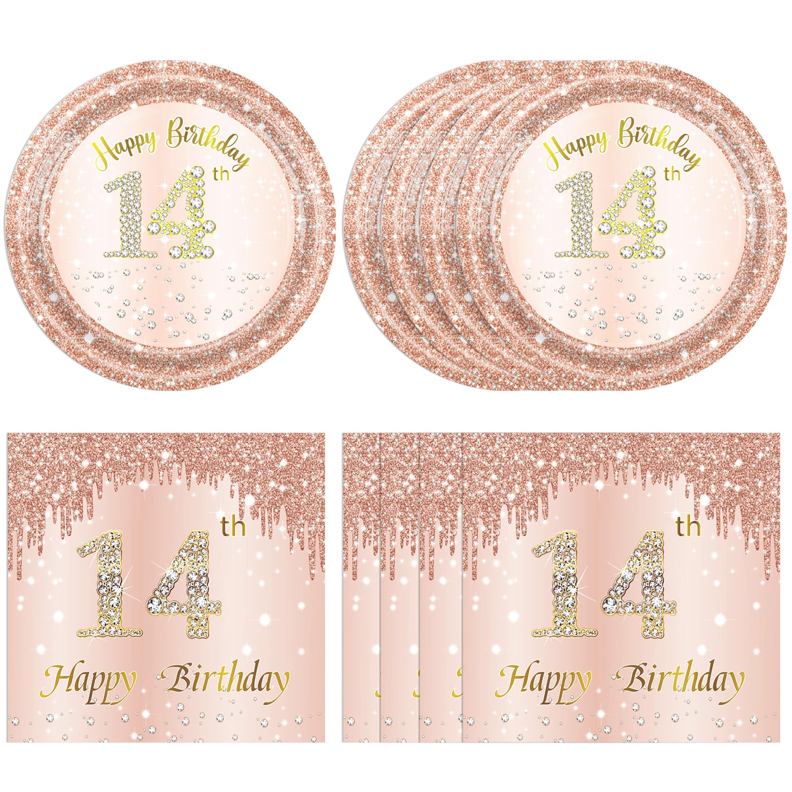 Eye-catching design: This 14th happy birthday theme party tableware for teen girls is all designed in a sweet rose pink background,eye-catching "Happy 14th Birthday" with sparkling stars and rose gold pink diamond party elements design, very beautiful and innovative design, can add beautiful decoration to your birthday party.