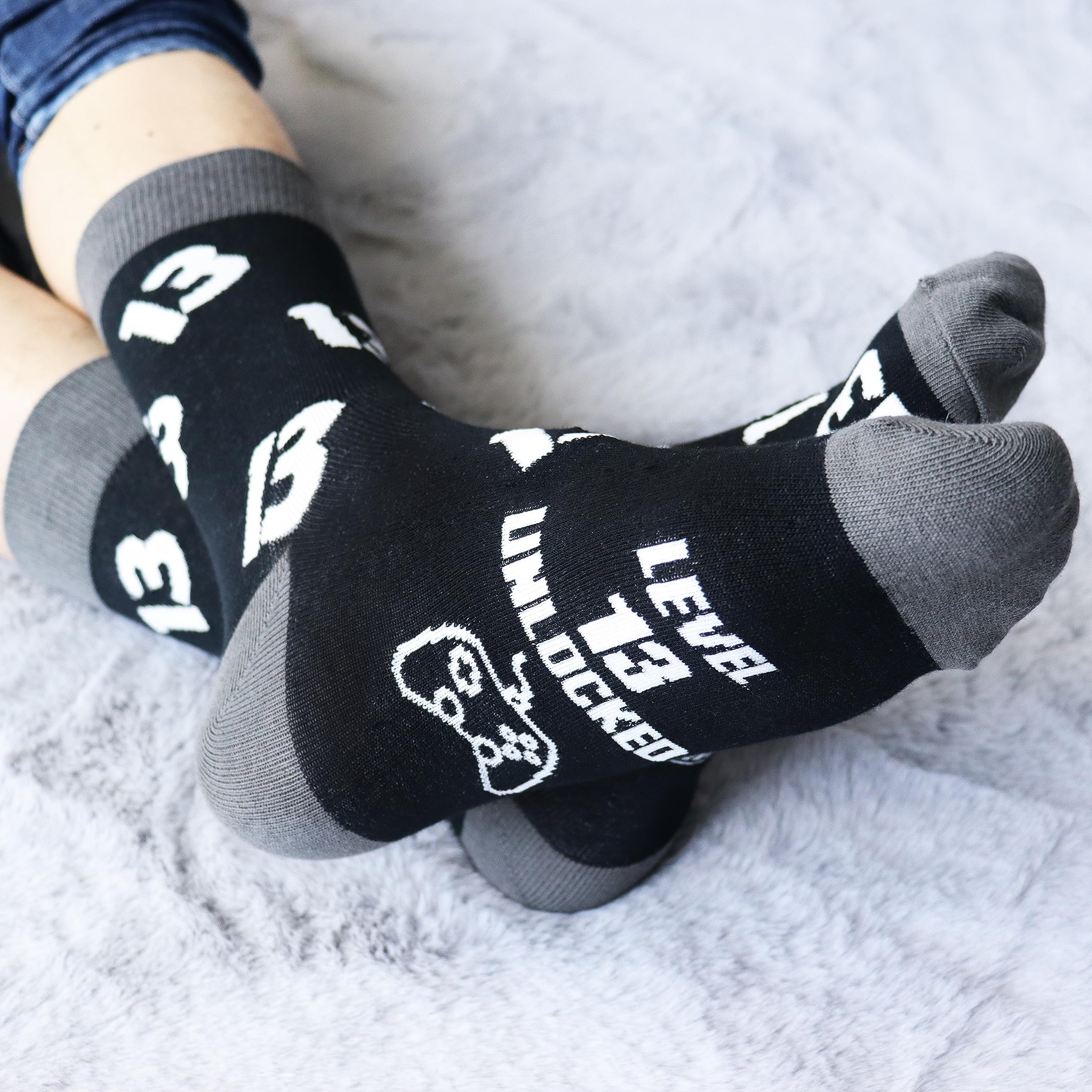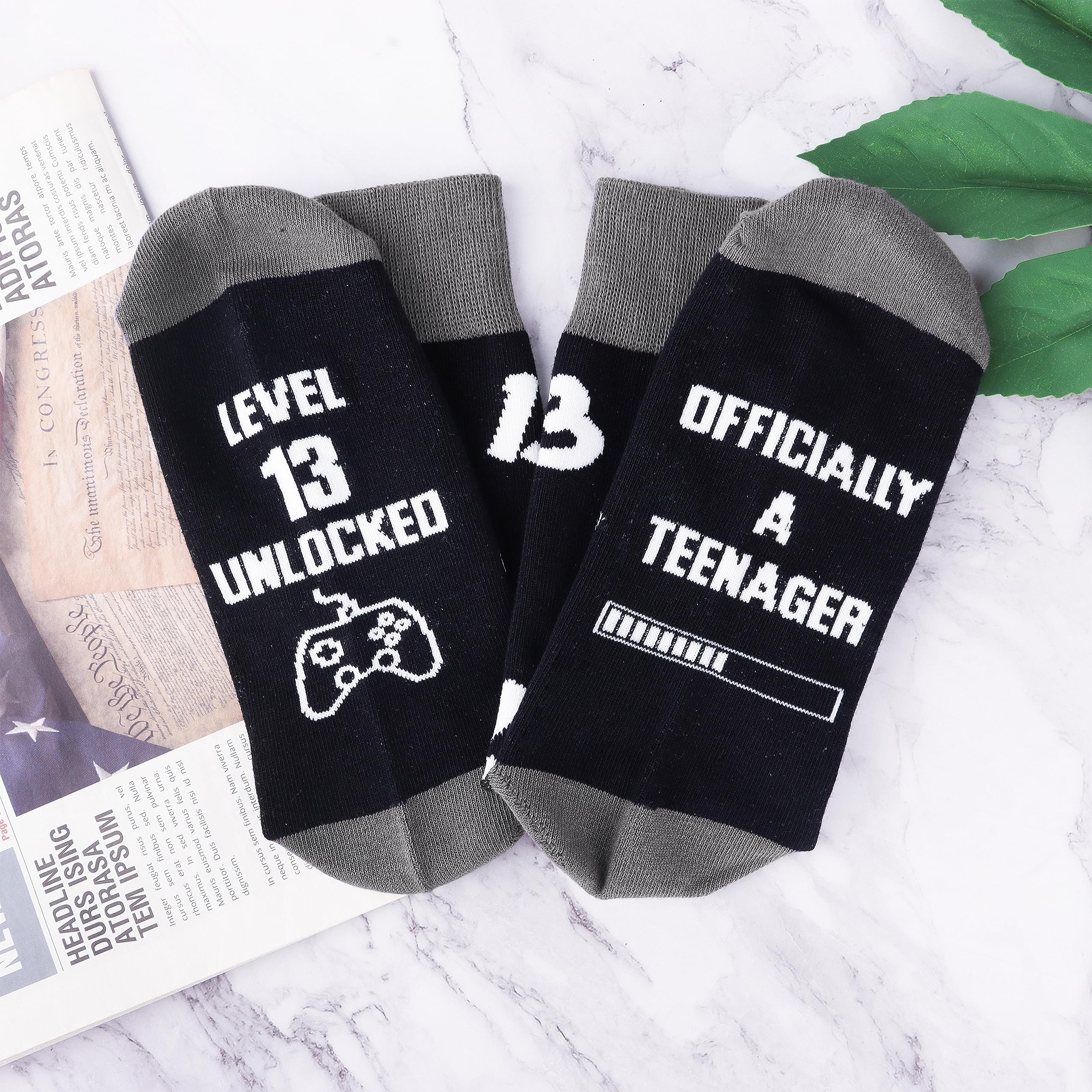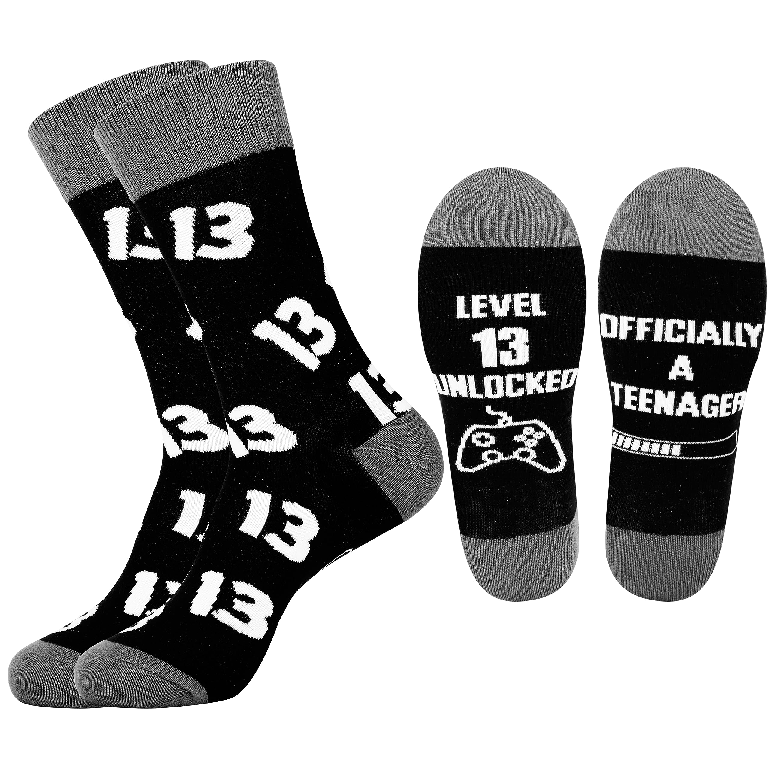Crew Socks for Men: The 13 year old socks designed with funny words “LEVEL 13 UNLOCKED, OFFICIALLY A TEENAGER” . The fun socks must be very good gifts for teen boys age 13.
