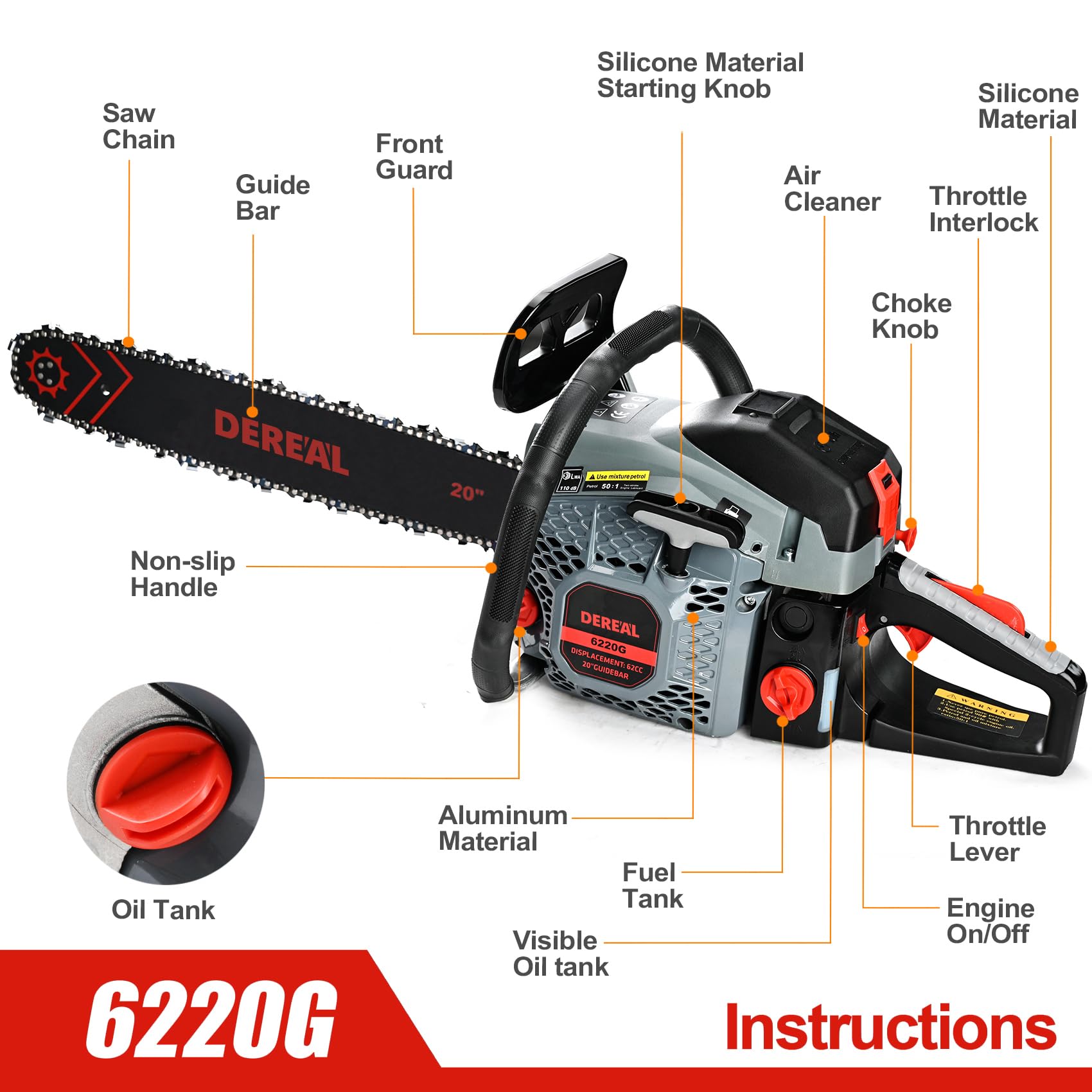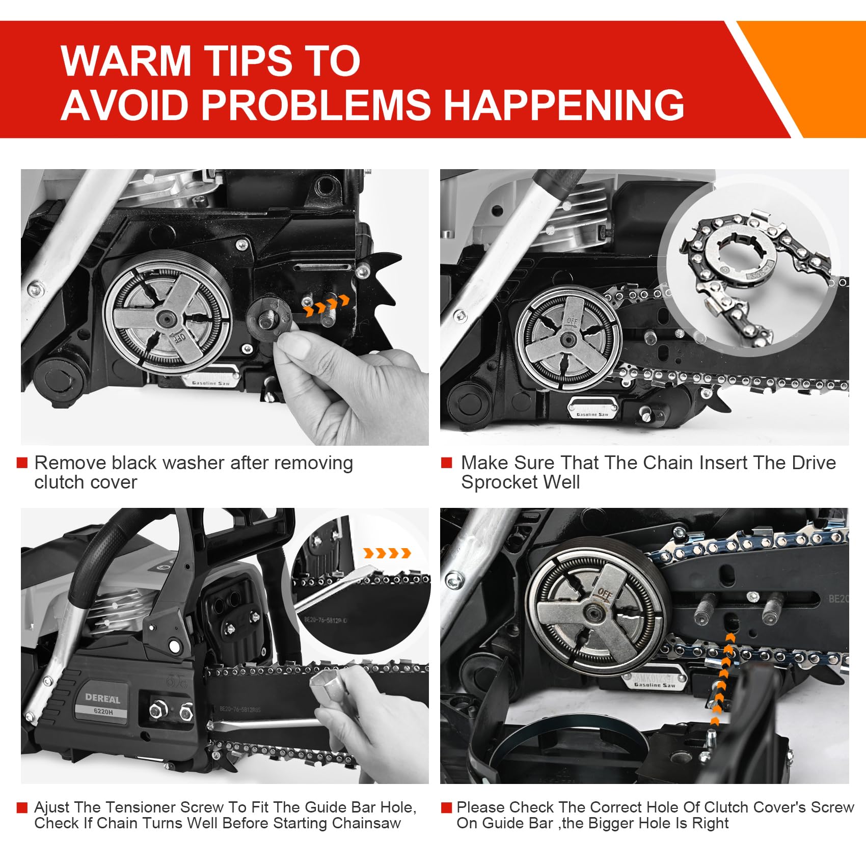 Ergonomic Design -- The comfortable handle design, non-slip and shock-absorbing, not easy to fatigue for a long-term use, making this chainsaw balanced, maneuverable, and comfortable to operate, use more securely