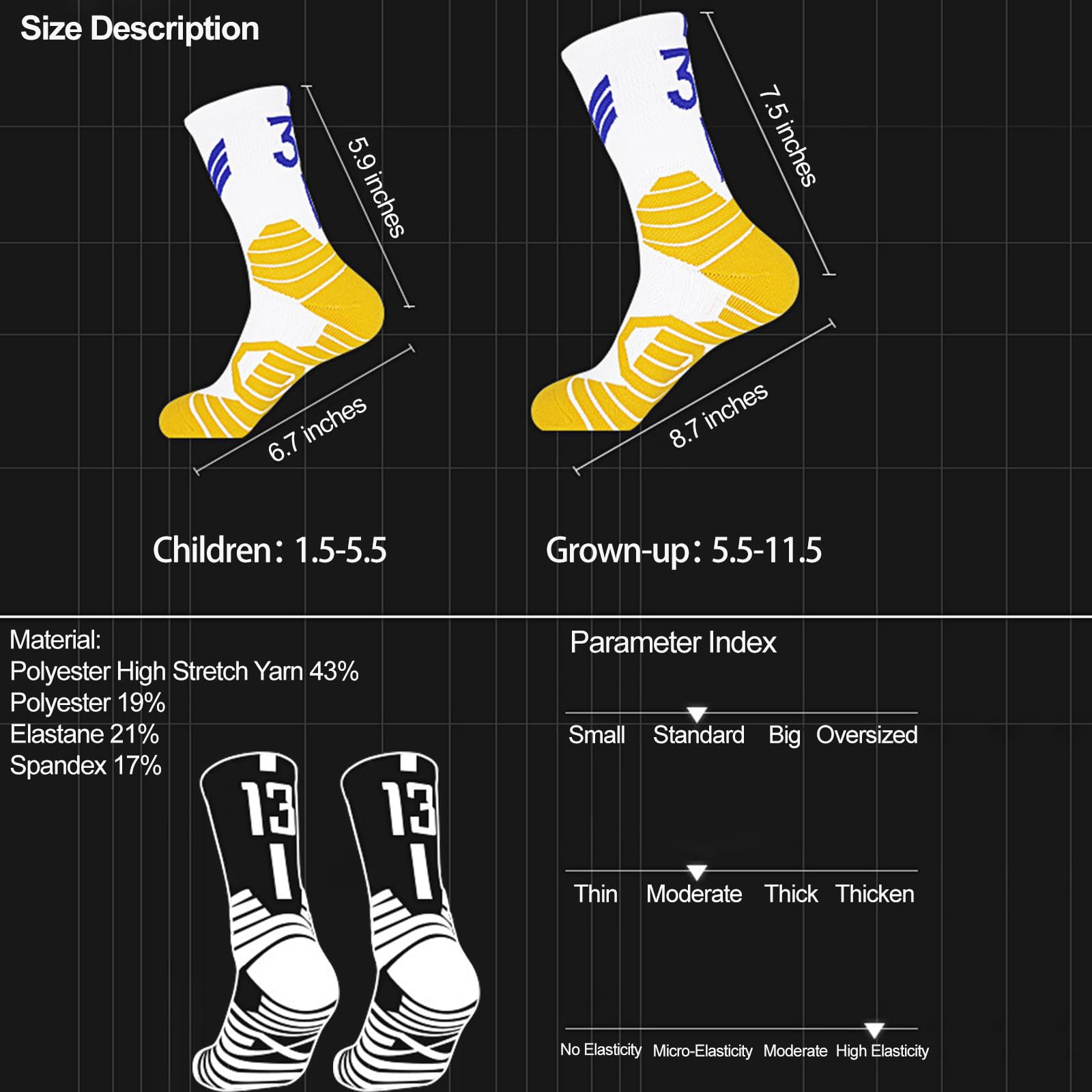 🧦 Size Range - Taking into account the foot size of children and adults, our basketball socks are suitable for boys with a size of 1.5 inches to 5.5 inches feet, while the size for men is 5.5 inches to 11.5 inches. Please pay attention to the size selection before buying, but because our athletic socks have super elasticity, if you have a pair of larger feet, it may also suit you.
