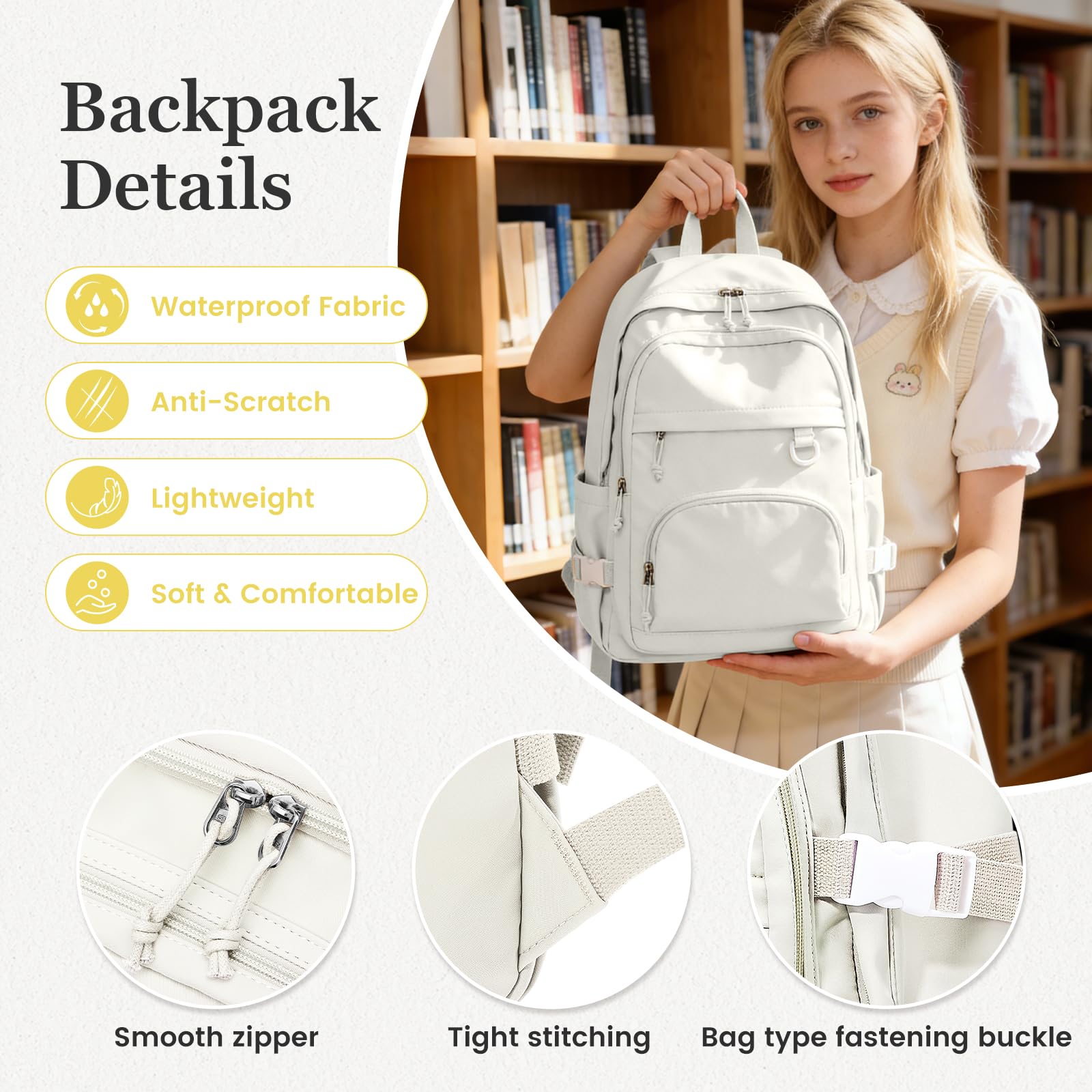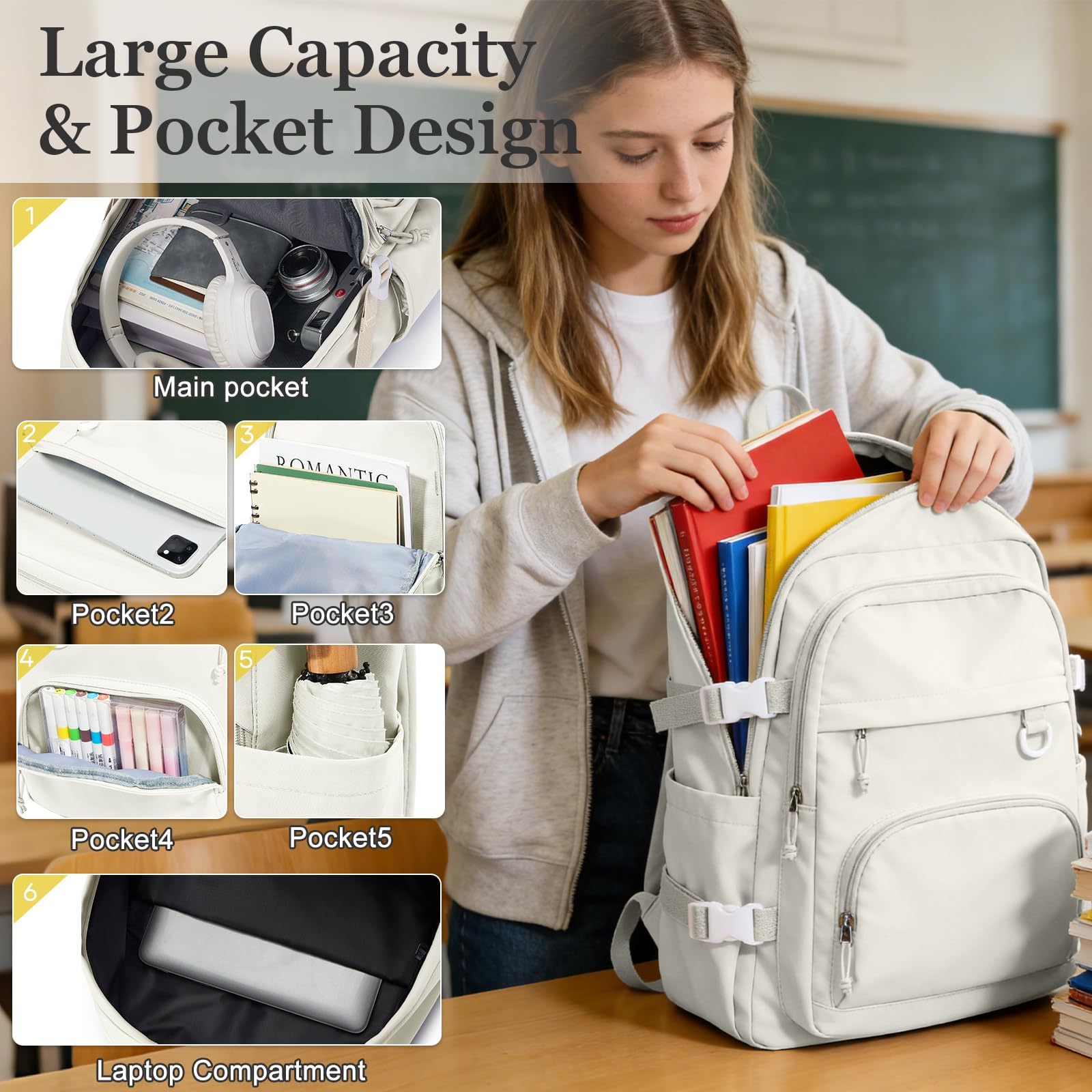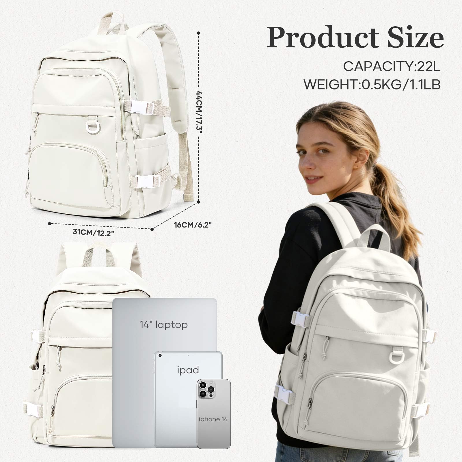 【Large Capacity】 This backpack offers a lot of storage space and is perfect for everyday use. The backpack has four pockets of different sizes, so you can put your laptop, iPad, power bank, camera, books and anything else you need, and keep it organized. In addition, there is a separate computer compartment in the main pocket that can hold up to 15.6-inch laptops.