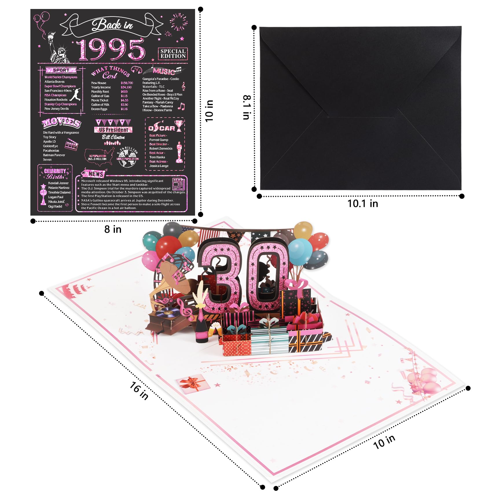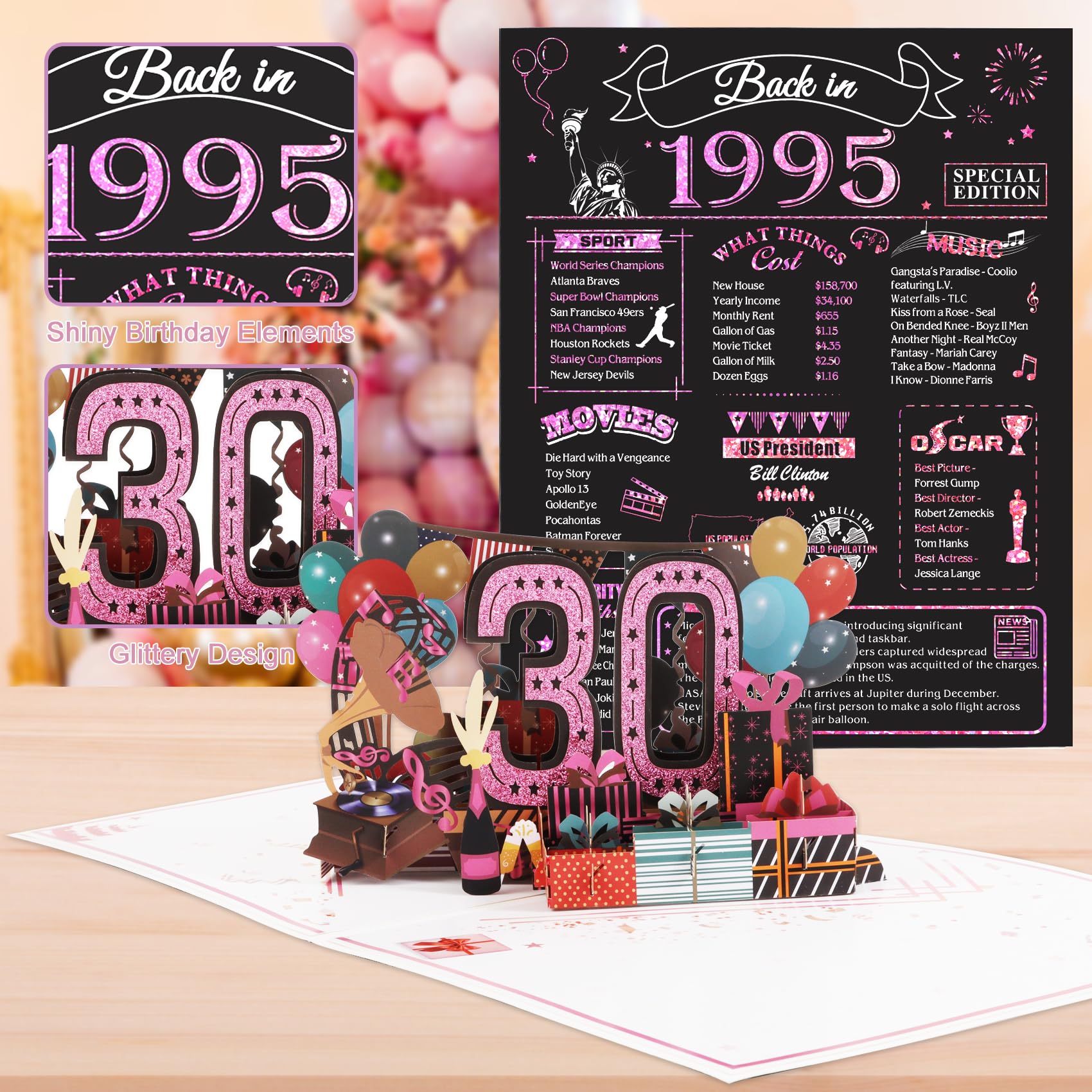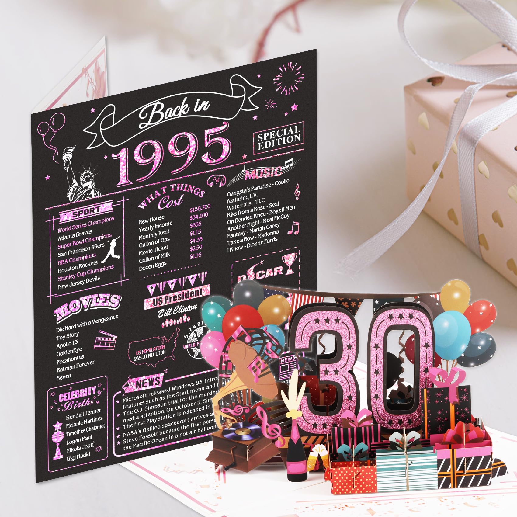 Happy 30th birthday 3D Greeting Card is a fun birthday gift to read with your elders and grandparents about fun things to do in 1995. Opening the greeting card pops up the number 30, decorated with balloons and gift boxes. Ideal creative gift for parties. Make your birthday or anniversary party decorations stand out