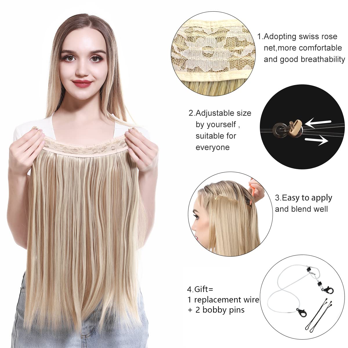★ Easy to Apply ★ Adjust the transparent wire to fit your head size, brush your natural hair, and apply the extension. It's that simple! For more details, check out our video or product descriptions below.