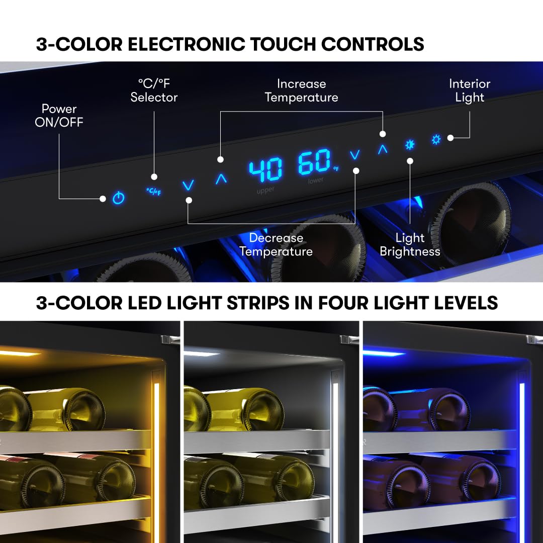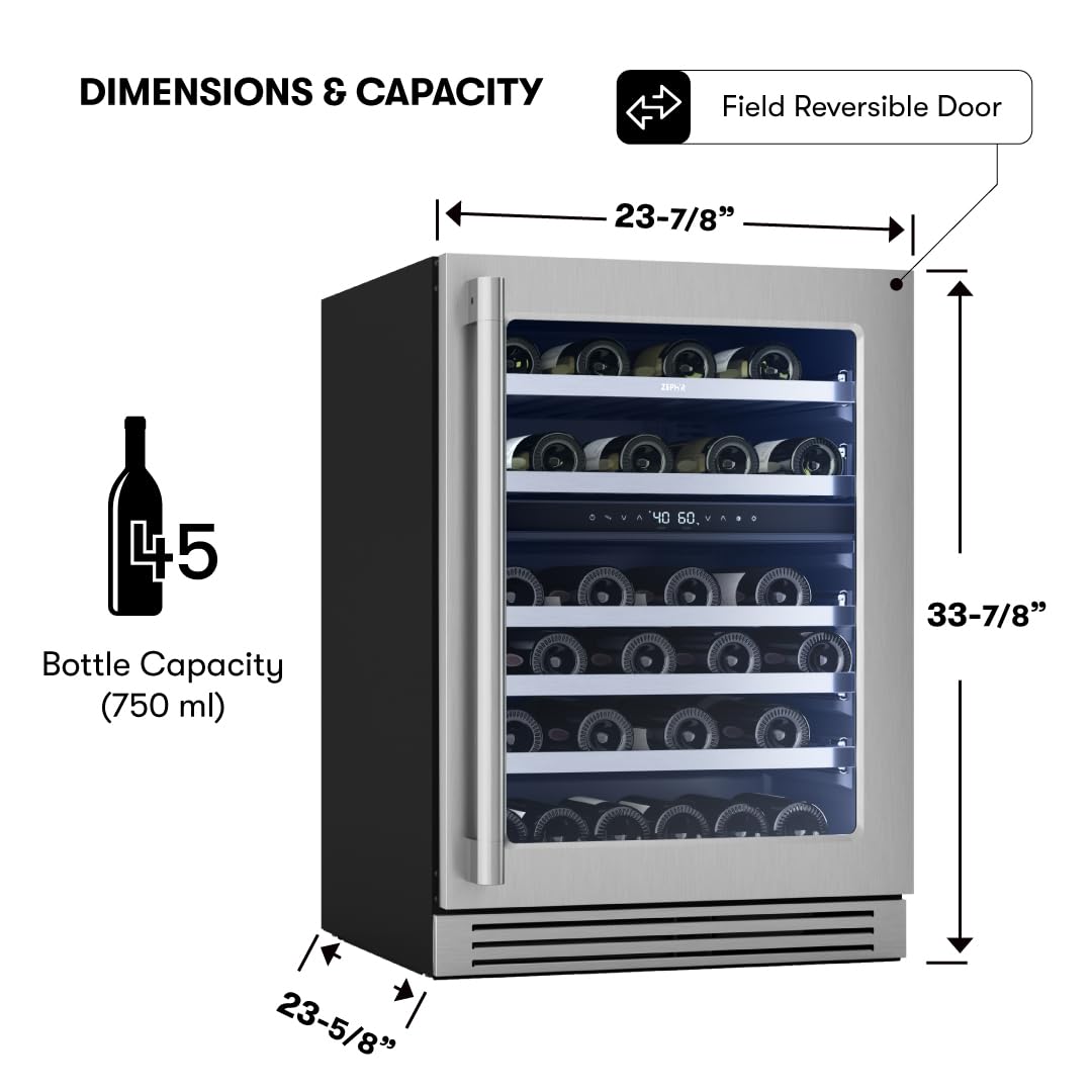 Bottle Capacity: 45 bottles (750 ml) / Carbon Filter Air Filtration/ Door Open Alarm/ Dual-Pane, Low-e Argon-Filled Glass