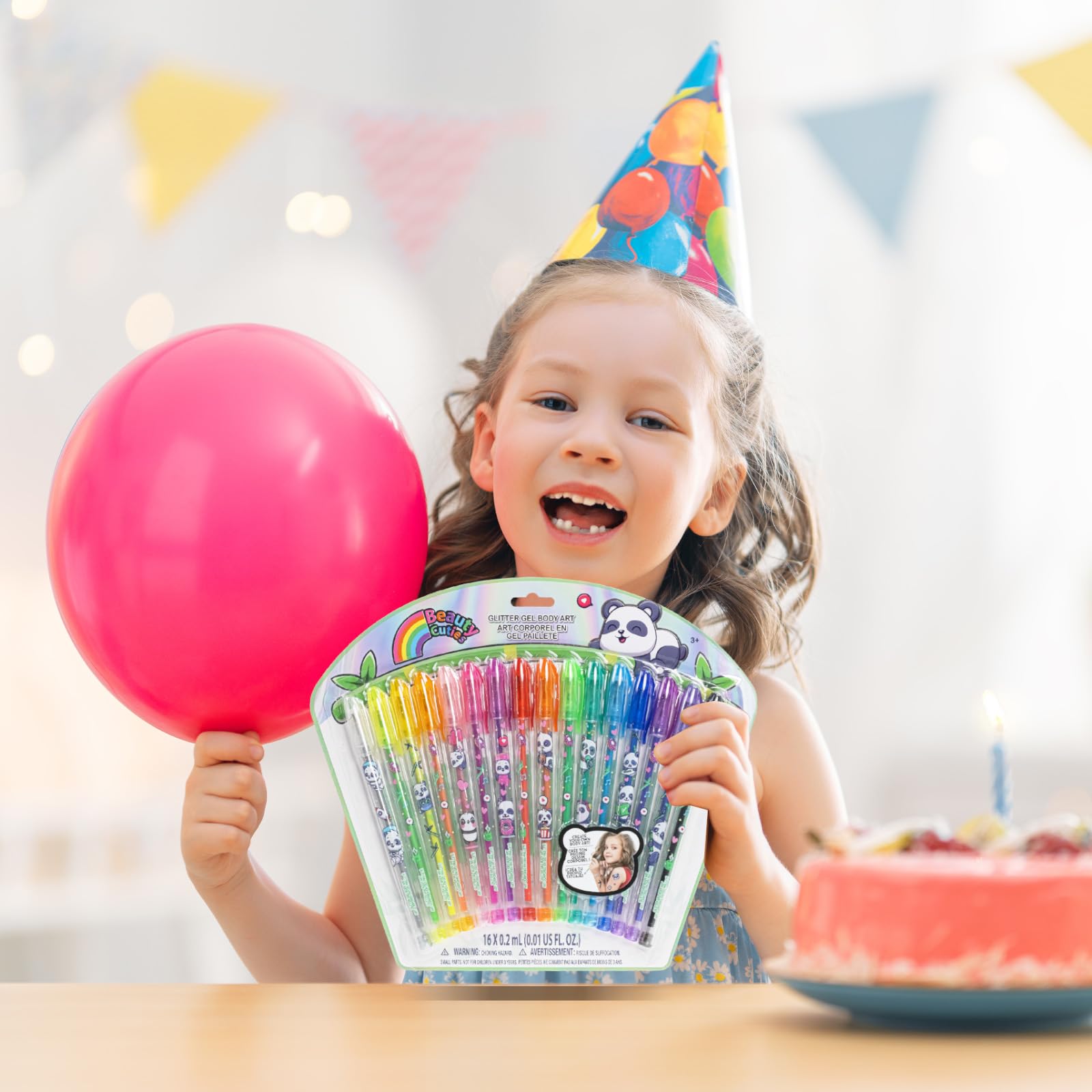 KIT INCLUDES: 16 glitter body gel pens. Colors include various shades of pink, green, blue, red, black, gold, silver, and more. All the colors your little one needs to create a work of art!