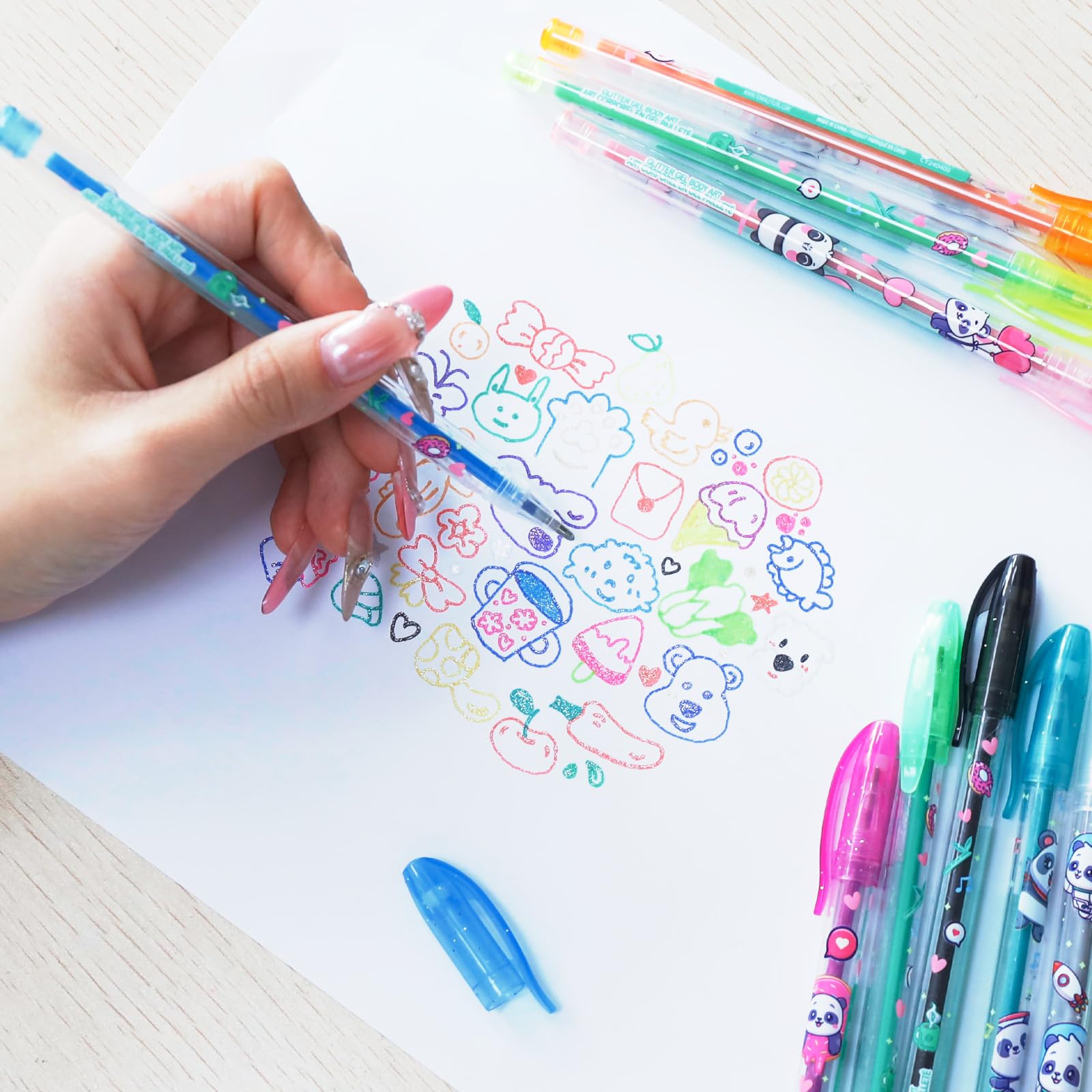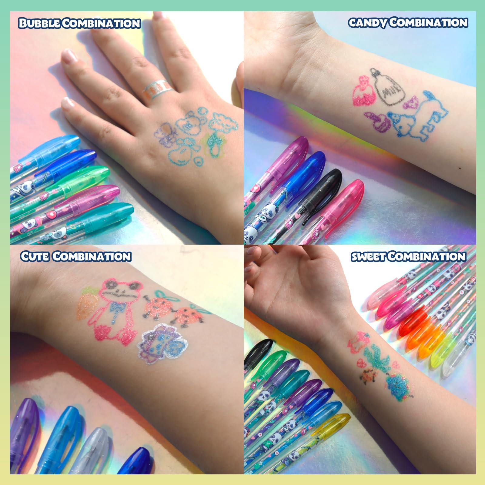 Panda-Themed Vibrant Colors: Our 16-pack of glitter gel pens not only offers an array of dazzling colors but does so with adorable panda-themed designs on each pen. Perfect for adding a sparkling touch to your everyday look. It can create fun and creative temporary body art, but can also be used to enhance artwork, journals, DIY projects, and more. These pens bring your creative ideas to life.