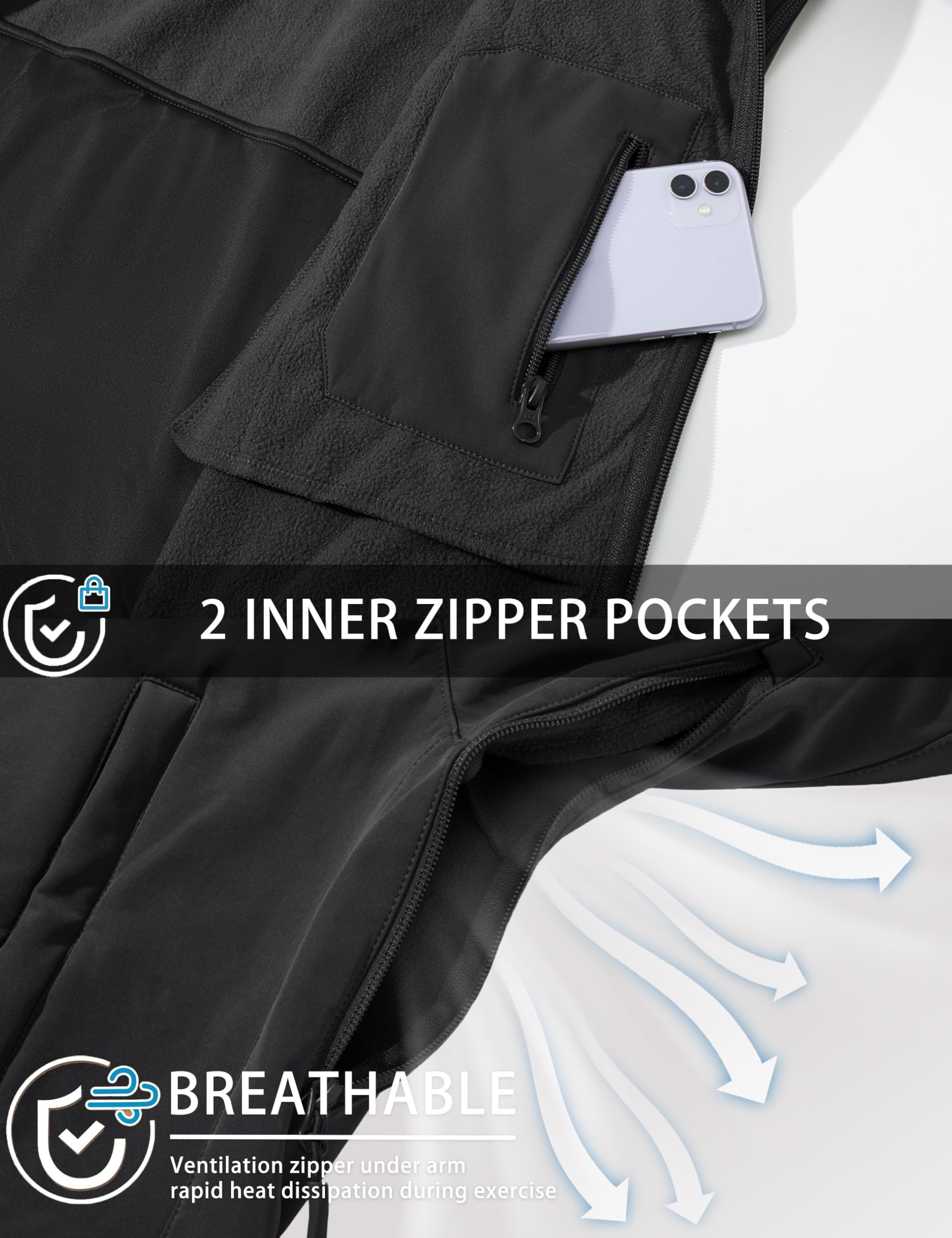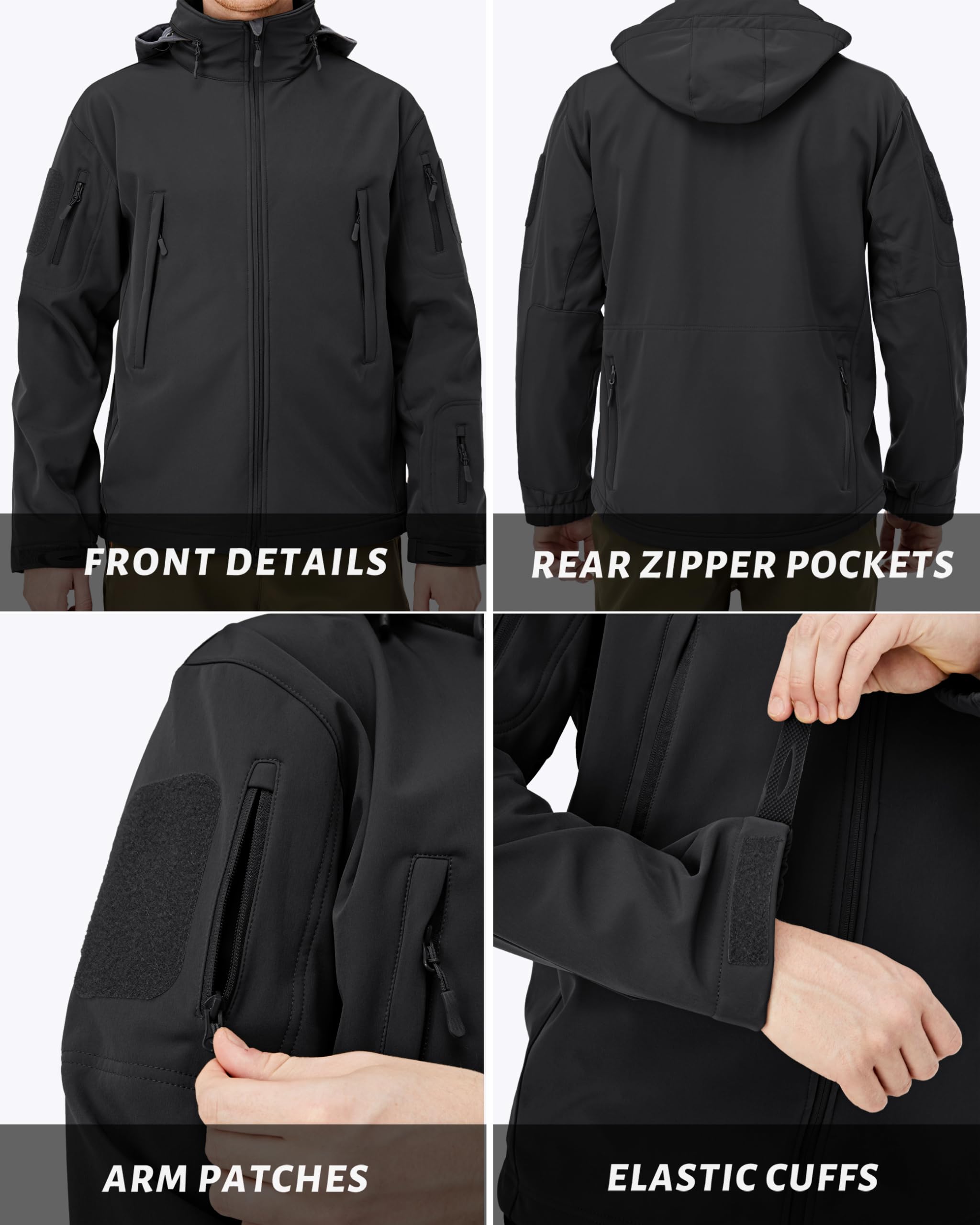 Design: 8 zipper pockets in all, 2 large front pockets, 3 small arm pockets, 1 large kangaroo pocket on the back, and 2 small pockets on the inside for different storage needs.4.5"X3.8" patch panels on each arm.elastic hook and loop wrist cuffs for adjustable fit.