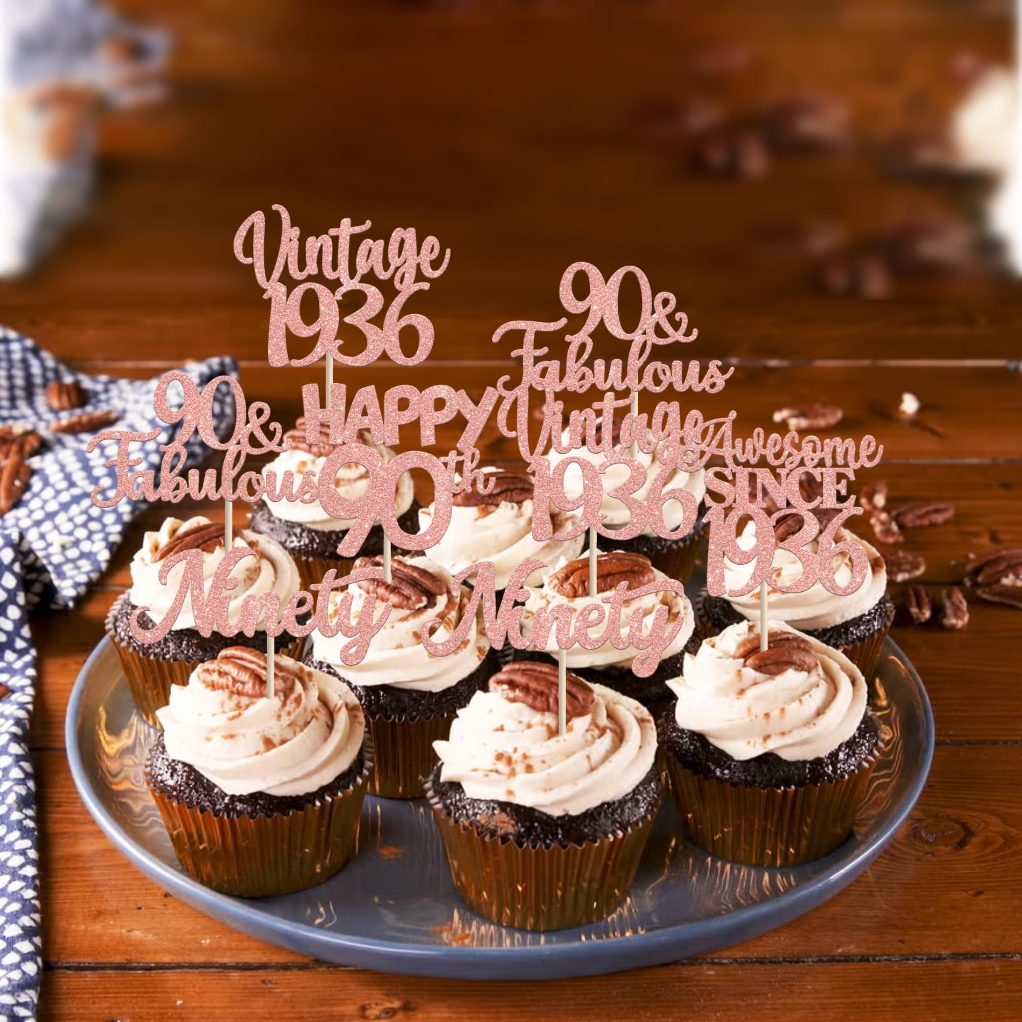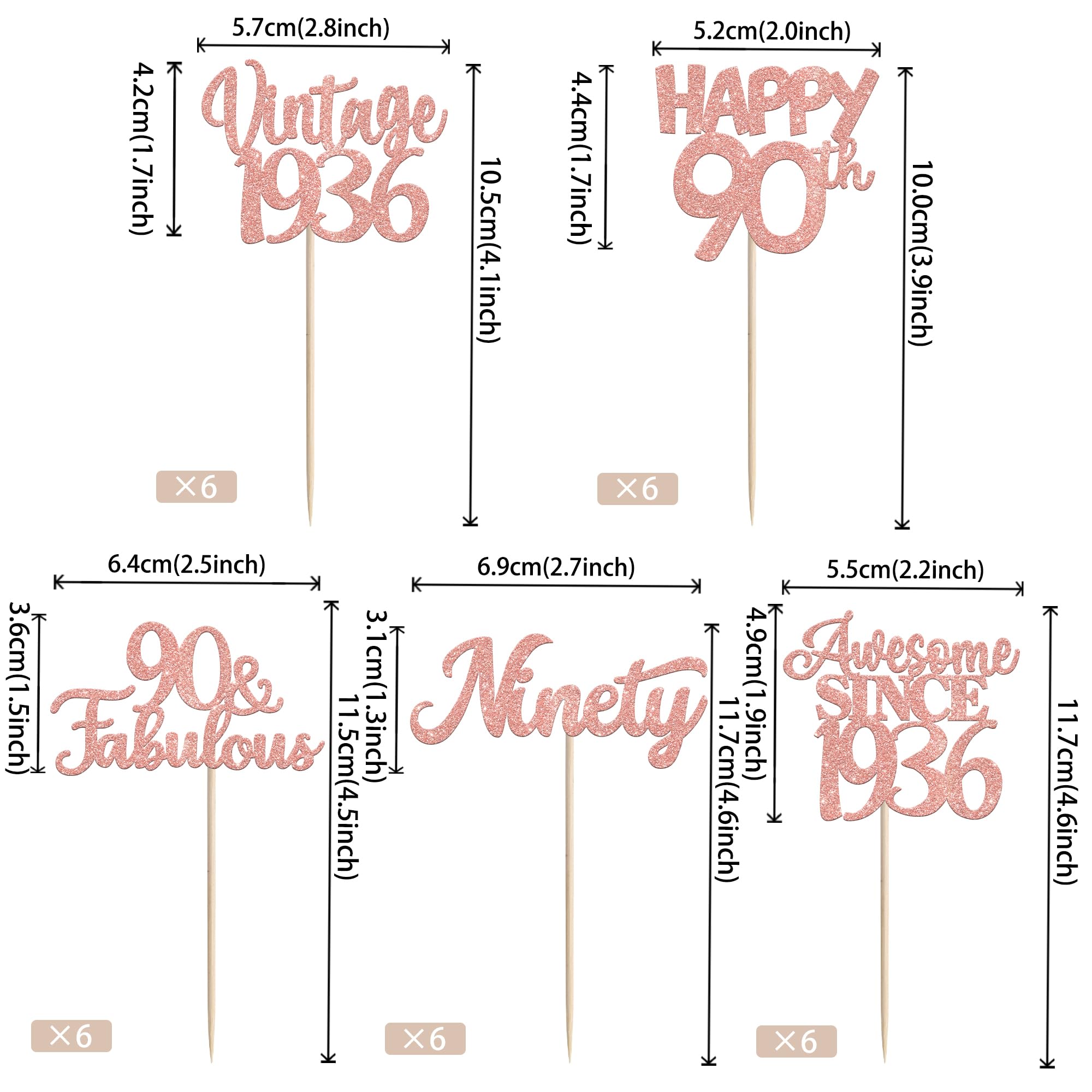 Vintage 1936 Happy 90th Birthday Party Cupcake Toppers Decoration Supplies Perfect for vintage 1936 theme party, 90th birthday theme party, 90th wedding anniversary theme party,cheers to 90 years theme party cupcake decorations supplies. Pack of 30 pcs,6 pcs of each design The size is 2.2*4.3/ 2.5*4.3/ 2*4.3/ 2.2*4.5/ 2.7*3.9 inch ( with stick ) Made of high quality paper card stock,thick and thick and sturdy. These cupcake toppers are single glitter, the back is white, and they are intended for decoration only, please do not put them in oven or microwave. If the item you received has any defects, please contact us immediately.we will deal with it within 24 hours.