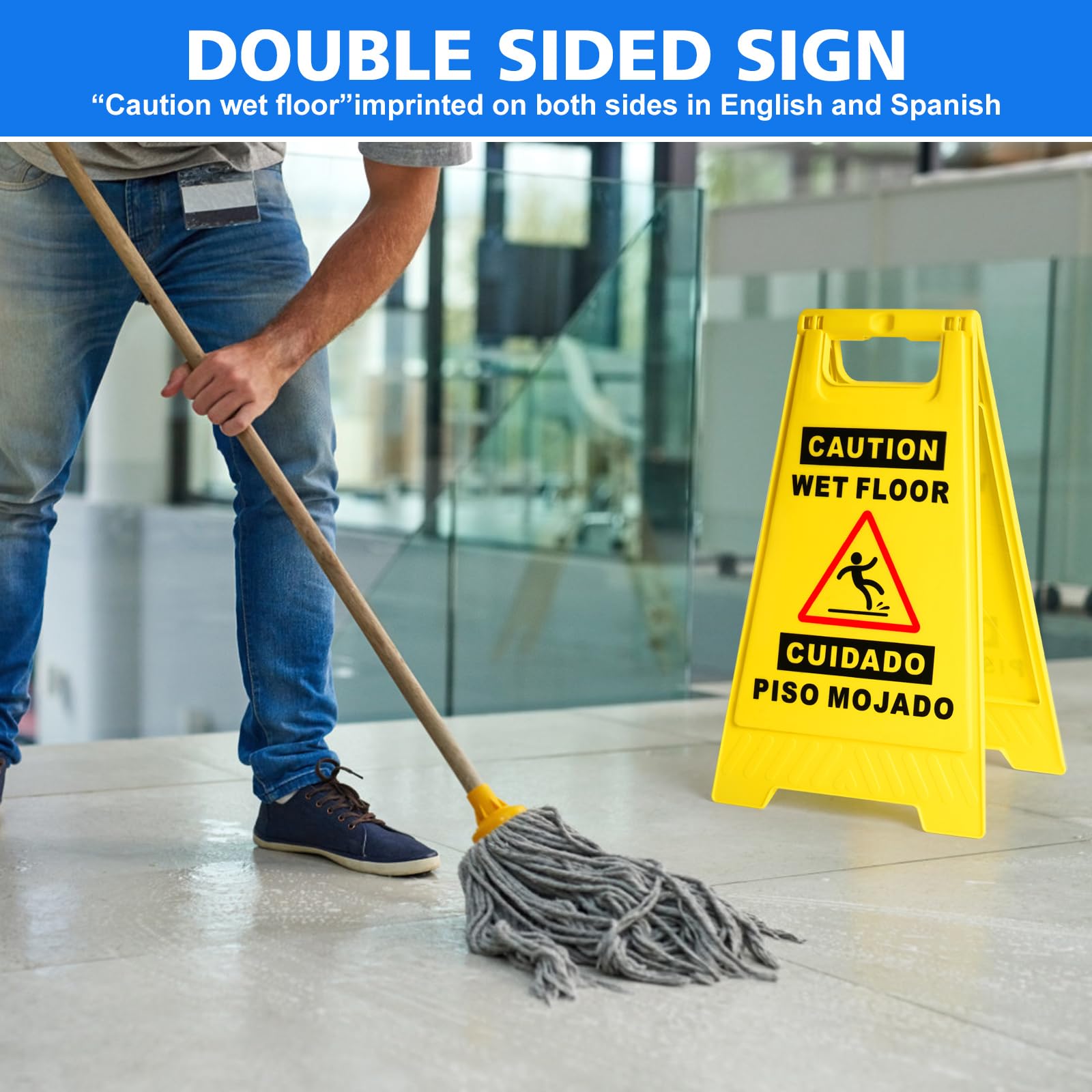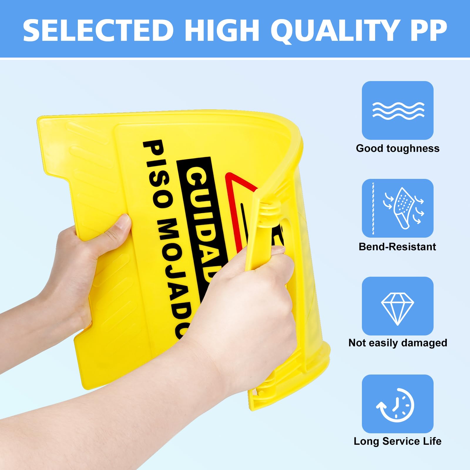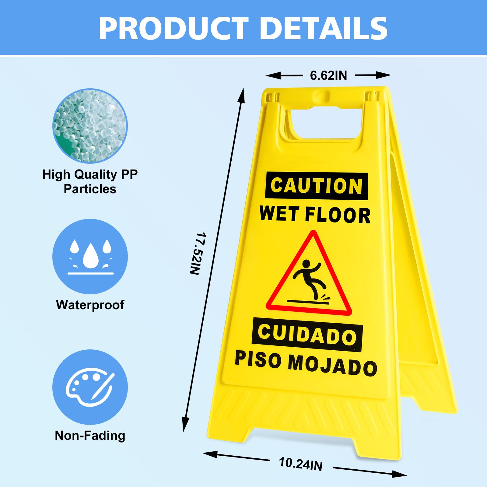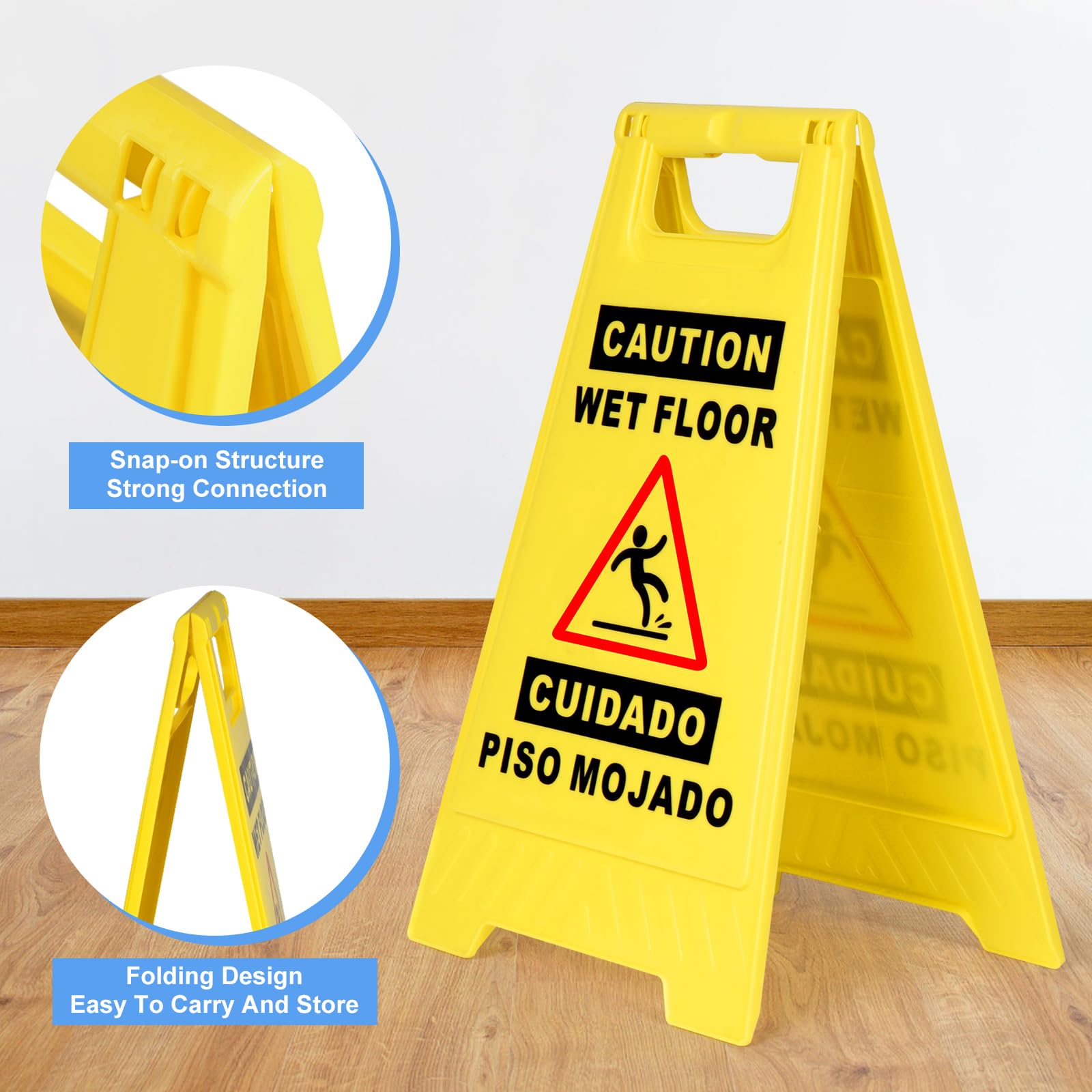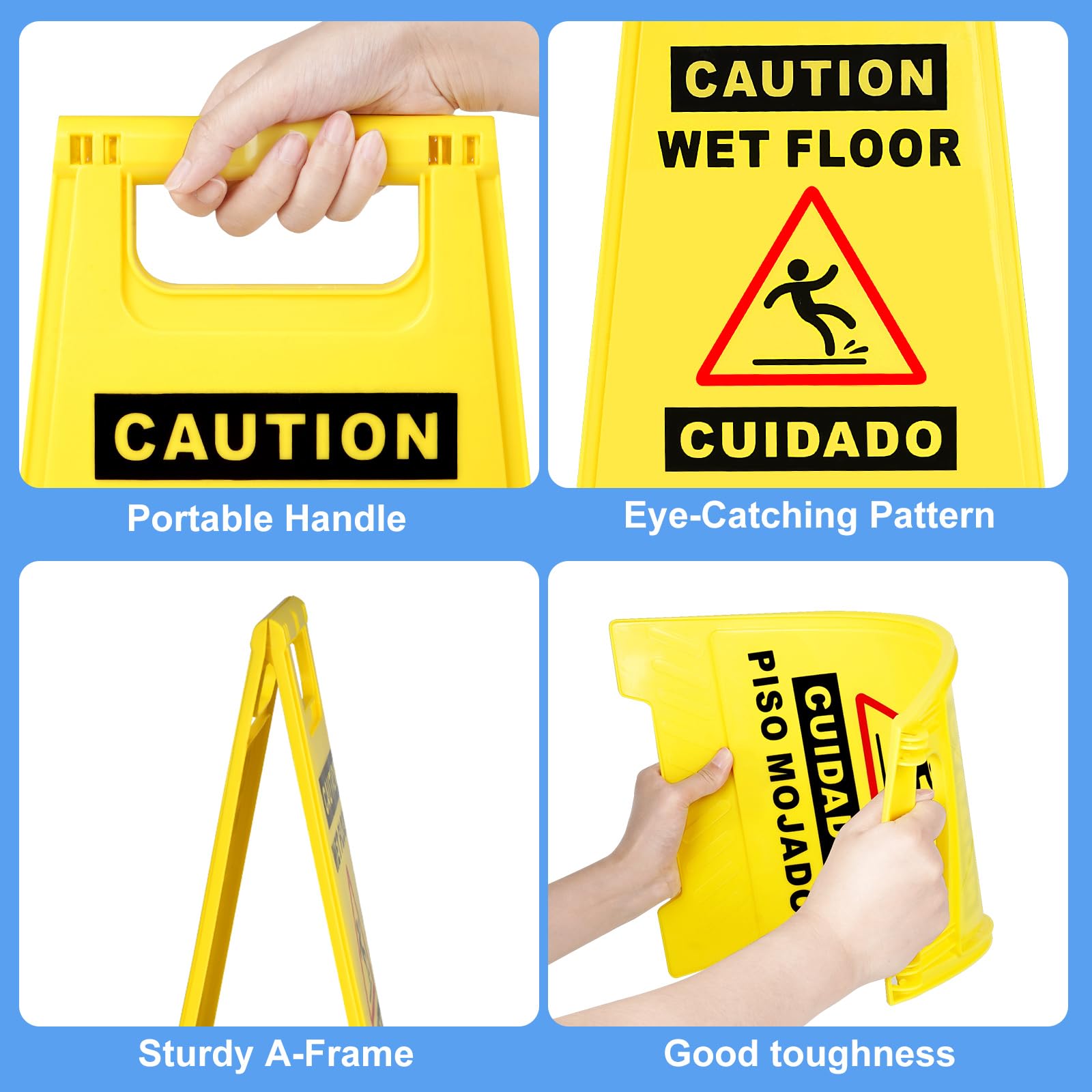 Double Sided Bilingual Sign:The wet floor sign is a double-sided visual design,with each side displaying "Caution Wet Floor" in English and Spanish. This simple sign can remind pedestrians to be safe and prevent slipping.