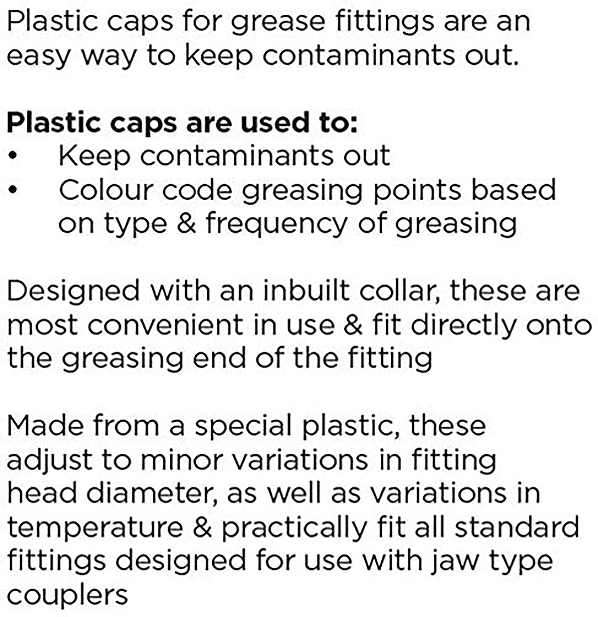 Made from special plastic, the caps adjust to minor variations in fitting head diameter; Fits onto all standard fittings designed for use with jaw type couplers