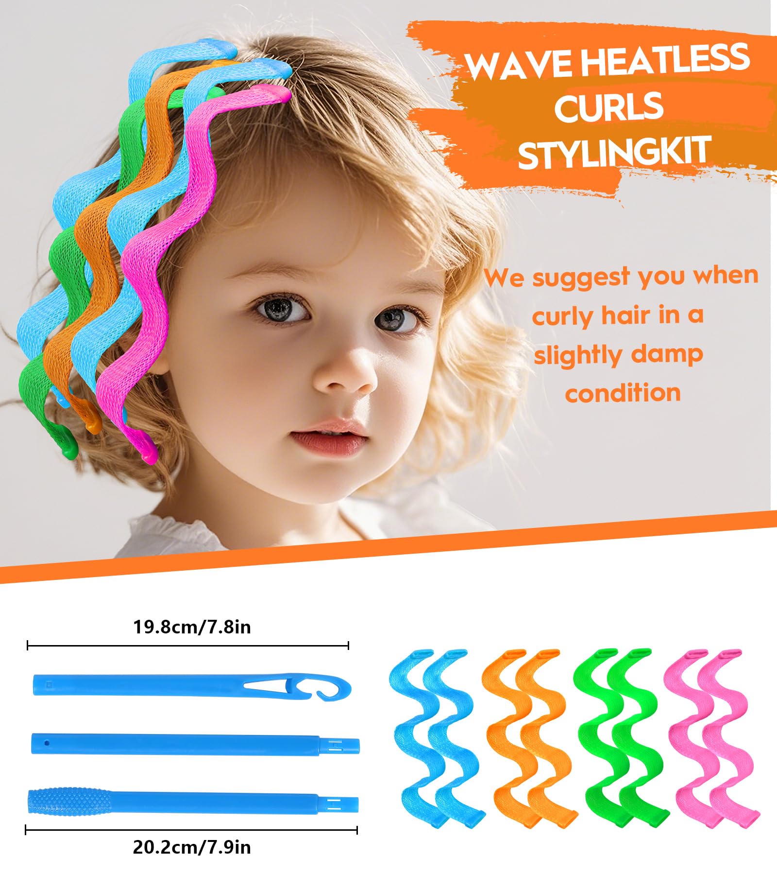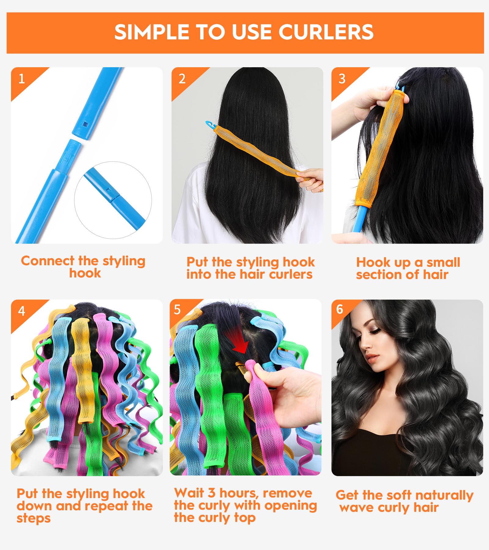 【Effortless To Apply】①When your hair is in a slightly damp condition curly the hair ② Hook through the magic curly, Insert small amounts of hair(suggest using small amounts to avoid the tangling part) , Open the top of the curly and pass the curly easily ③ Wait 3 hours until your hair is completely dry, ④Taking wavy curlers out is simple. Open the top of the curly, pull on the no heat curls and your hair will slide out. You're left with a beautiful wave and finger-combed hair, you have piles of beach waves.