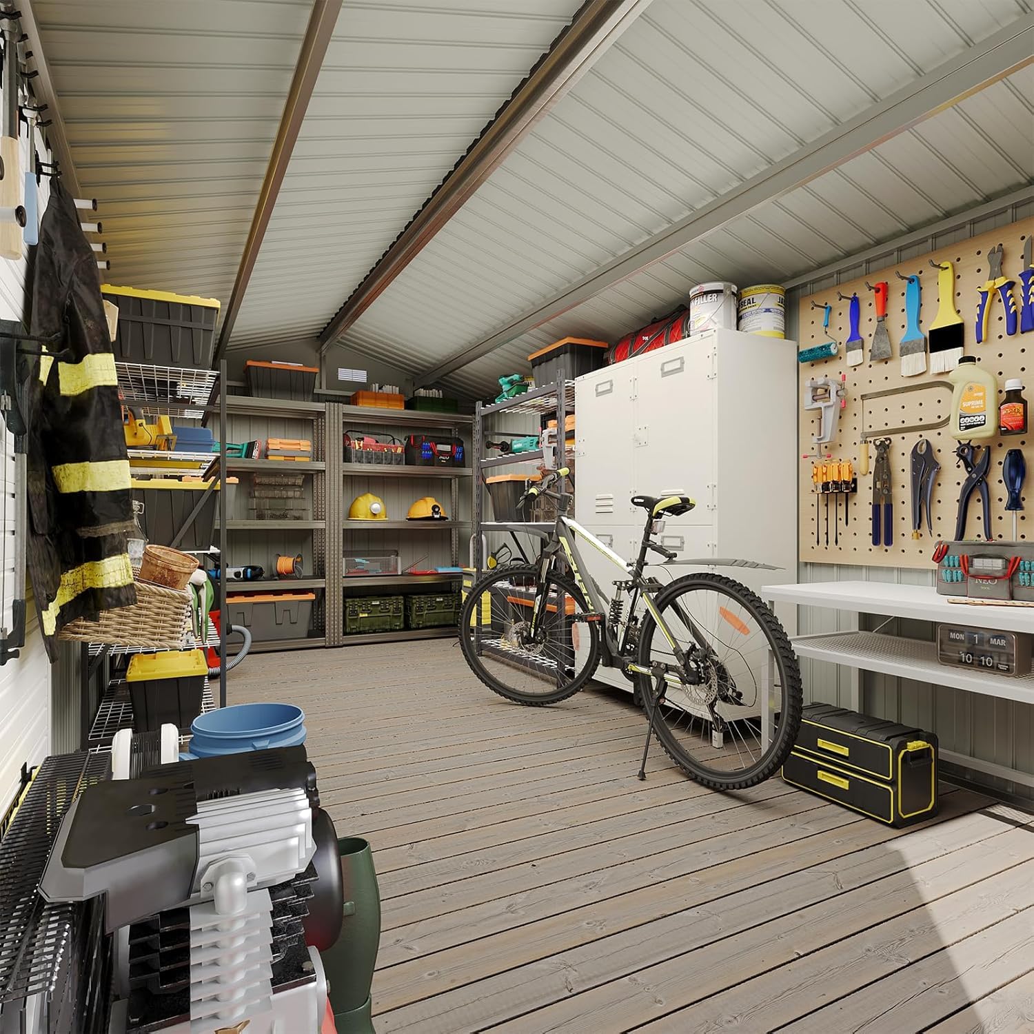 Ample Storage Space with Multiple Options: Measuring 10 x 12 FT, this outdoor storage shed provides generous space to meet all your outdoor storage demands. This durable metal garden shed is perfect for storing snow blowers, shovels, outdoor chairs, bicycles, and toy cars. For added organization, you can consider purchasing storage racks to neatly arrange items such as shovels, umbrellas, antennas, ladders, and more within this versatile storage solution.