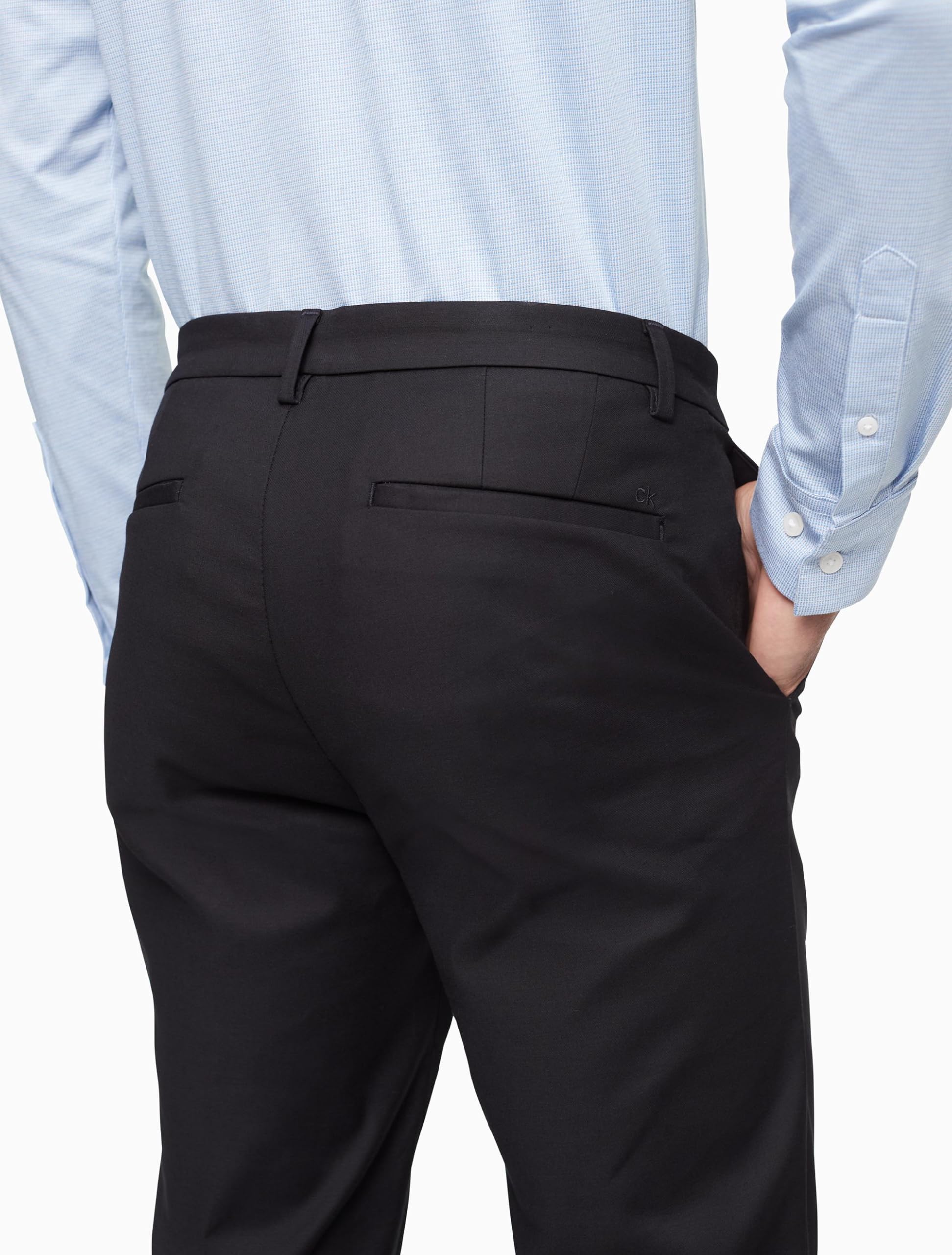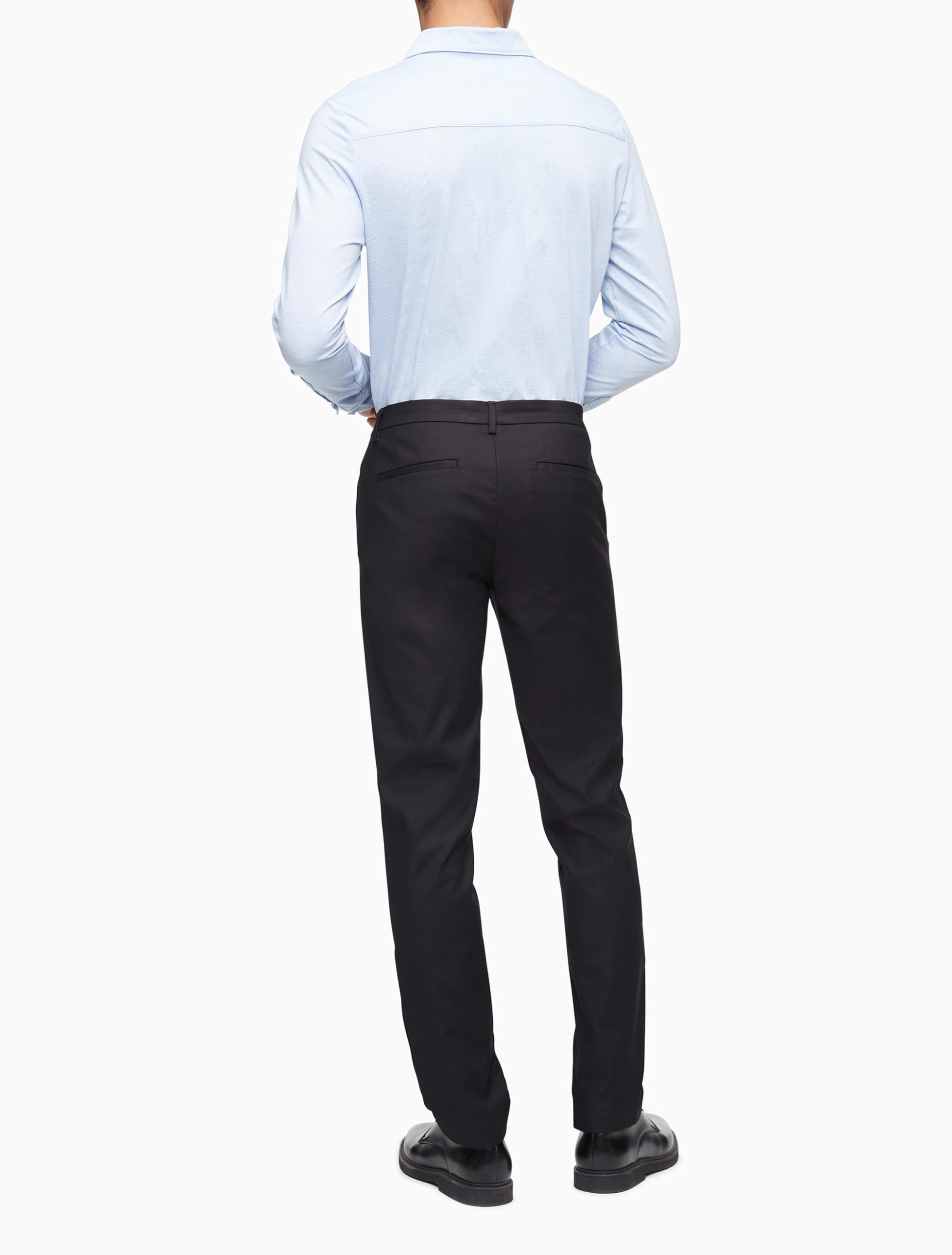 Description Featuring refined and modern styling, These Calvin Klein pants are crafted from an extra soft cotton stretch blend for all-day, polished comfort. Perfect for travelers with wrinkle resistant properties, these stylish chinos are detailed with an extended tab button closure, front slip pockets, back welt pockets, signature logo detailing and pair easily with everything from graphic logo t-shirts to tailored dress shirts.