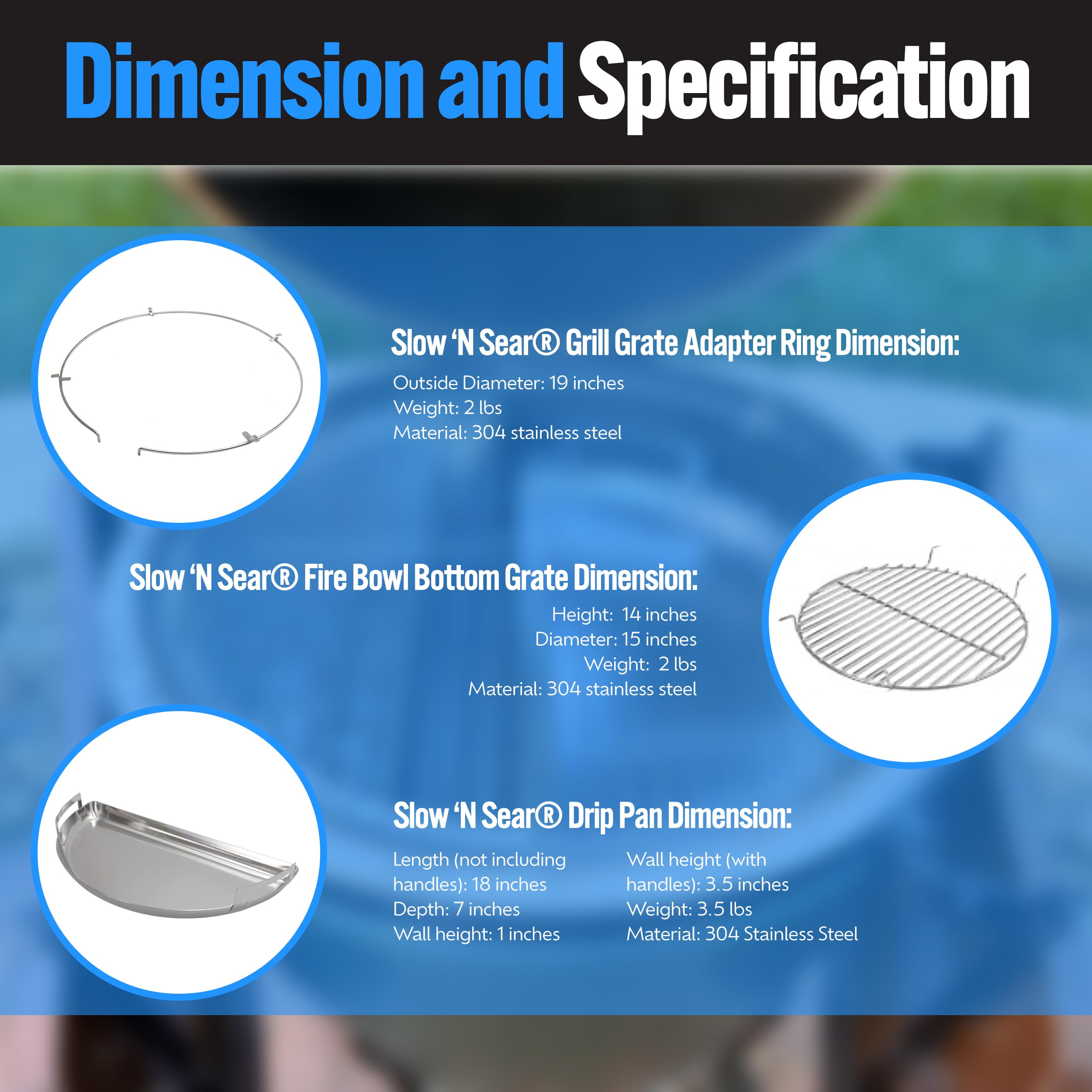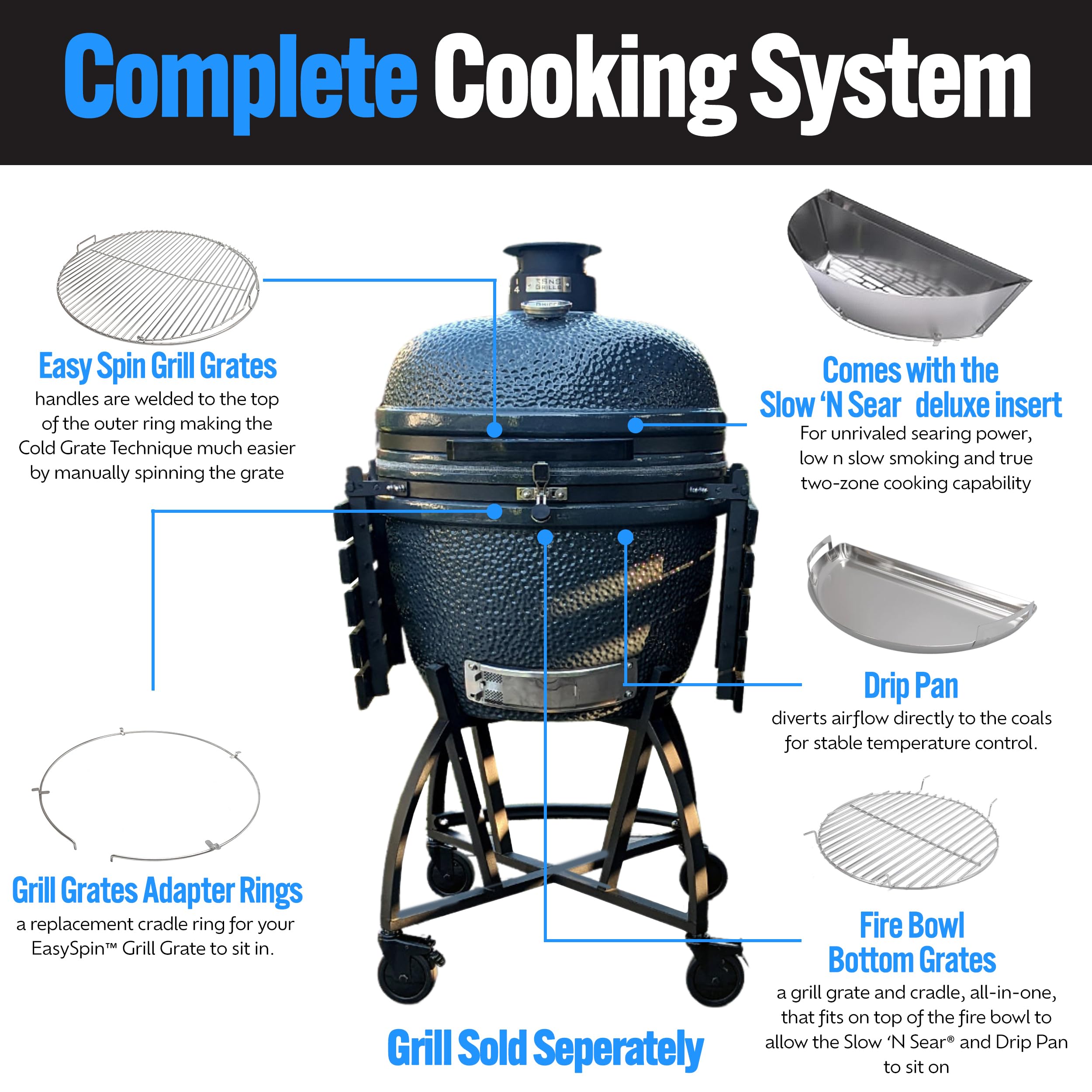 Complete Cooking System: This comprehensive set includes a Slow ‘N Sear Insert, EasySpin Grill Grates, Grill Grates Adapter Rings, Fire Bowl Bottom Grates, and our stainless steel Drip 'N Griddle Pan, all designed specifically for your Large Big Green Egg.