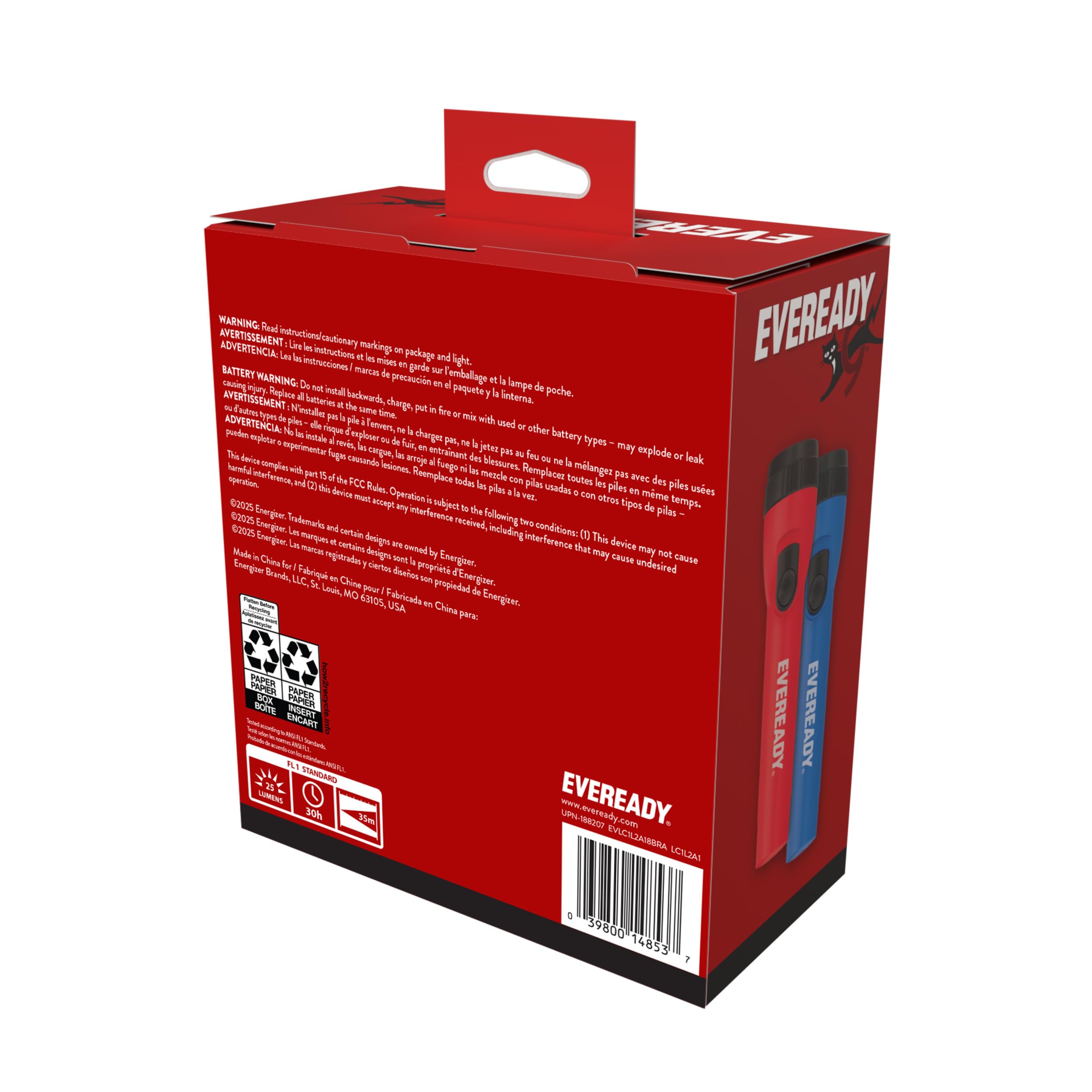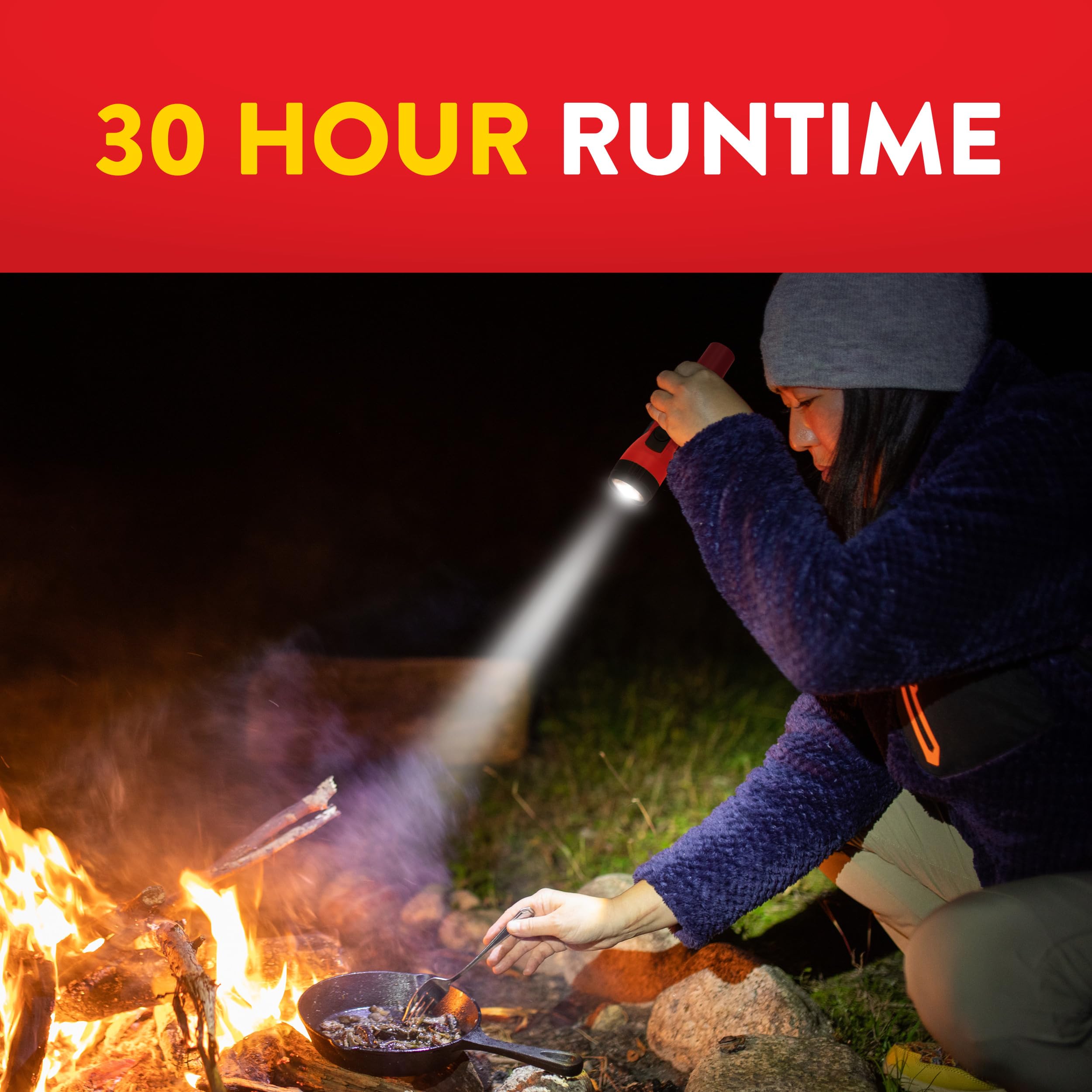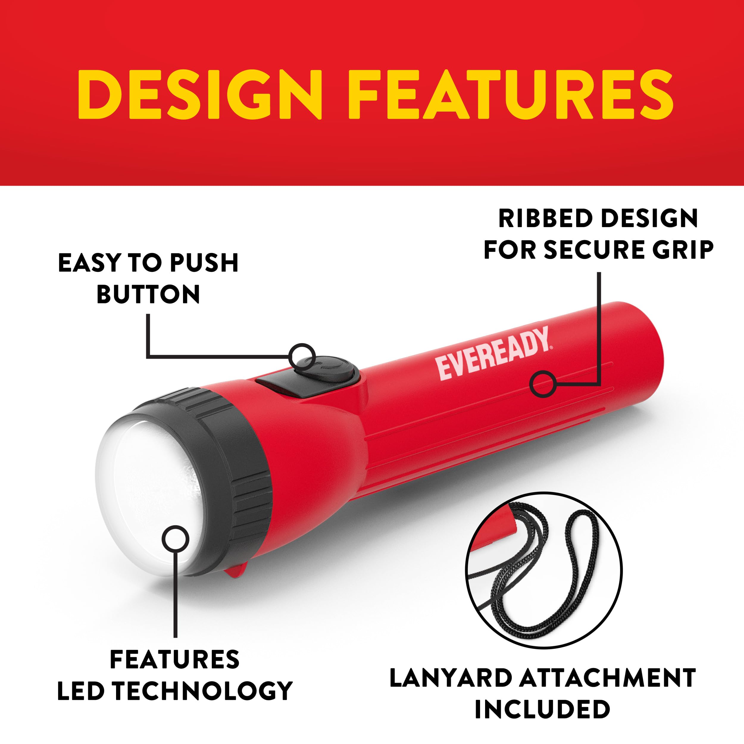 EVEREADY LED Flashlight offers bright LED technology in a long lasting handheld flashlight that's great for all uses. Keep this reliable LED light handy for power outages or general use when you need a little extra illumination. This EVEREADY flashlight shines up to 5X brighter than ordinary LED technology, and it shines on objects up to 35 meters away for a bright option. With 30 hours of runtime powered by two AA batteries, this handheld light gives you an extra-long runtime for reliable use as an indoor or outdoor light. The ribbed design creates a non-slip grip that helps you keep a hand on this bright LED flashlight. Use the convenient push-button switch to control this long lasting flashlight. Always trusted. Always ready.