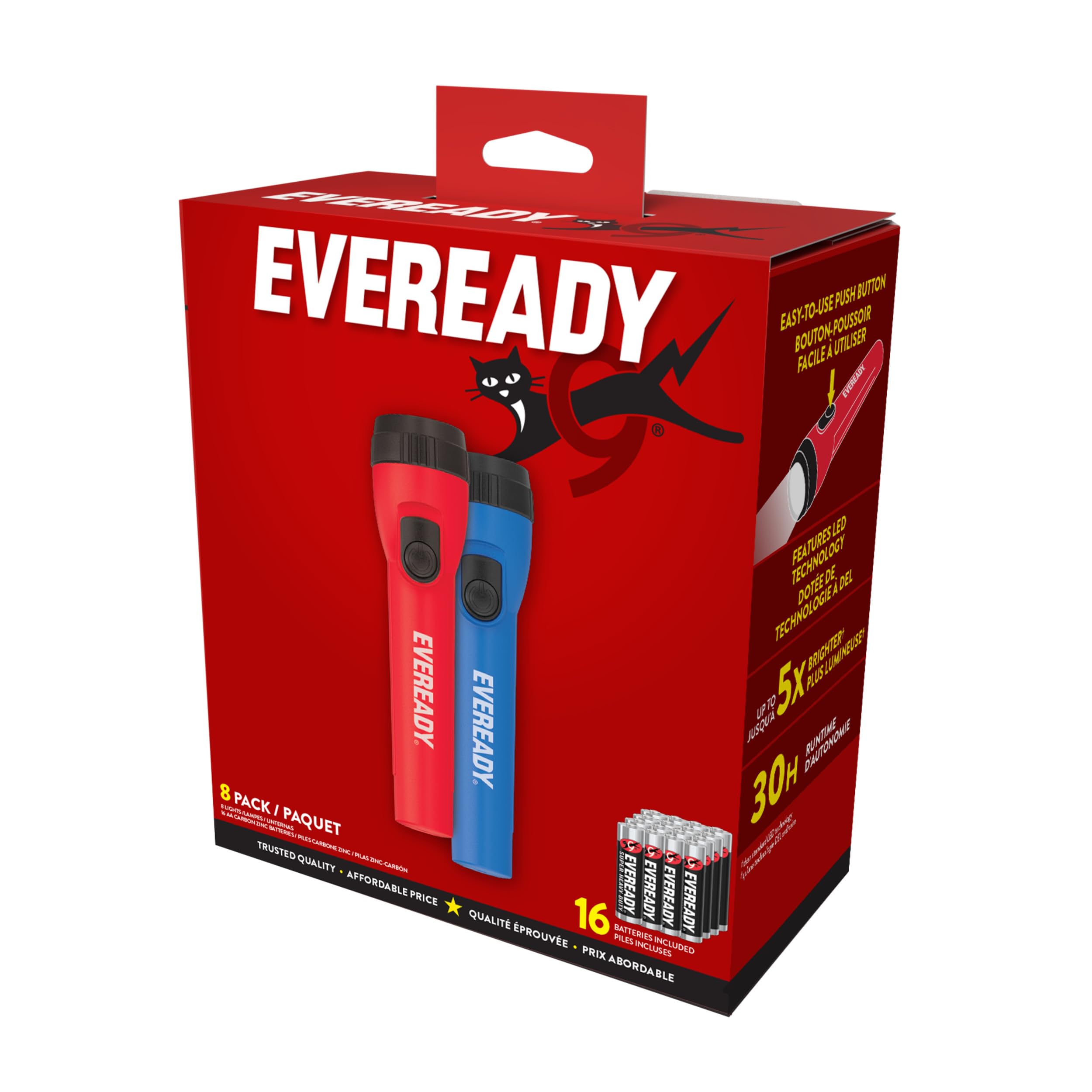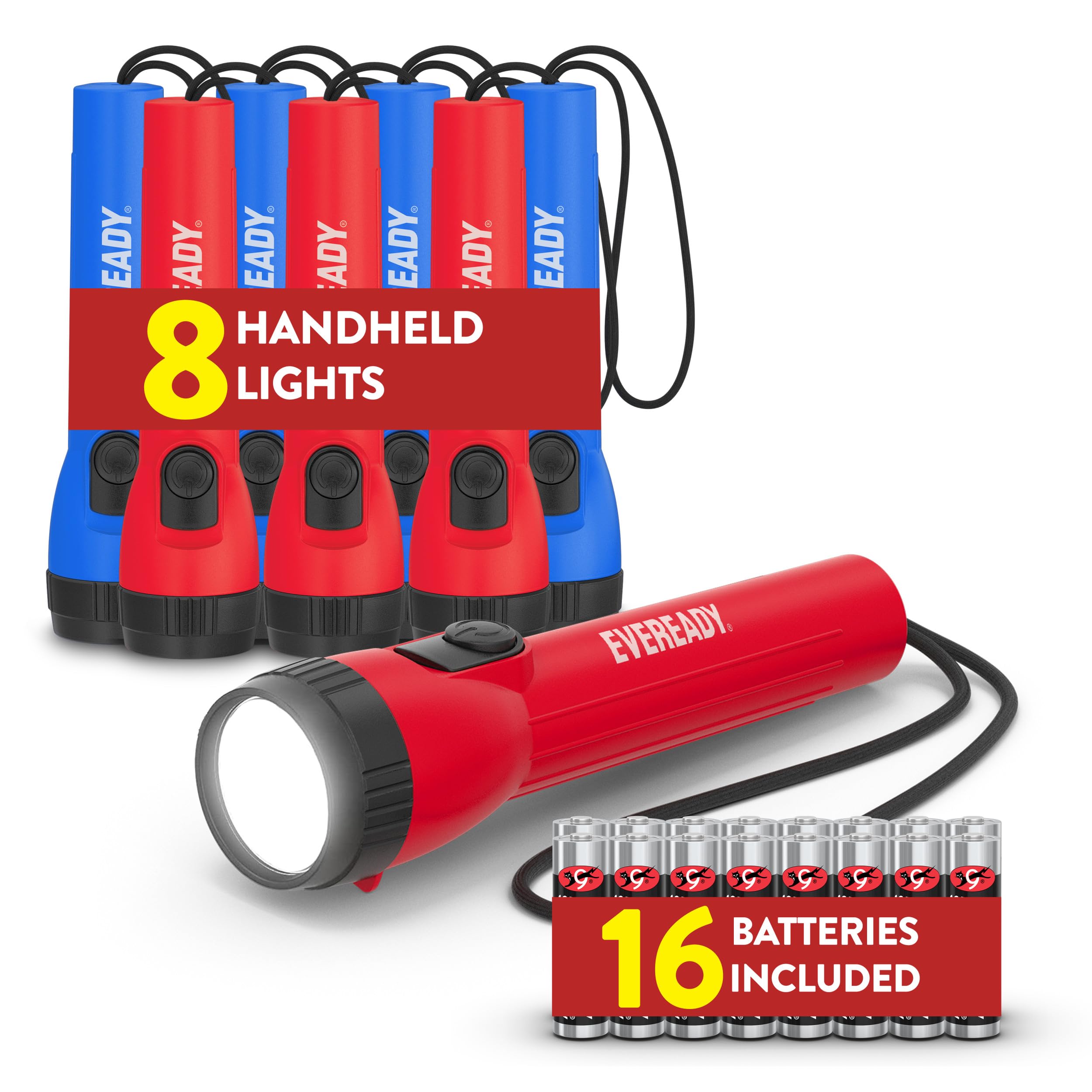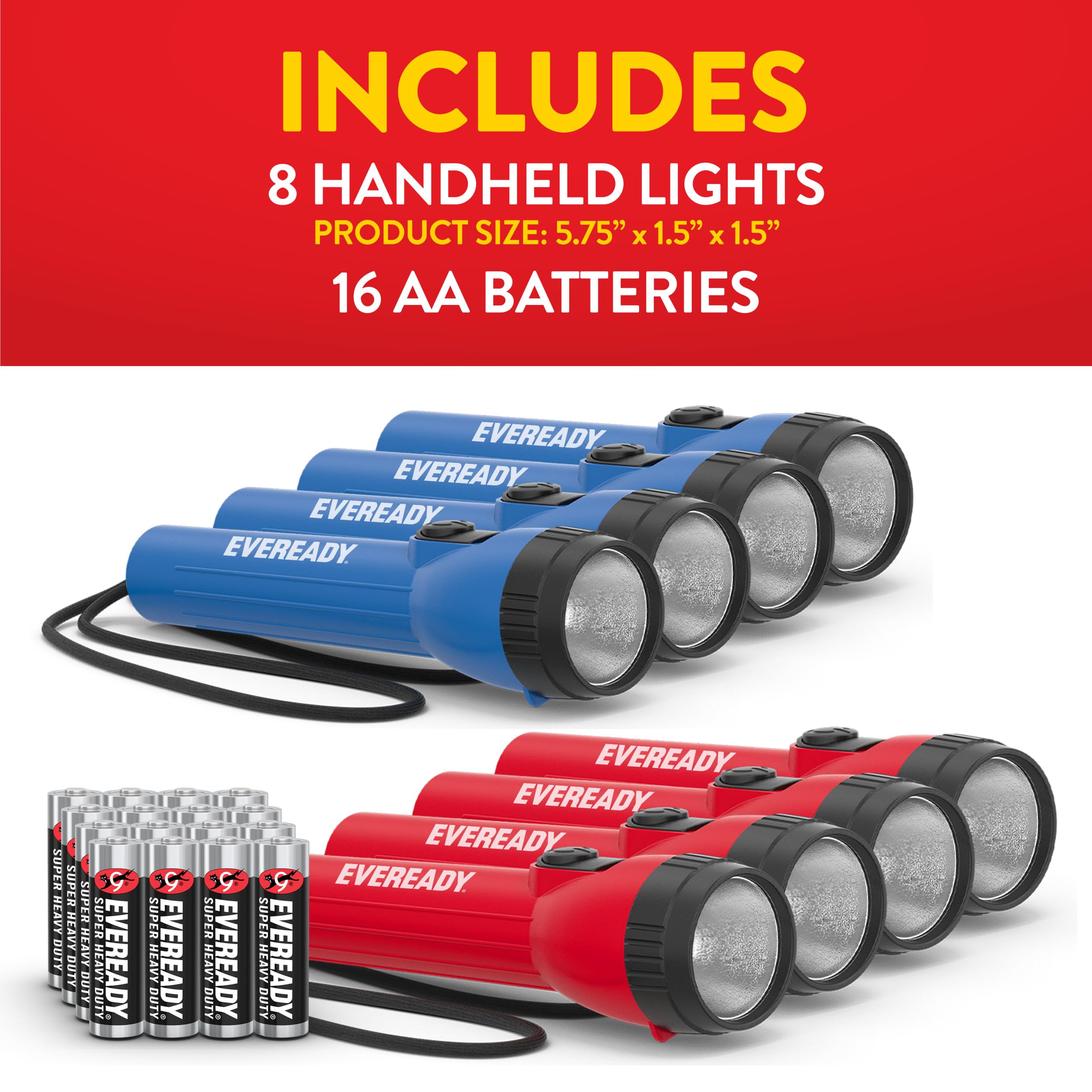 [EMERGENCY FLASHLIGHT]: Prepare for power outages with eight (8) long-lasting EVEREADY LED Flashlights. Includes sixteen (16) AA batteries