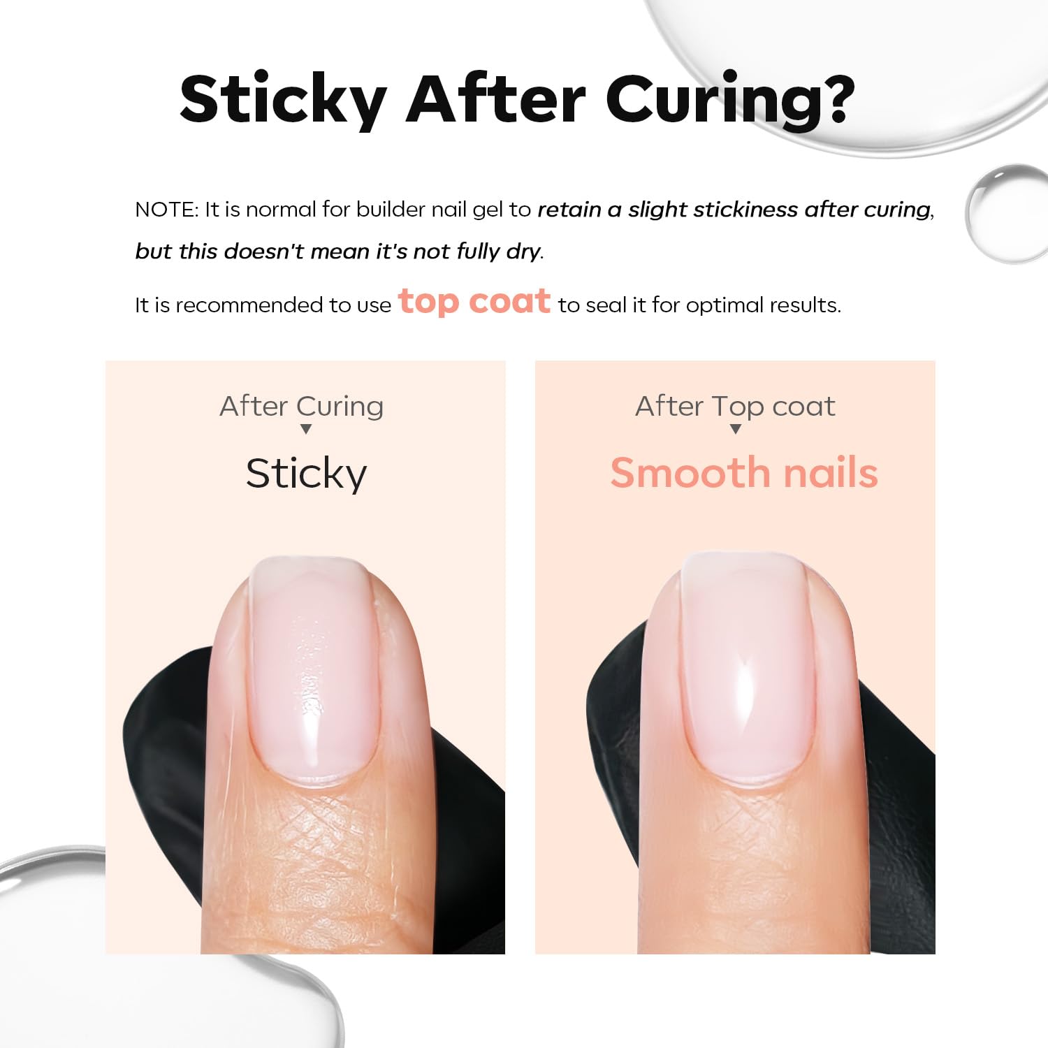 Quick & Easy Application: High self-leveling formula along with built-in brush makes it easy to spread, help you create length, thickness or add strength to the nail you want, and ensure a smooth and natural nail foundation layer with impeccable shine. NOTE: It is normal for builder nail gel to remain a little sticky after curing, which will make a better adhesion between nails and gel layers. It is recommended to use top coat to seal it