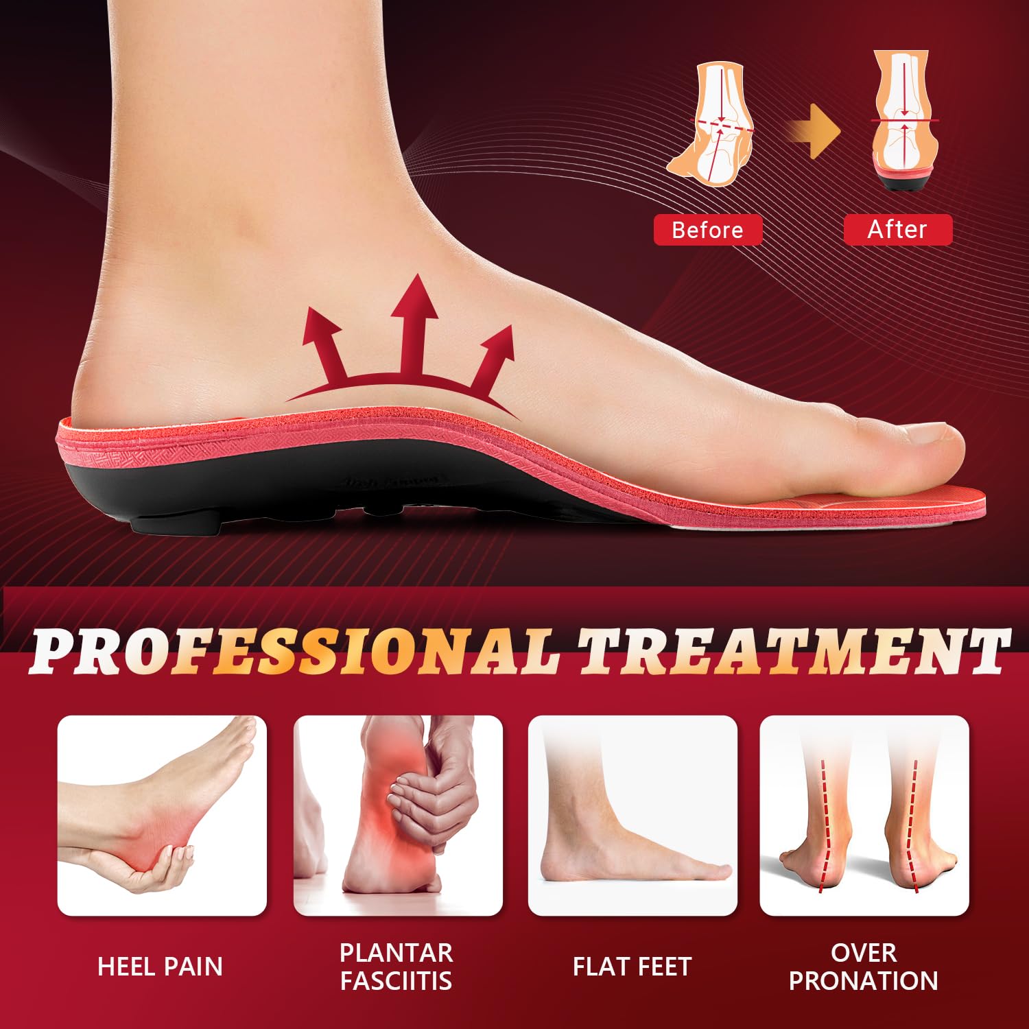【SUITABLE FOR MOST SHOE TYPES】This heavy duty support orthotic insole is suitable for most shoe types, such as sports shoes, running shoes, basketball shoes, hiking shoes, etc. Attention: When using this insole, it is necessary to remove the original insole from the shoe before placing it in our insole.