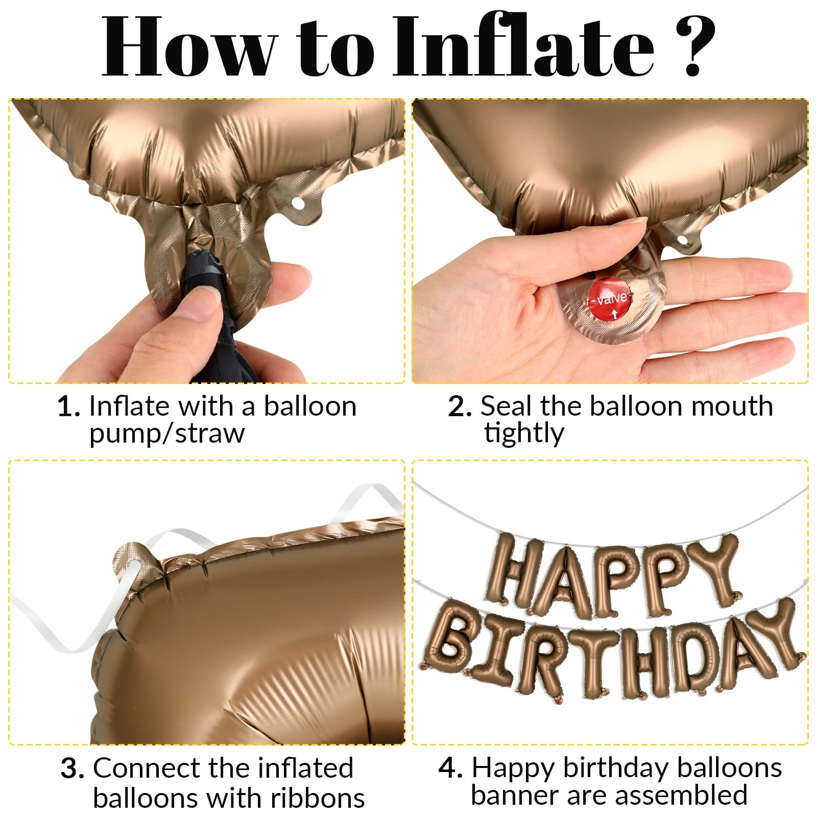 Easy to Assemble: Easy to inflate and assemble. You can inflate the balloons with balloon pump/straw. Just tape it or use the ribbon to hang the happy birthday banner on the wall, window, balloons arch, party decoration background etc.