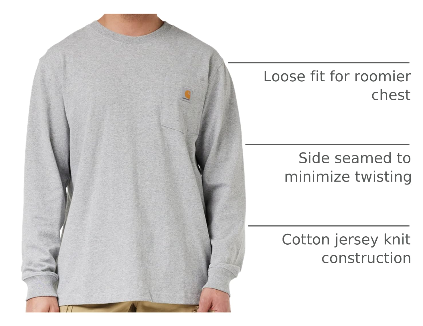 Description Product Description Heavyweight, durable and casual. Holds up when you put it through the ringer day after day. From the Manufacturer Made of 6.75-ounce, 100% cotton jersey our long sleeve pocket t-shirt makes for perfect workwear layered or worn alone. It features a crew neck with a generous left chest pocket and side-seamed construction to minimize twisting. Ash fiber content is 99%/1% polyester. Heather gray fiber content is 90% cotton/10% polyester.