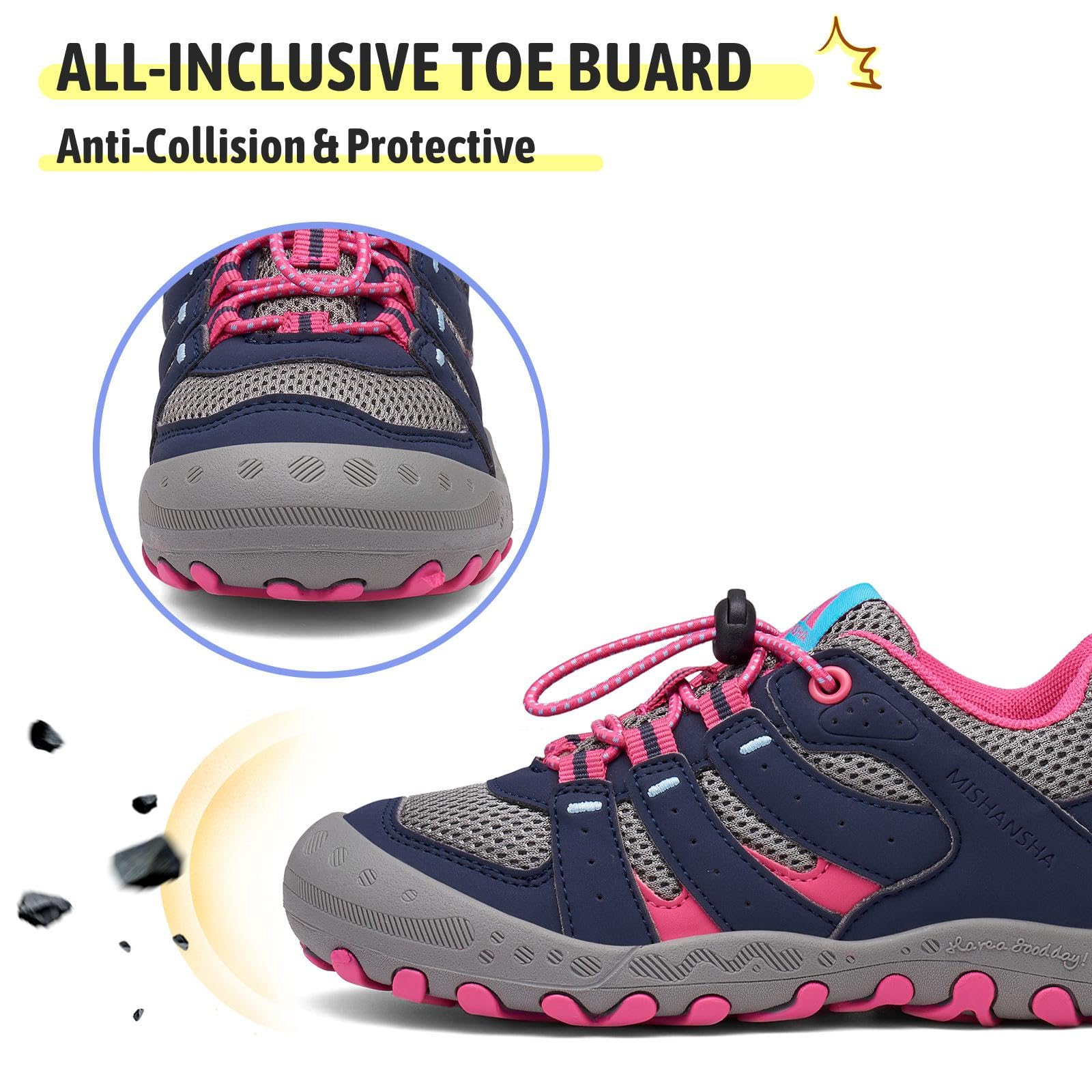 Protective Toe Design: Girls hiking shoes are designed with a reinforced anti-collision toe cap, protection against rocks, roots, and other obstacles. This feature of boys hiking shoes ensures that kid can move confidently without worrying about injuries, making them ideal for outdoor adventures
