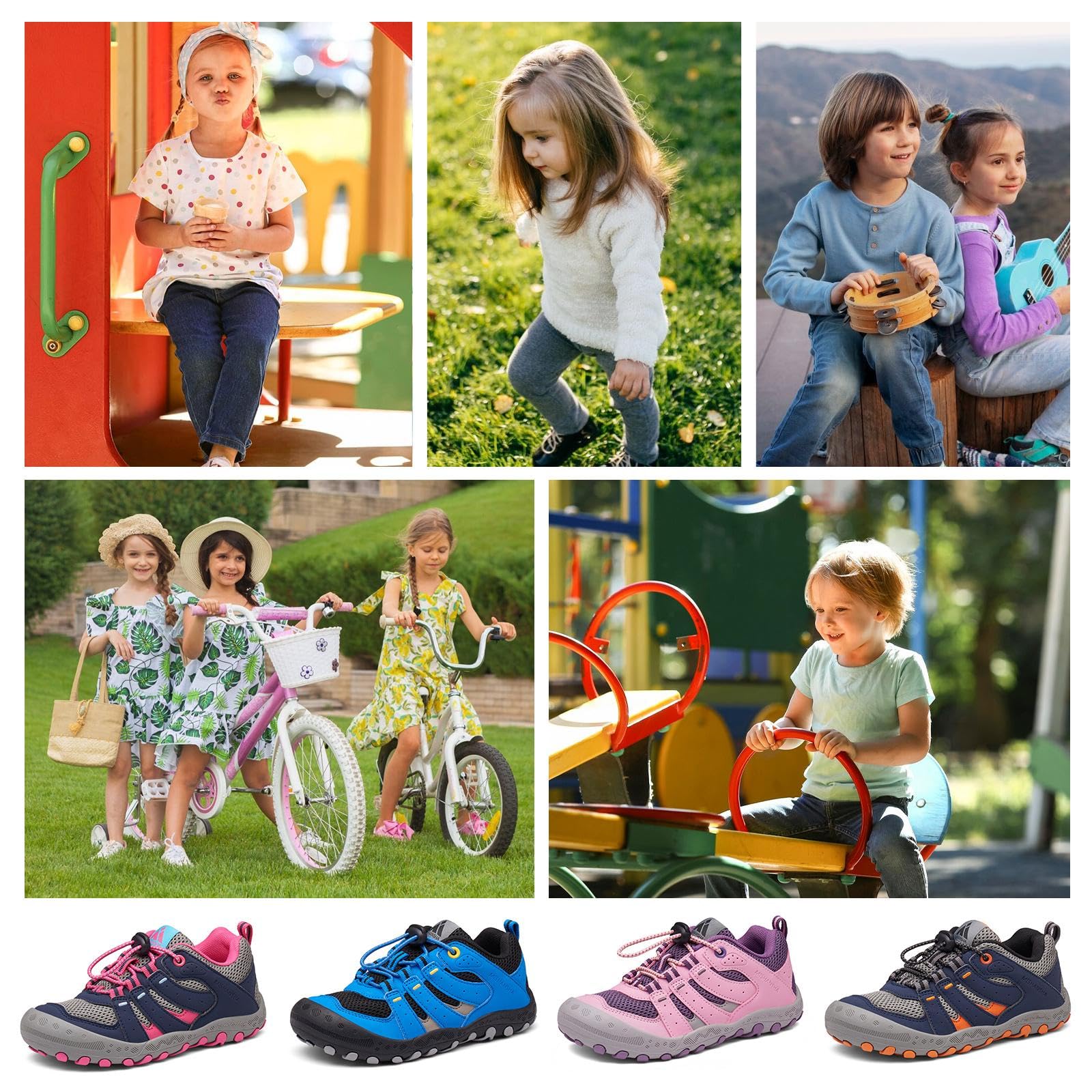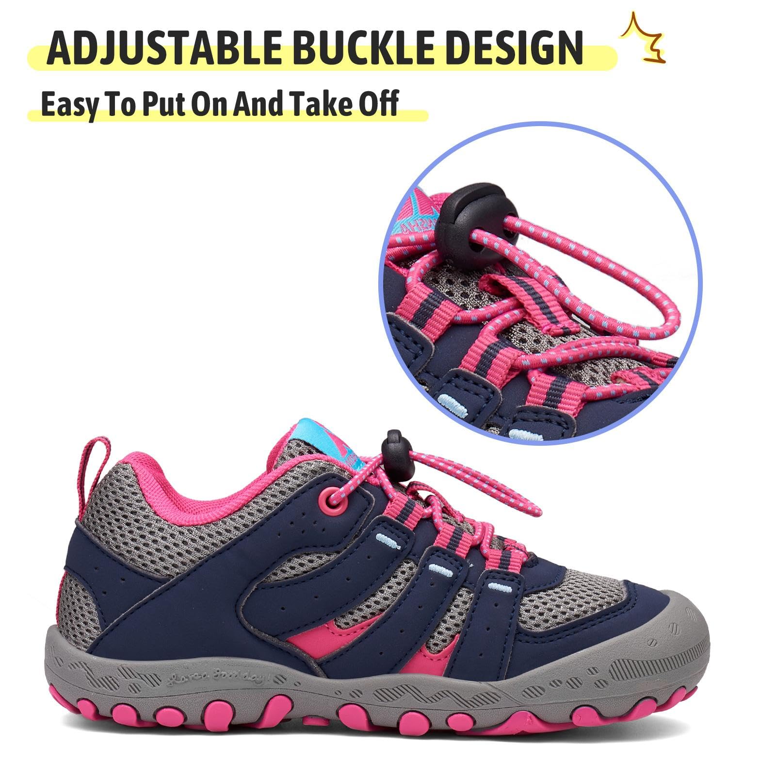 Adjustable Closure: Toddler hiking shoes are featuring adjustable buckle closure make it easy for kids to put on or take off by themselves and keeps the kids hiking sneakers snugly in place during activities