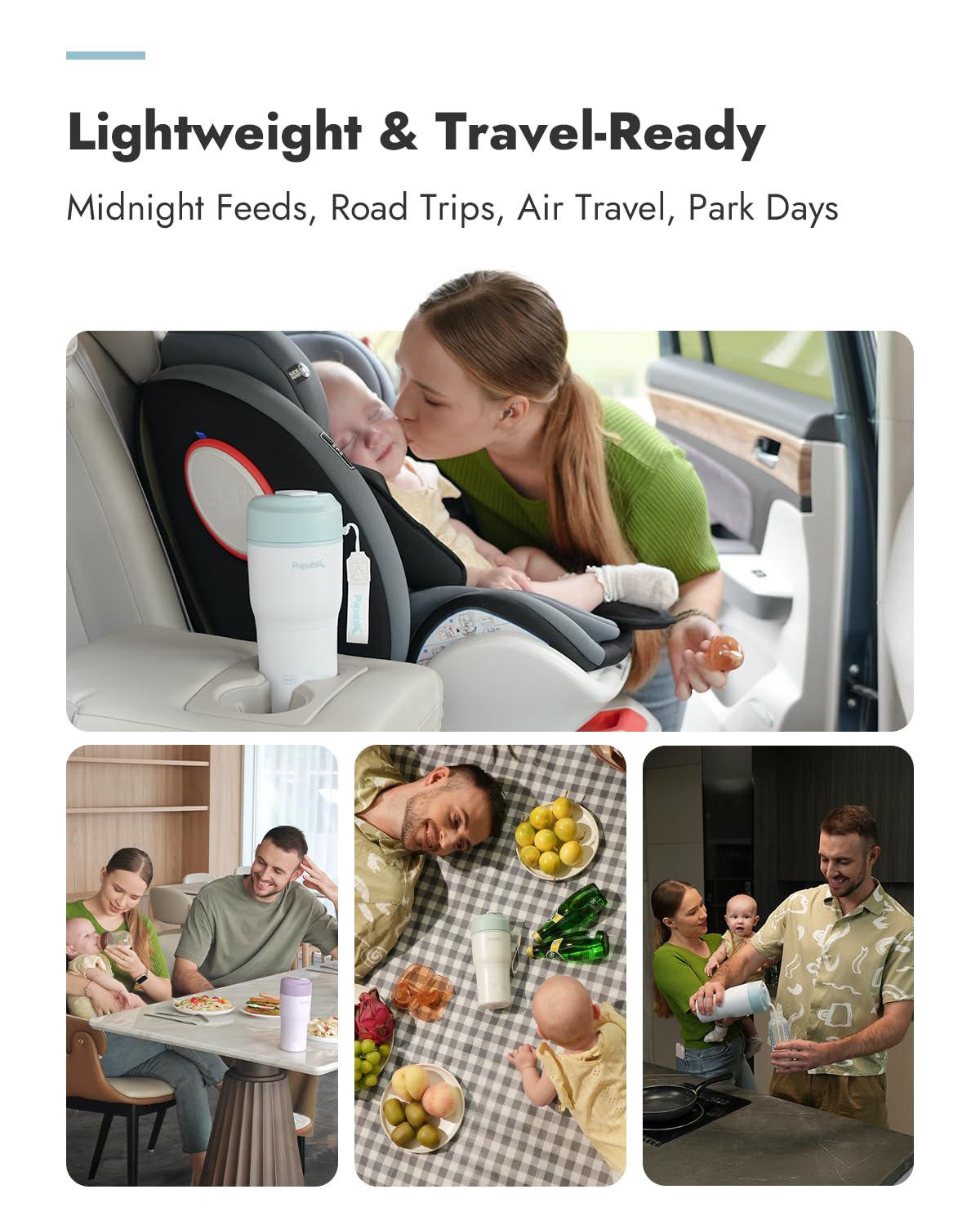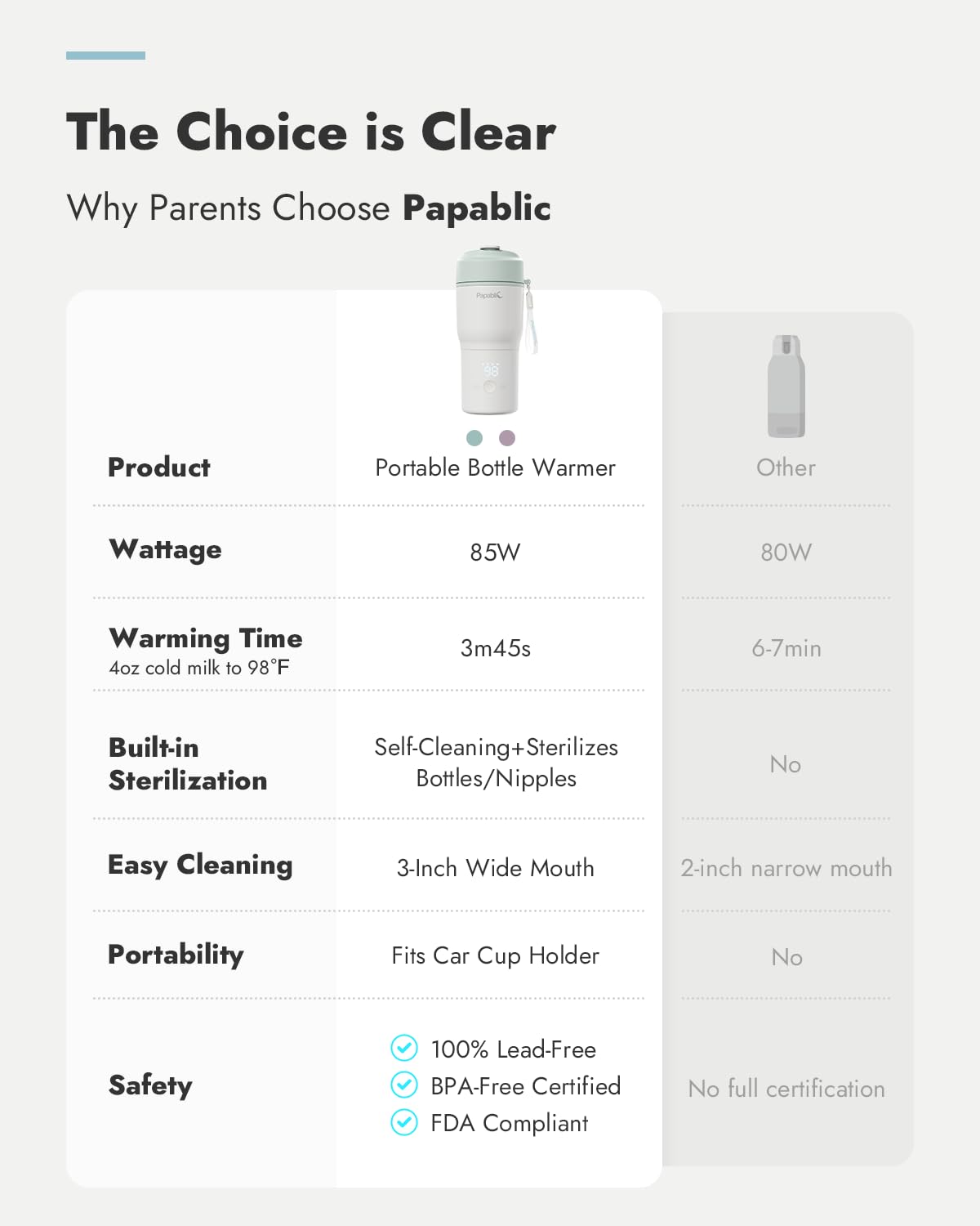 3-in-1 Convenience – Home & Travel: Papablic combines a traditional bottle warmer, portable bottle warmer, and portable sterilizer in one compact unit. Perfect for busy parents who want a versatile, space-saving solution.