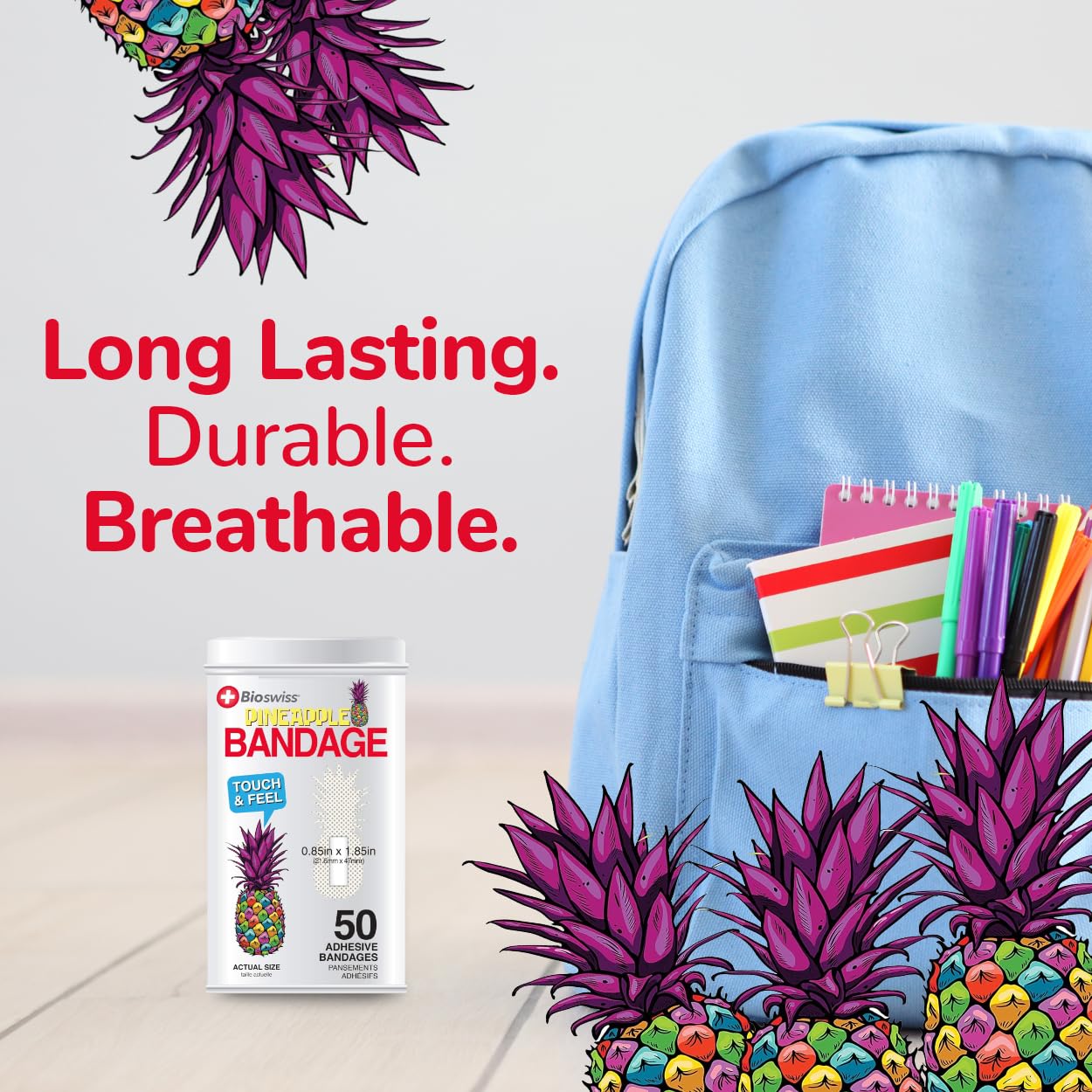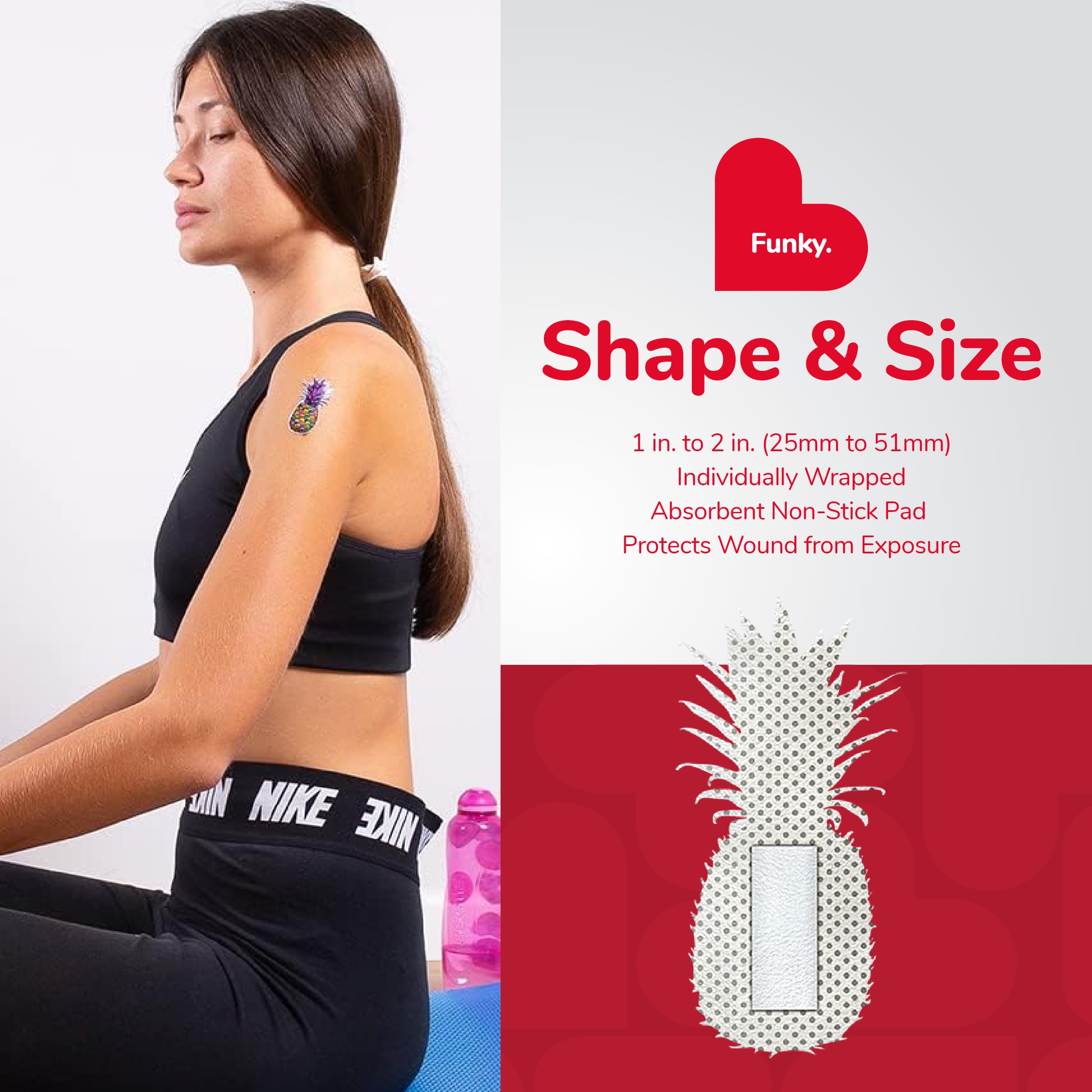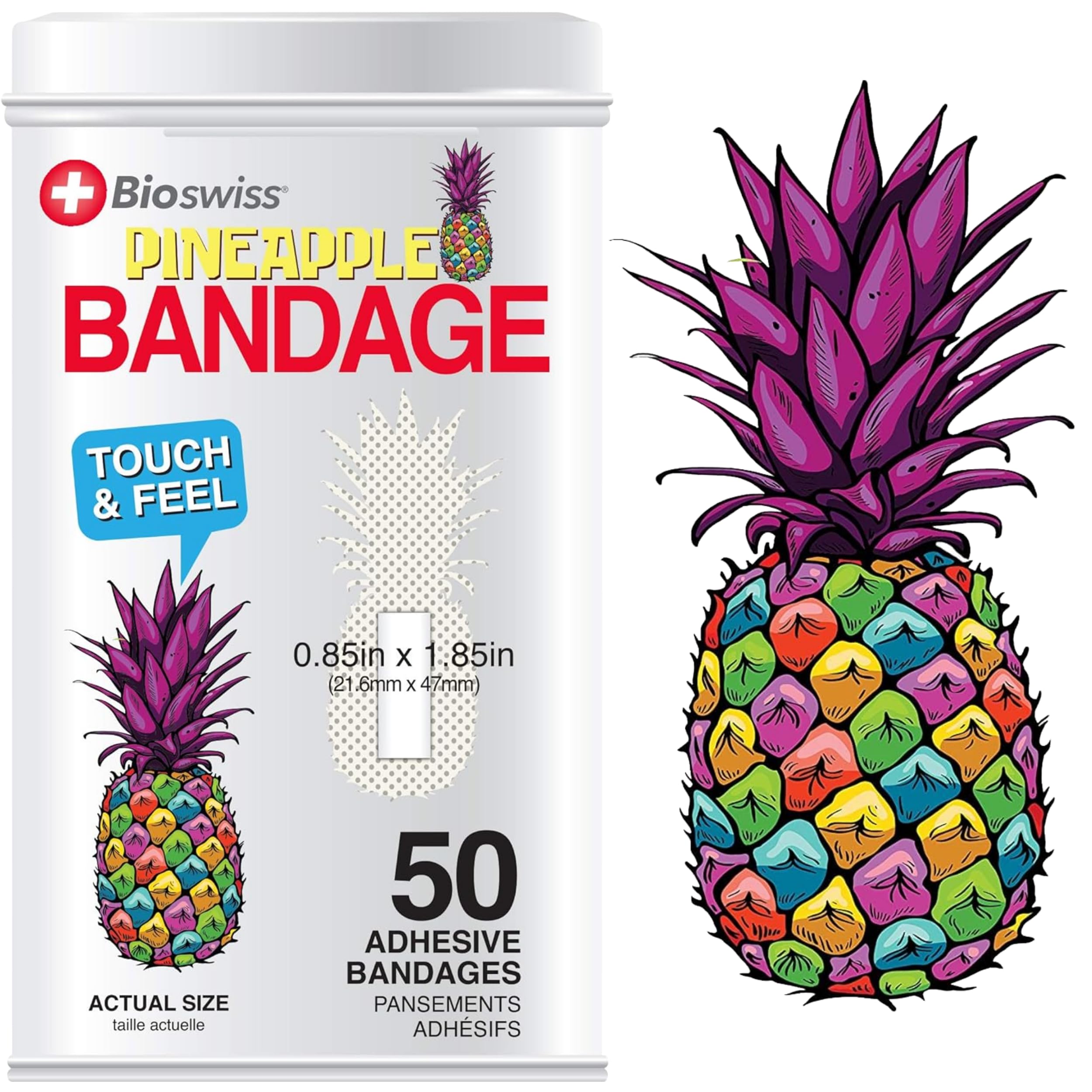 50 FUNKY PINEAPPLE KIDS BANDAGES: Fun pineapple-shaped adhesive bandages tin helps protect cuts, scrapes, and minor wounds while making healing less stressful for children
