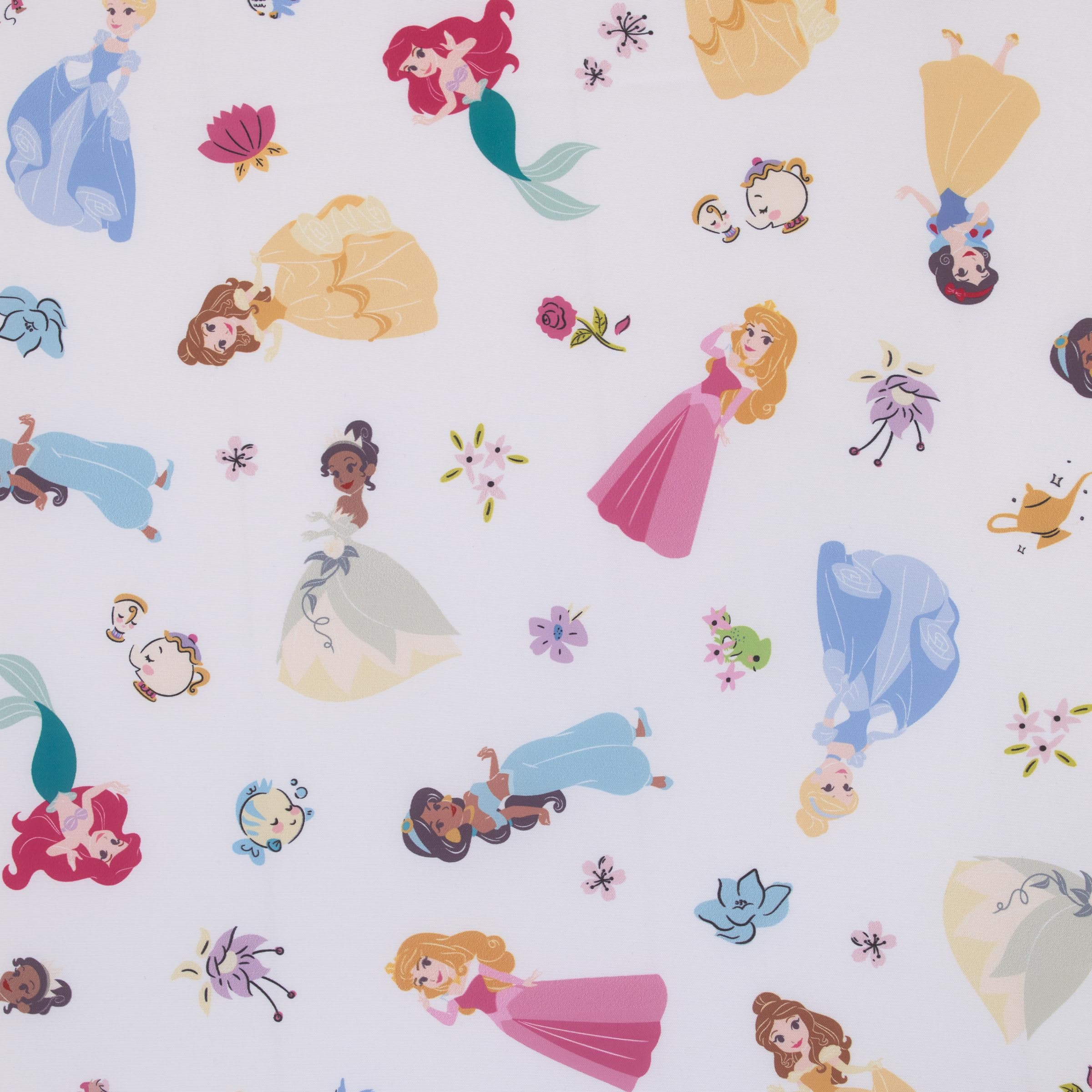 The Disney Princess Fitted Mini Crib Sheet features an enchanting allover pattern with many pretty Princesses. Includes Princess Cinderella, Ariel, Belle, Arora, Tiana, Jasmine, and Snow White. Your little one will sleep soundly on this mini crib sheet's cozy surface, comes in lovely shades of pink, light blue, yellow and white. Measures 24 x 38" x 5" and includes full elastic for a safe and snug fit and fits a standard size mini crib mattress. Coordinates nicely with most decor and perfect for your magical princess nursery!