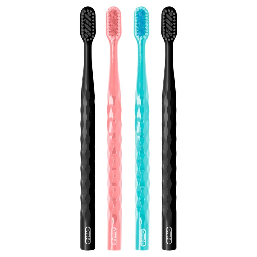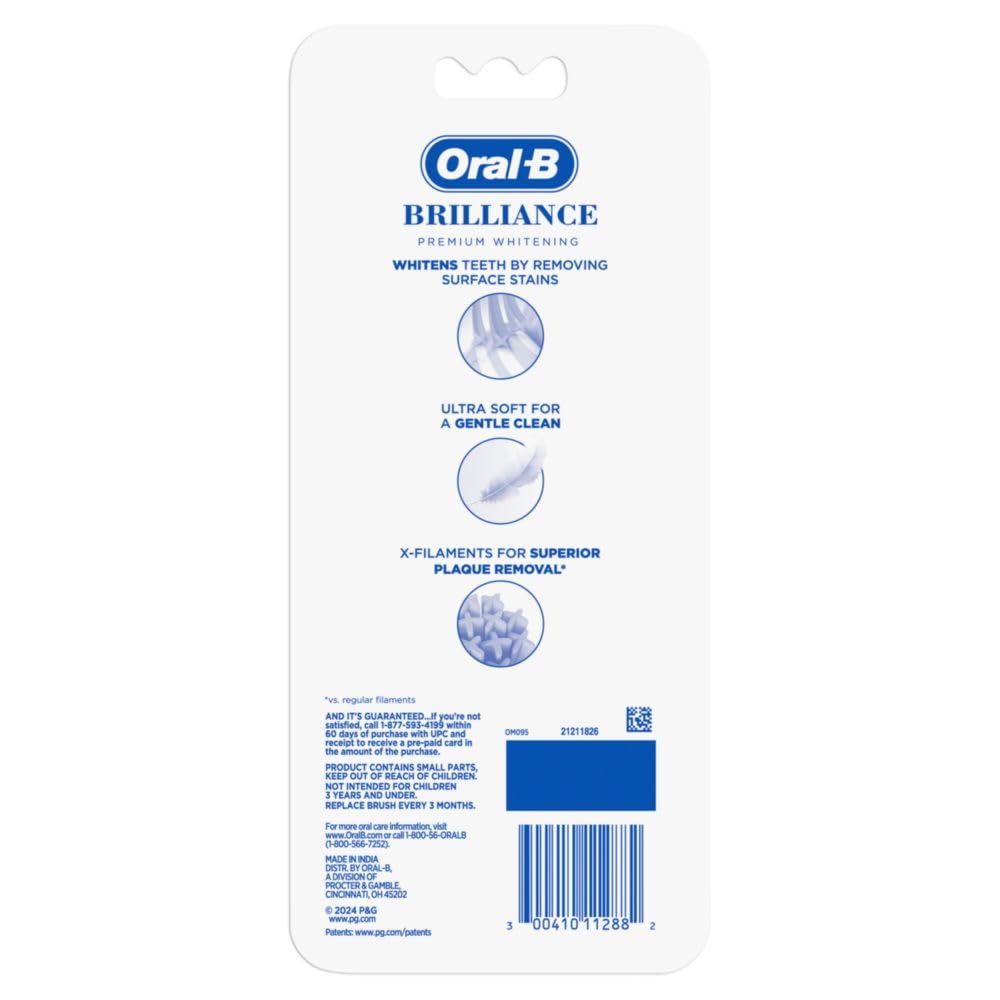 The Oral-B Pro Whitening Brilliance toothbrush is tough on stains and gentle on your gums. This extra soft toothbrush features ultra dense bristles to ensure a soft, gentle clean, while using X-shaped bristles to help polish away surface stains. With a beautifully designed handle for a style grip, you can always find the right posititon and grip for your hand on the toothbrush. The Oral-B Pro Whitening Brilliance toothbrush whitens teeth by removing surface stains. . For the best results, change your toothbrush regularly. A new toothbrush cleans 95% better in hard-to-reach areas*. This pack of Oral-B toothbrushes include different colors of toothbrushes for households with multiple people or stocking up. Oral-B is the #1 Toothbrush Brand Used by Dentists Worldwide. *vs. one 3 months old; research with a flat trim toothbrush