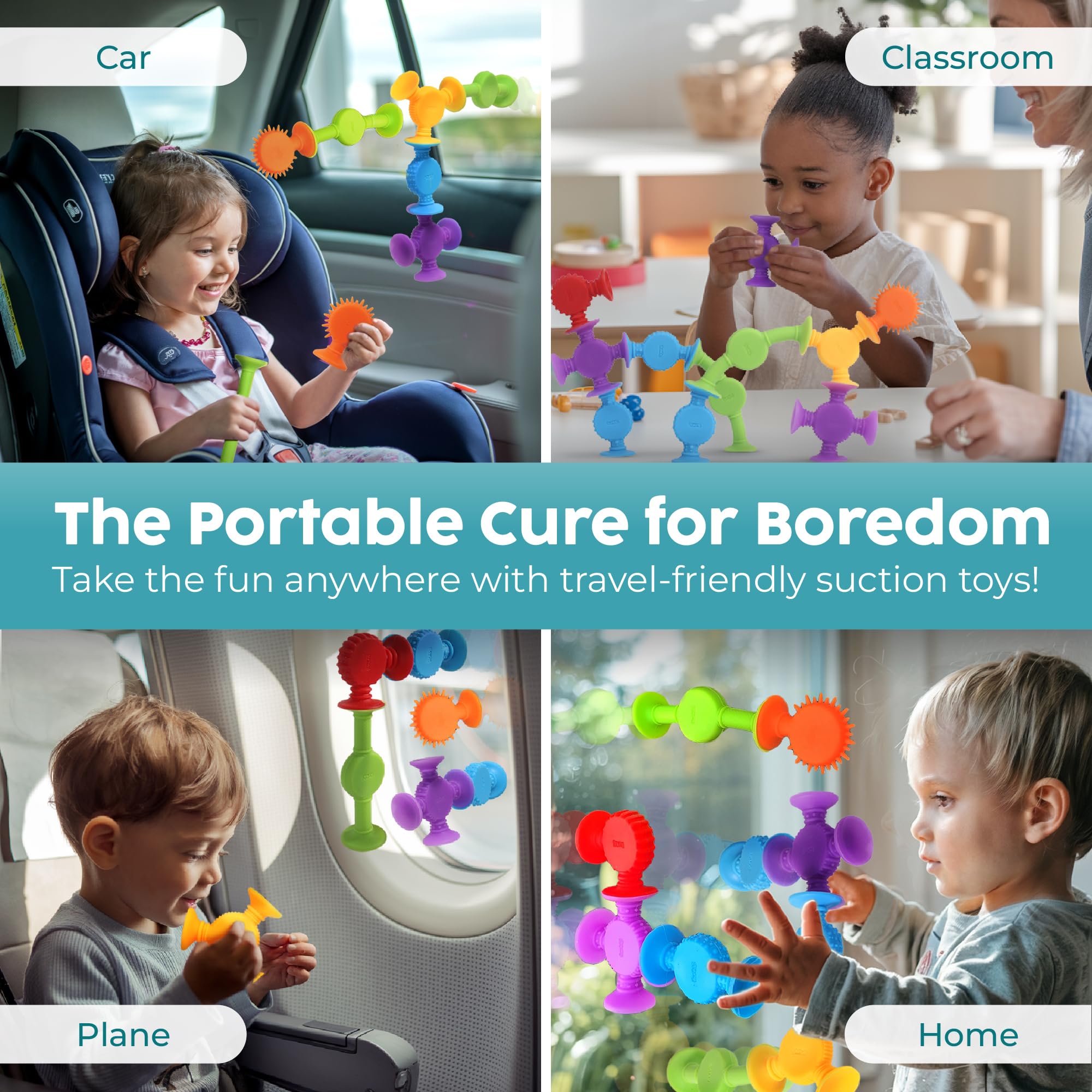 Take Them Anywhere - Stimulate young minds and spark creativity when connecting and building amazing creations in the bath, at home, in the car, on airplanes and more! Easily portable in a convenient carry bag, you can take our suction toys everywhere - keeping your children entertained no matter where you are!