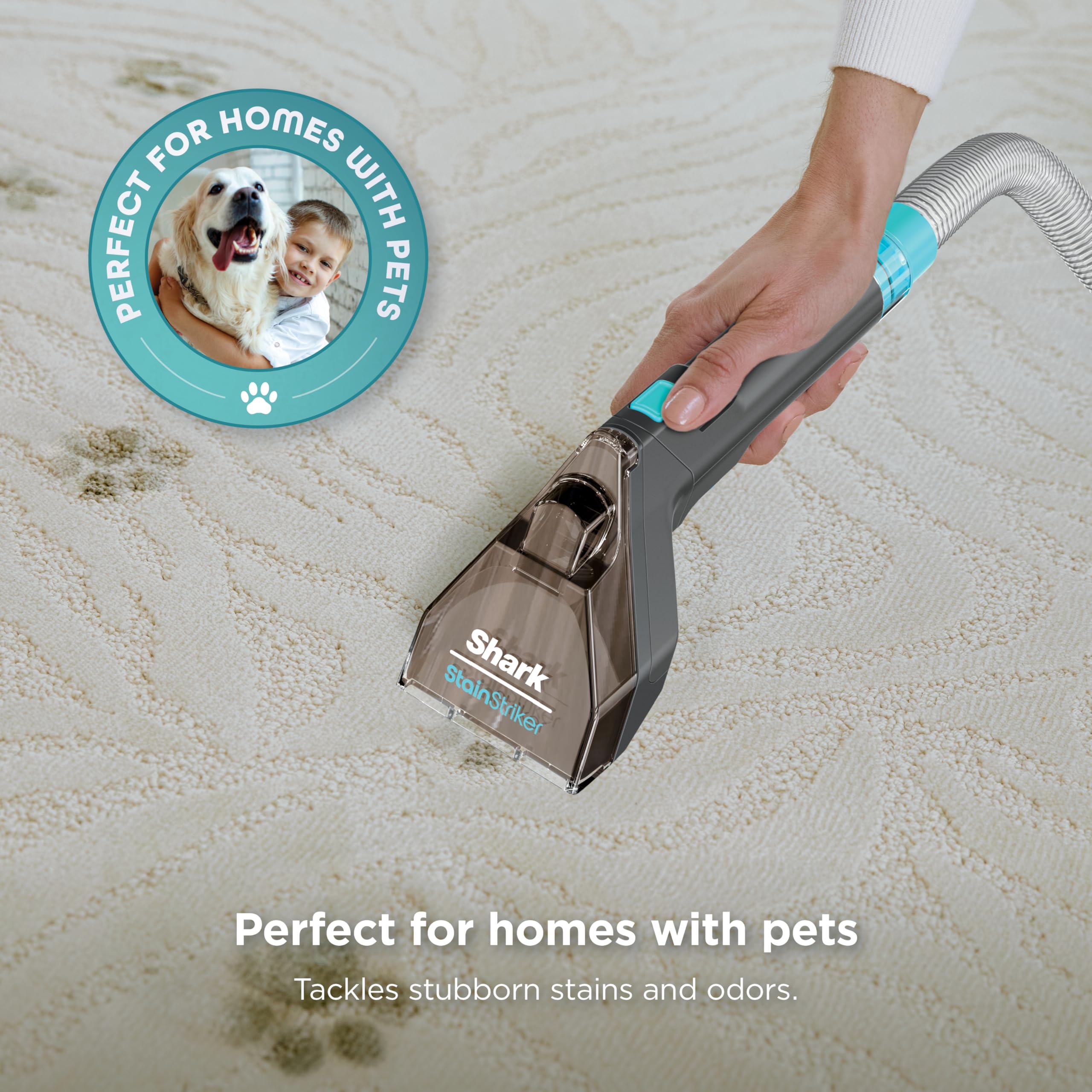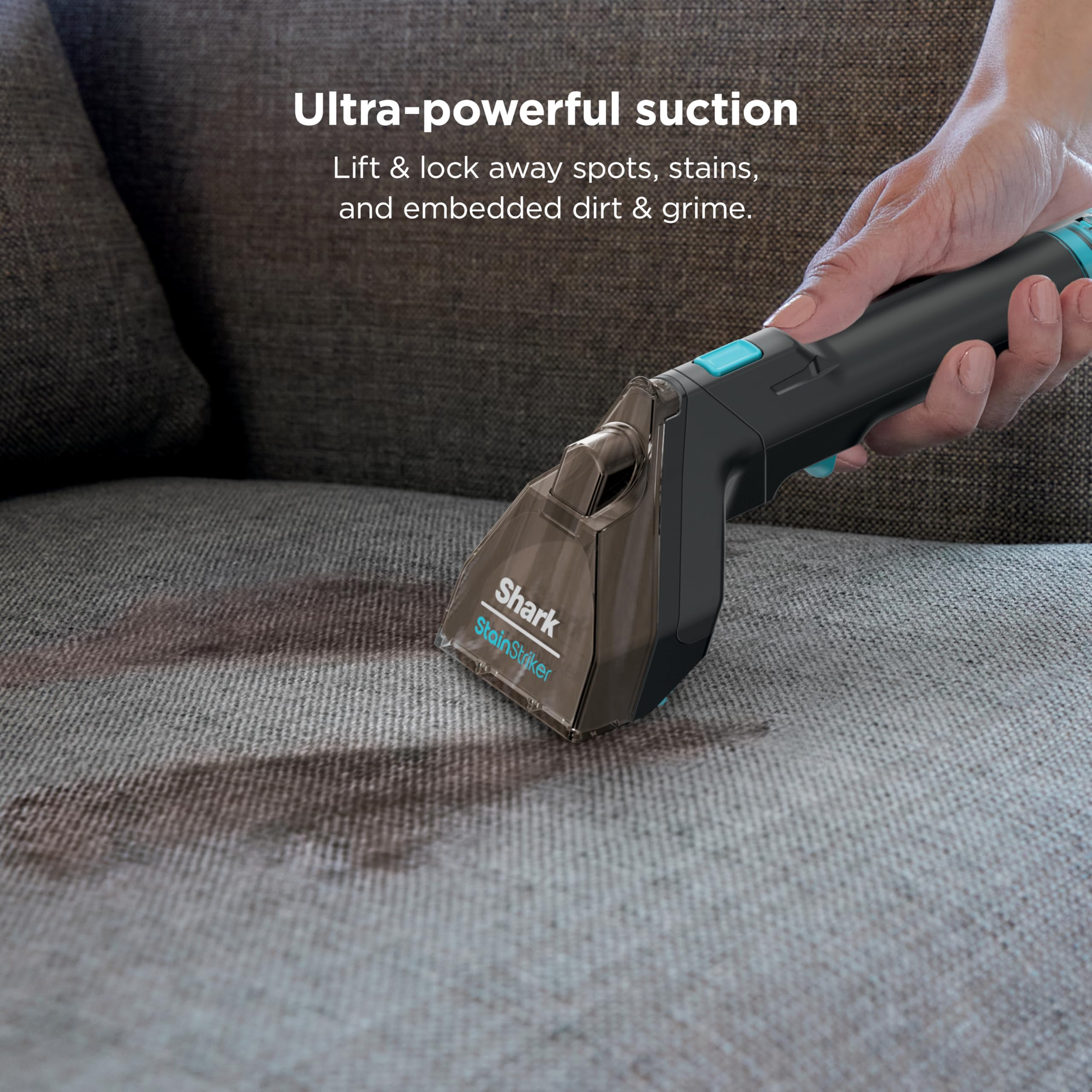 The Shark StainStriker is a portable spot & stain eliminator that delivers powerful tough stain elimination, with no premix required. Dual-activated solution unleashes the power of OXY delivering 20X more stain-striking power*. Tackle food stains, spills, embedded dirt, & pet messes throughout your home: carpets, area rugs, couches, upholstery & more.