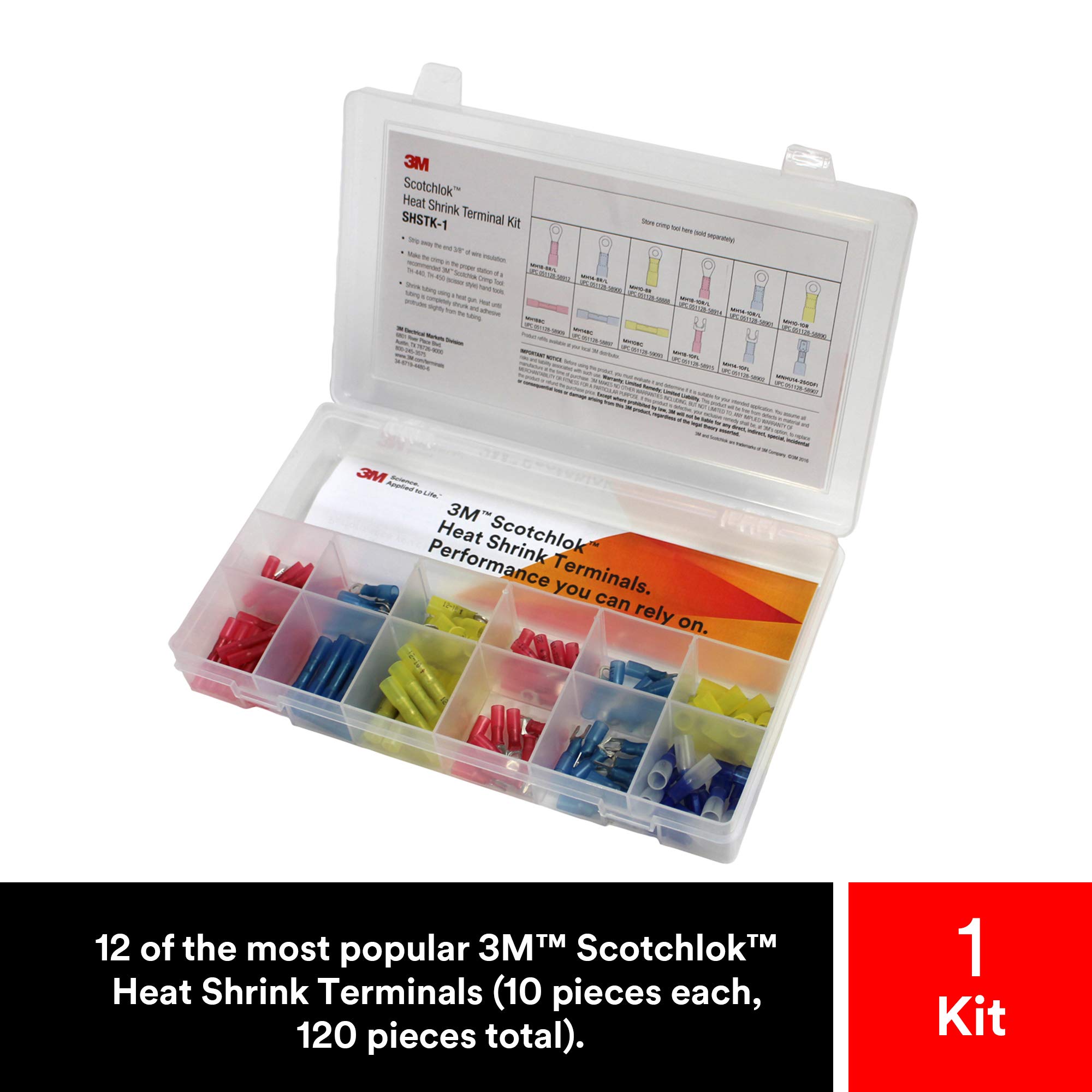 3M Scotchlok Heat Shrink Terminal Kit includes 12 of the most popular 3M Scotchlok Heat Shrink Terminals (10 pieces each, 120 pieces total). Get a selection of colored terminals, connectors and disconnects, all heat-shrink insulated for moisture protection, corrosion resistance and durability. The refillable plastic kit is compact, portable and durable. Made in the USA.