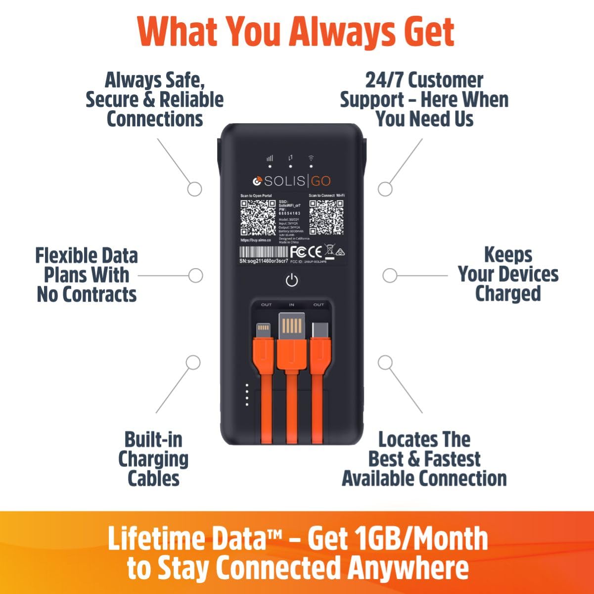 Easy to Use: Simply download the Solis app and register your device; start using your Lifetime Data plan or add an additional WiFi option to safely and privately connect to available signals