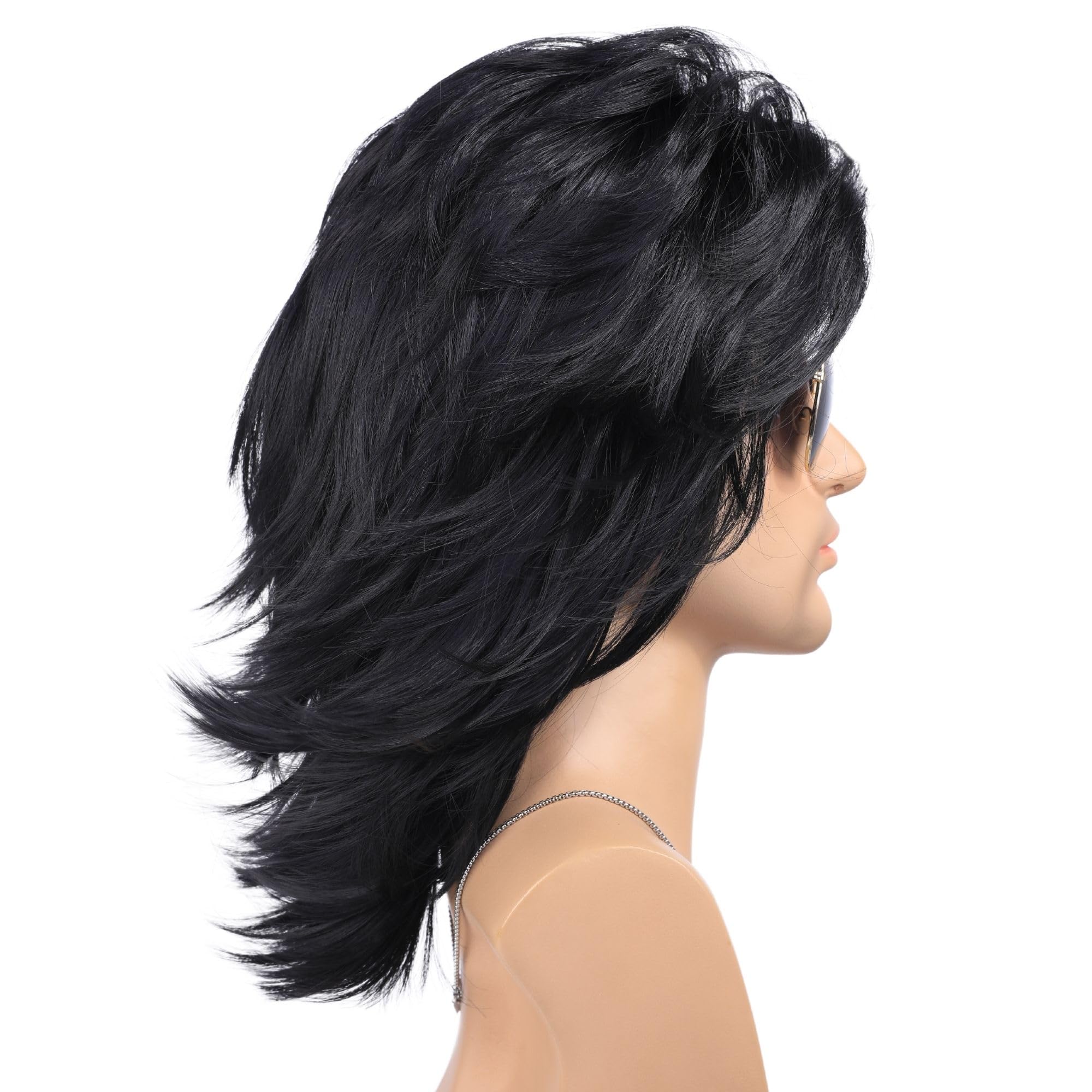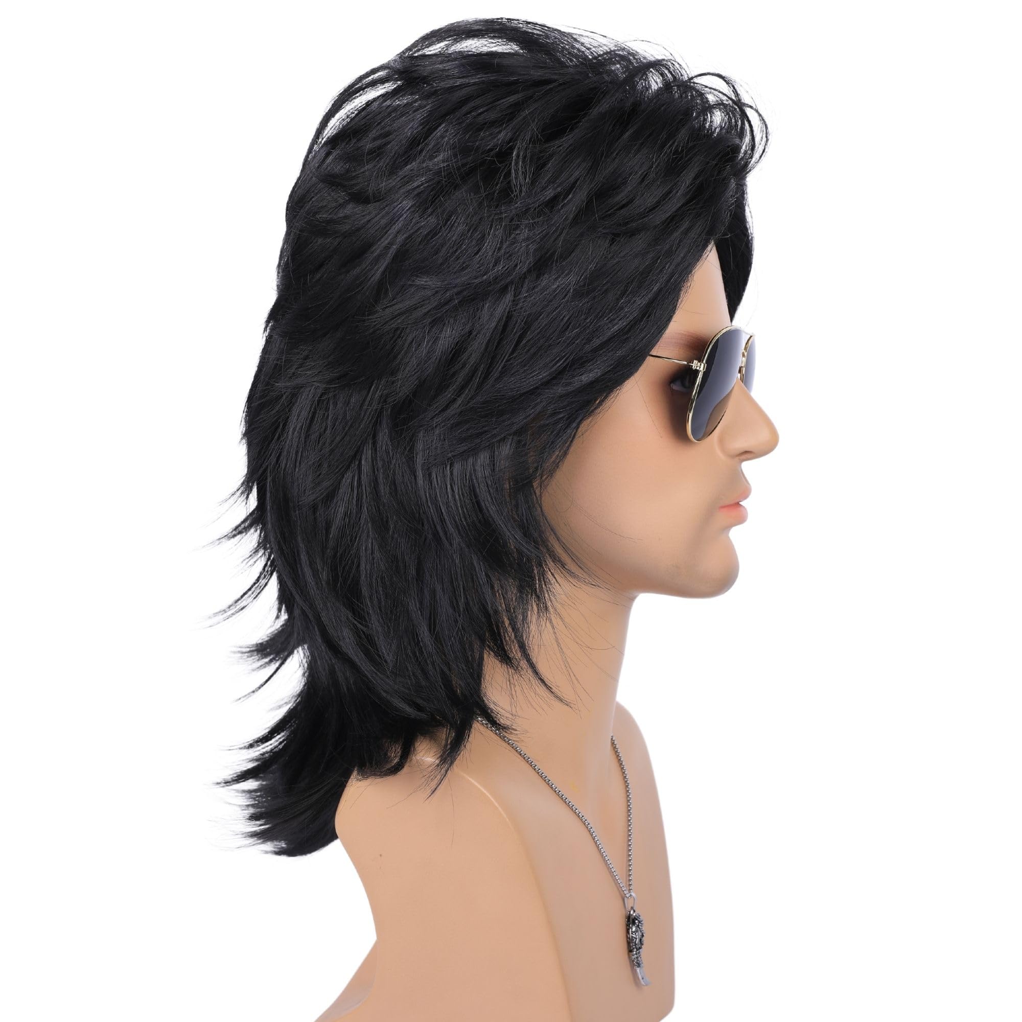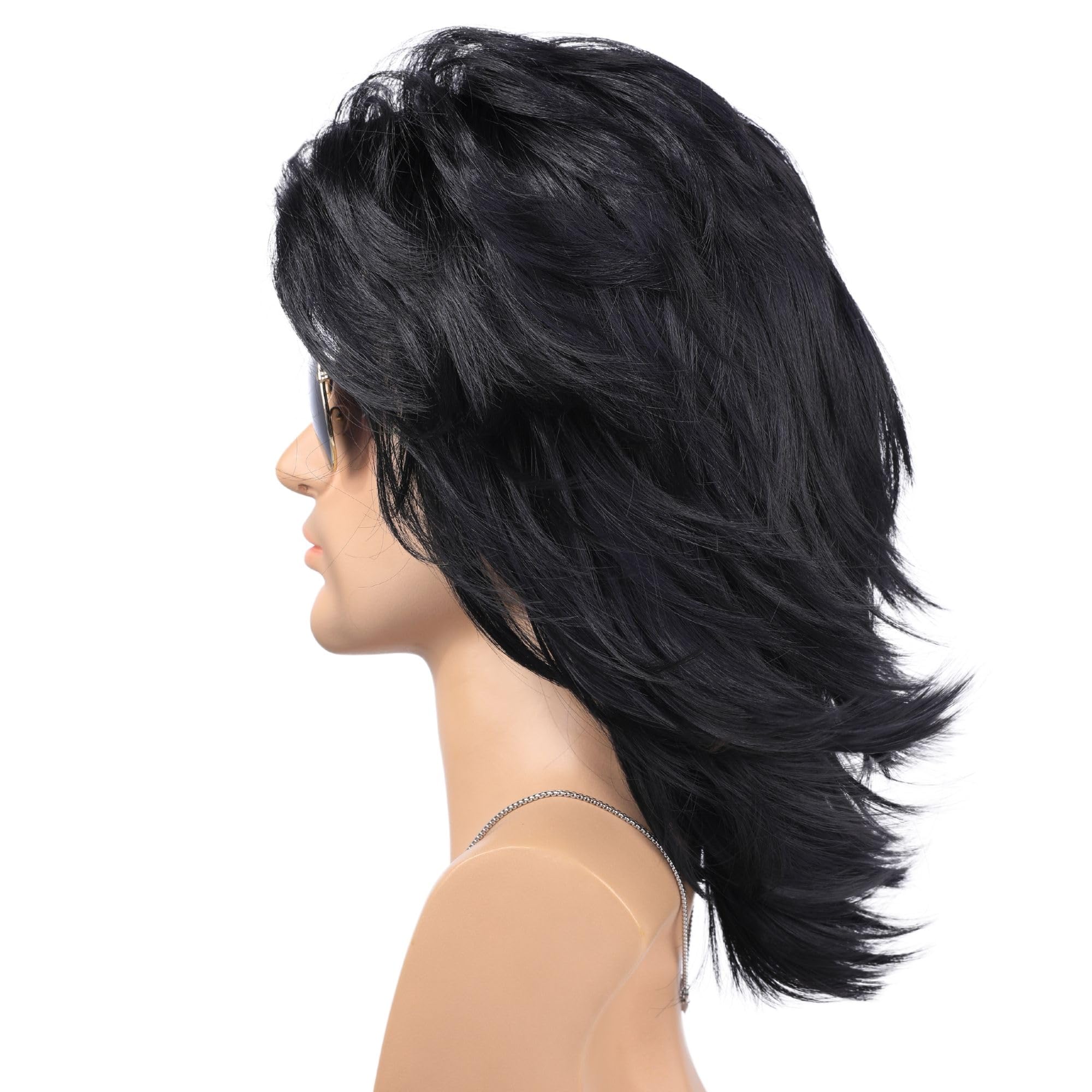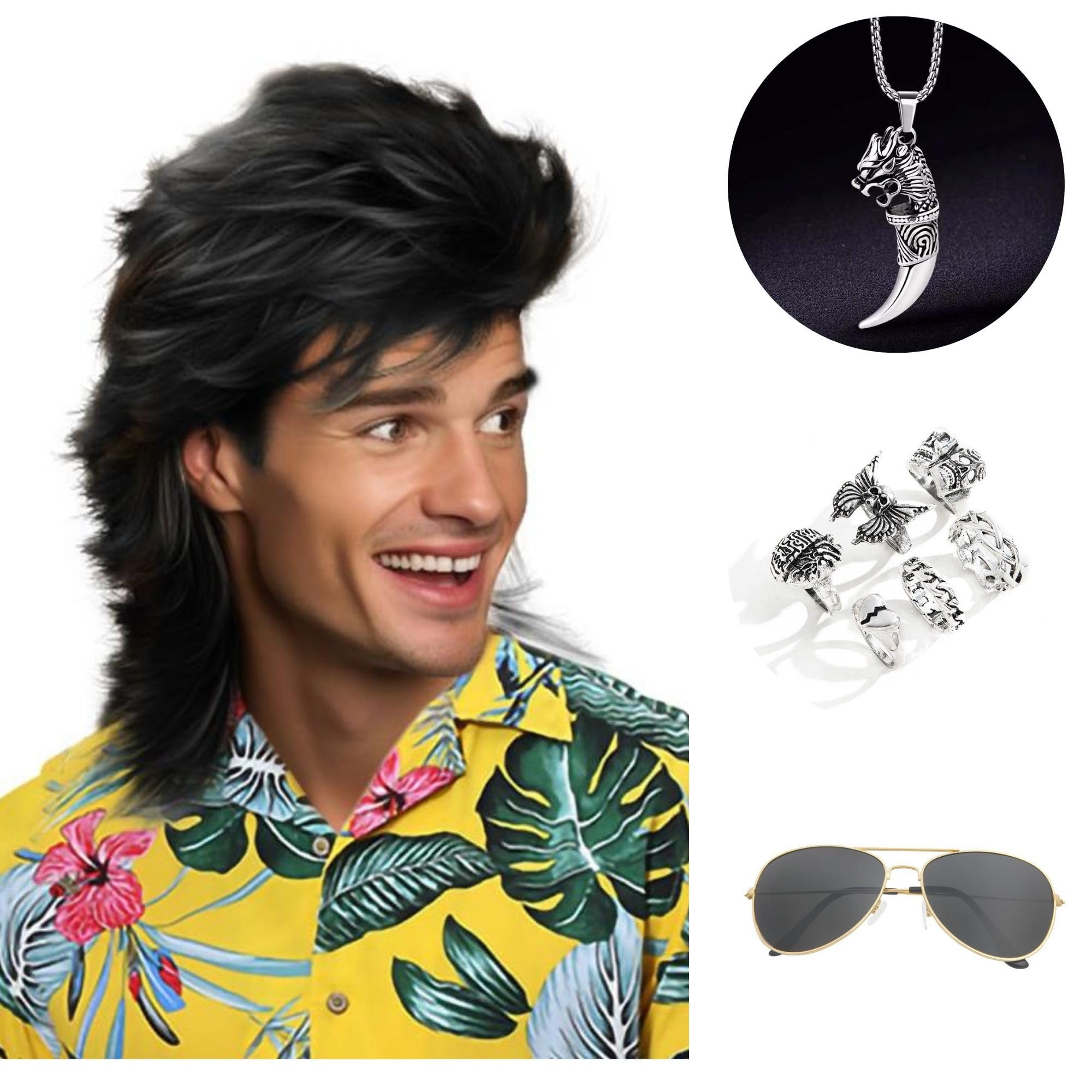 🎸 Package Included:1 wig+1 Wig Cap+1 Wolf Tooth Necklace + 6 pcs Metal Punk Rocker Rings +1 pcs Sunglasse.Don't miss out on the opportunity to sport this iconic 80s Mullet Wig for Men with Accessory. Get ready to turn heads, have a blast, and transport yourself back to the golden age of music and fashion. Embrace the spirit of the 80s and let your wild side shine with this fantastic wig!