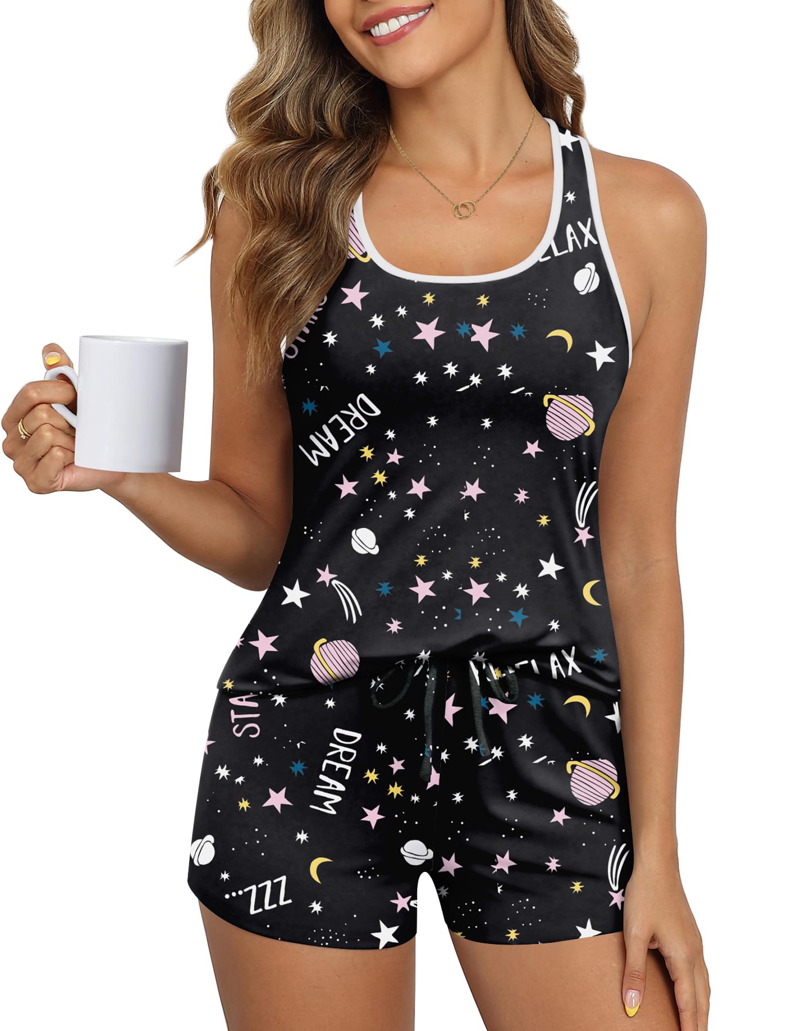 FEATURES: The top of sleeveless sleepwear features a classic racerback with contrasting color edges at the neckline, simple and stylish. The comfy short is designed with an elastic waist and drawstring, it is easy to put on and take off.