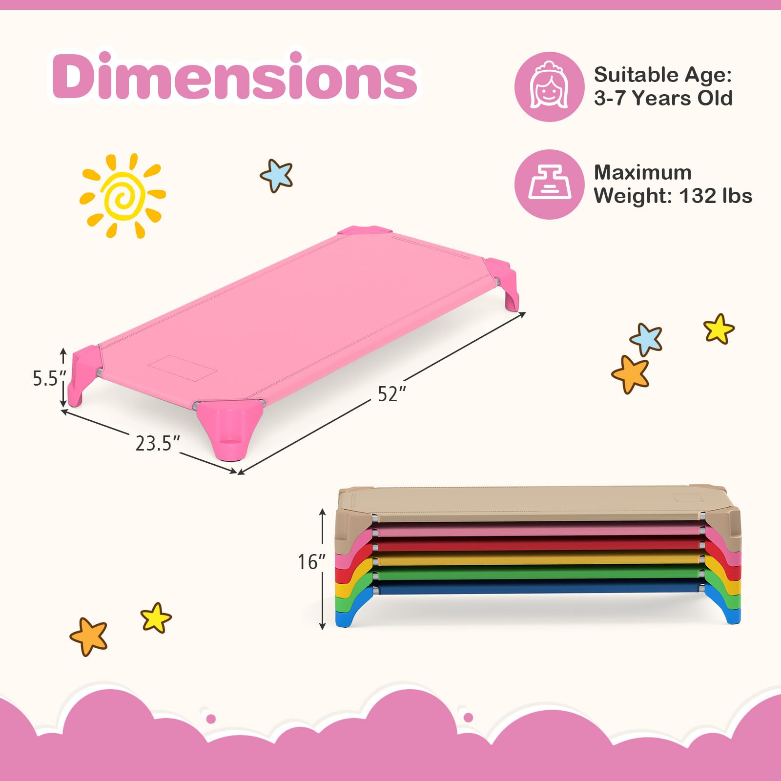 Description: Create a cozy and efficient nap time environment with this 6-pack stackable toddler cot set. Designed to maximize space, these lightweight cots stack vertically for easy storage and quick access. Crafted with a sturdy structure and reinforced plastic corners, they offer lasting durability and stable support for toddlers, while smooth edges prevent accidental injuries. The tear-resistant Oxford fabric provides breathable comfort to keep children cool during rest. Ideal for nap time or as temporary beds, these portable toddler cots require easy assembly, making them perfect for busy daycare centers. Ensure children enjoy a peaceful, comfortable sleep with our reliable, space-saving daycare cots. Features: Vertical stackable design maximizes storage space when not in use Galvanized metal frame ensures stability and long-lasting use Reinforced plastic corners prevents wobbling Safety assurance provided by premium materials that are BPA-free and odorless Premium Oxford fabric is wear-resistant, tear-resistant, and breathable Smooth edges minimizes the risk of accidental injuries Elevated legs improve air circulation beneath the cot Lightweight cots are easy to transport for quick room setups Hook and loop fasteners allow quick removal and maintenance Adds a playful touch to preschools, classrooms, and daycare centers Specifications: Color: Blue/Colorful Material: Galvanized Metal, PP, Oxford Fabric Stacked Size: 52” x 23.5” x 16” (L x W x H) Overall Dimensions of Each Cot: 52” x 23.5” x 5.5” (L x W x H) Net Weight: 35.5 lbs Weight Capacity: 132 lbs Recommended Age: 3-7 Years Old Package Includes: 6 x Stackable Daycare Cots 1 x Instruction