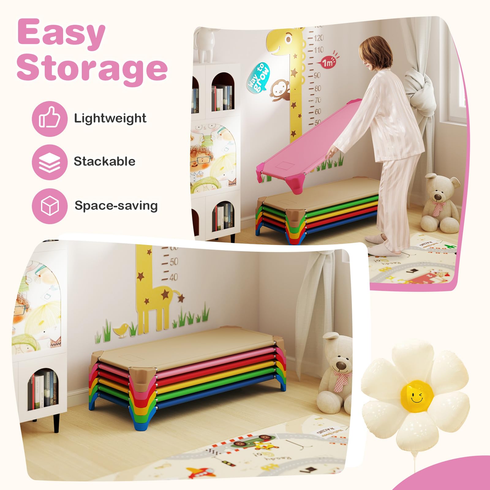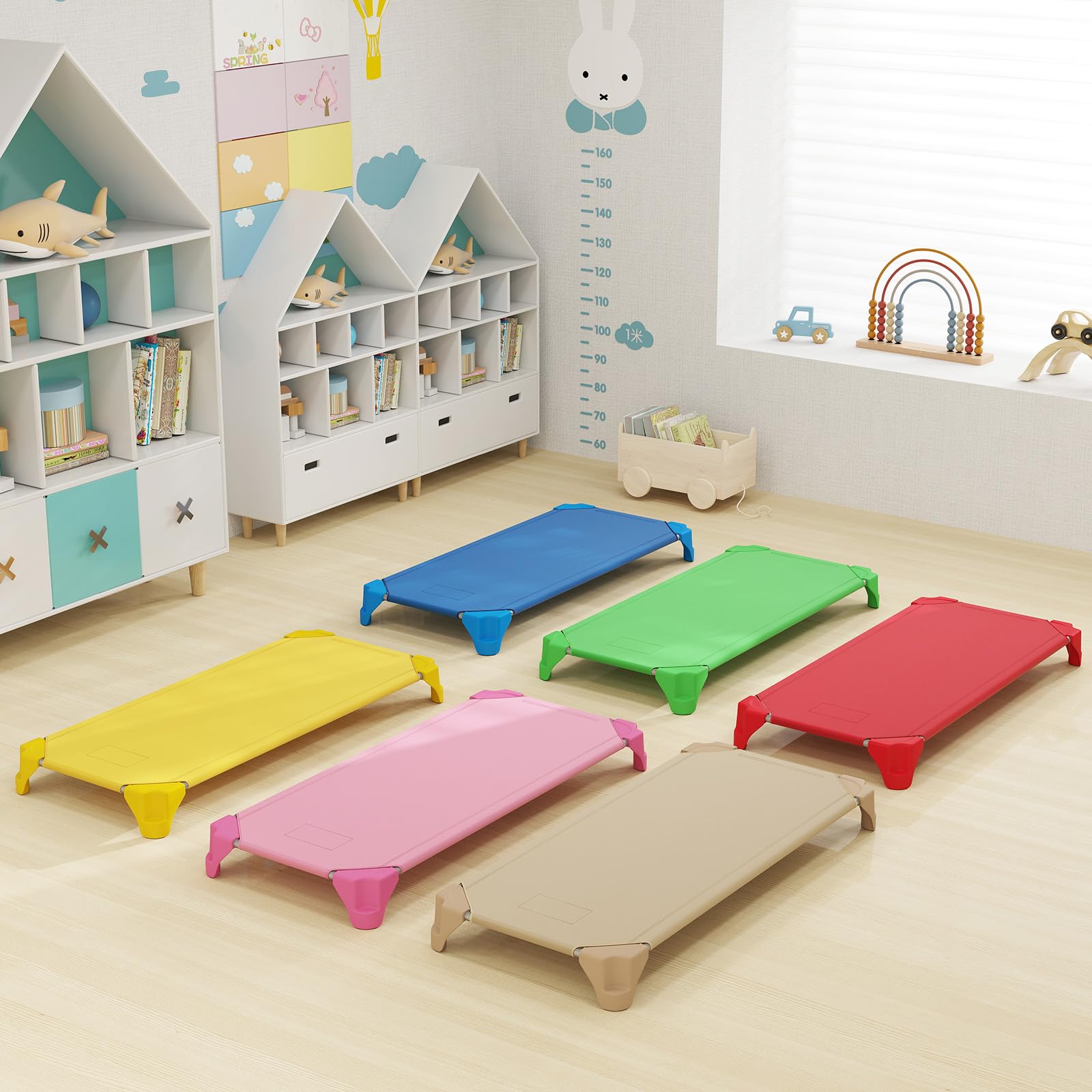 [ Space-Saving Stackable Design ]: The 6-pack toddler cot set can be stacked neatly in a compact vertical arrangement (only 52" x 23.5" x 16" in stacked size), saving valuable floor space. Lightweight and easy to transport, these cots allow for quick relocation between rooms or classrooms.