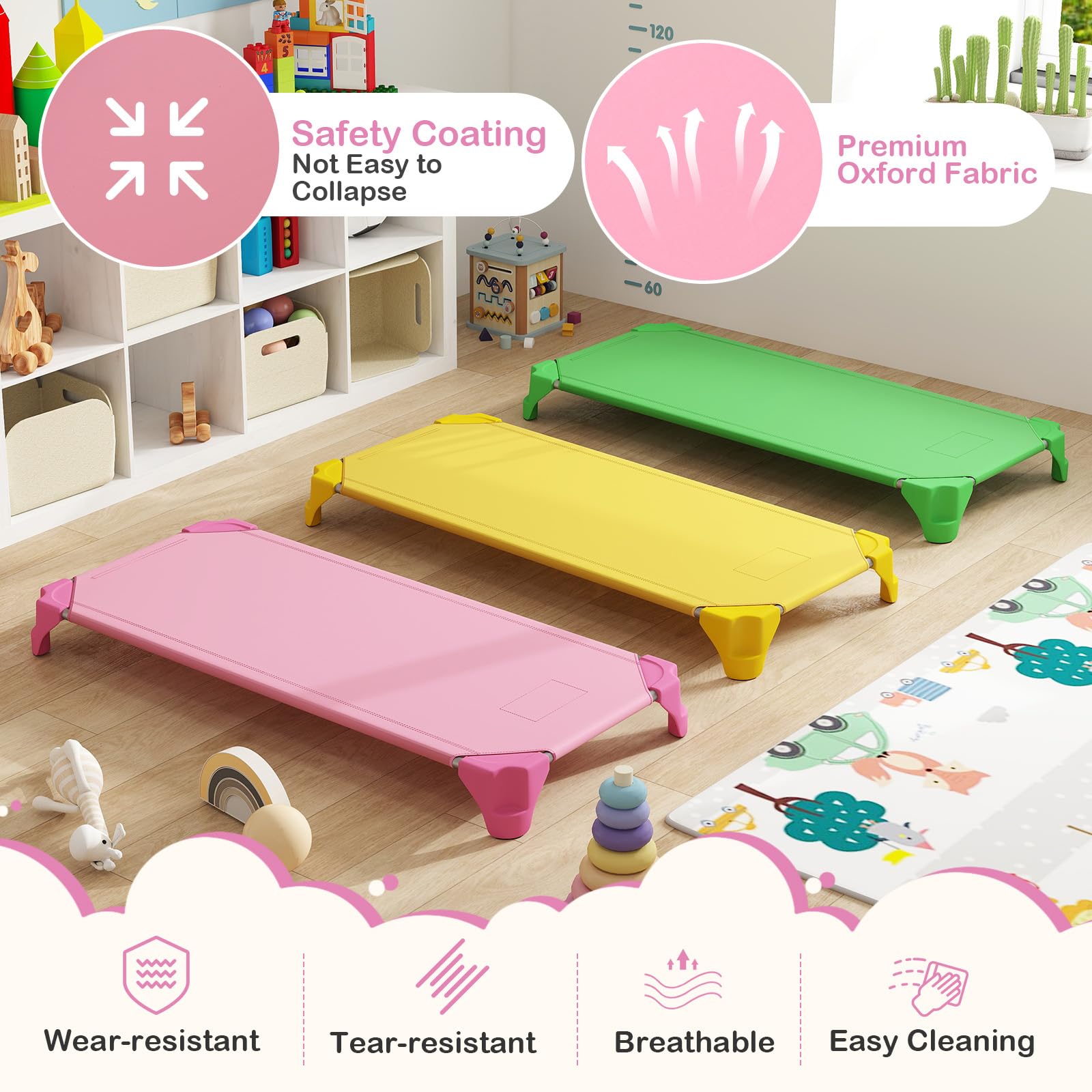 [ Comfortable Naptime ]: The sleeping surface is made from high-quality, tear-resistant Oxford fabric with a safety coating, ensuring long-lasting use. The breathable fabric provides a cozy and ventilated sleeping area, while elevated leg improve air circulation beneath the cot, keeping children cool during rest.