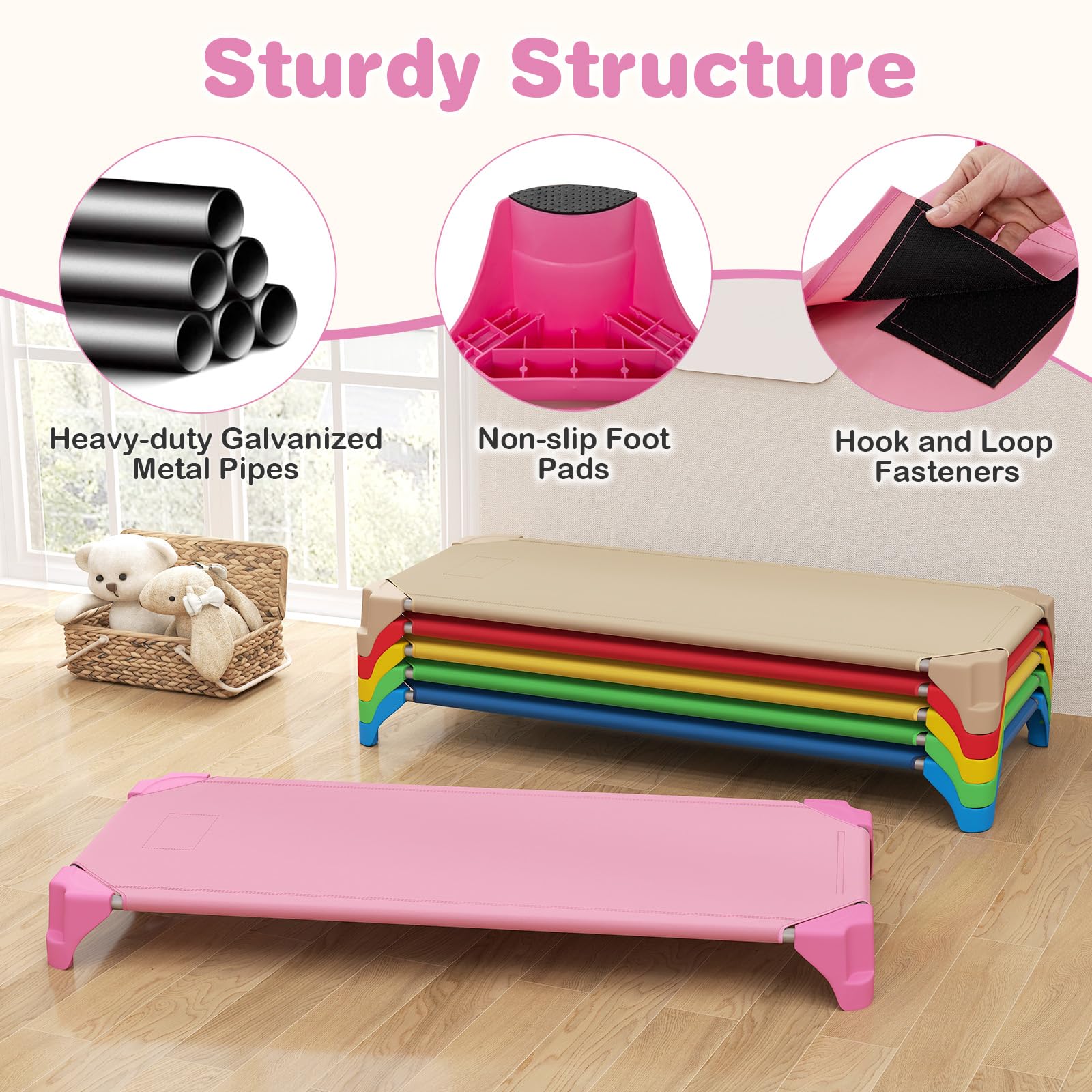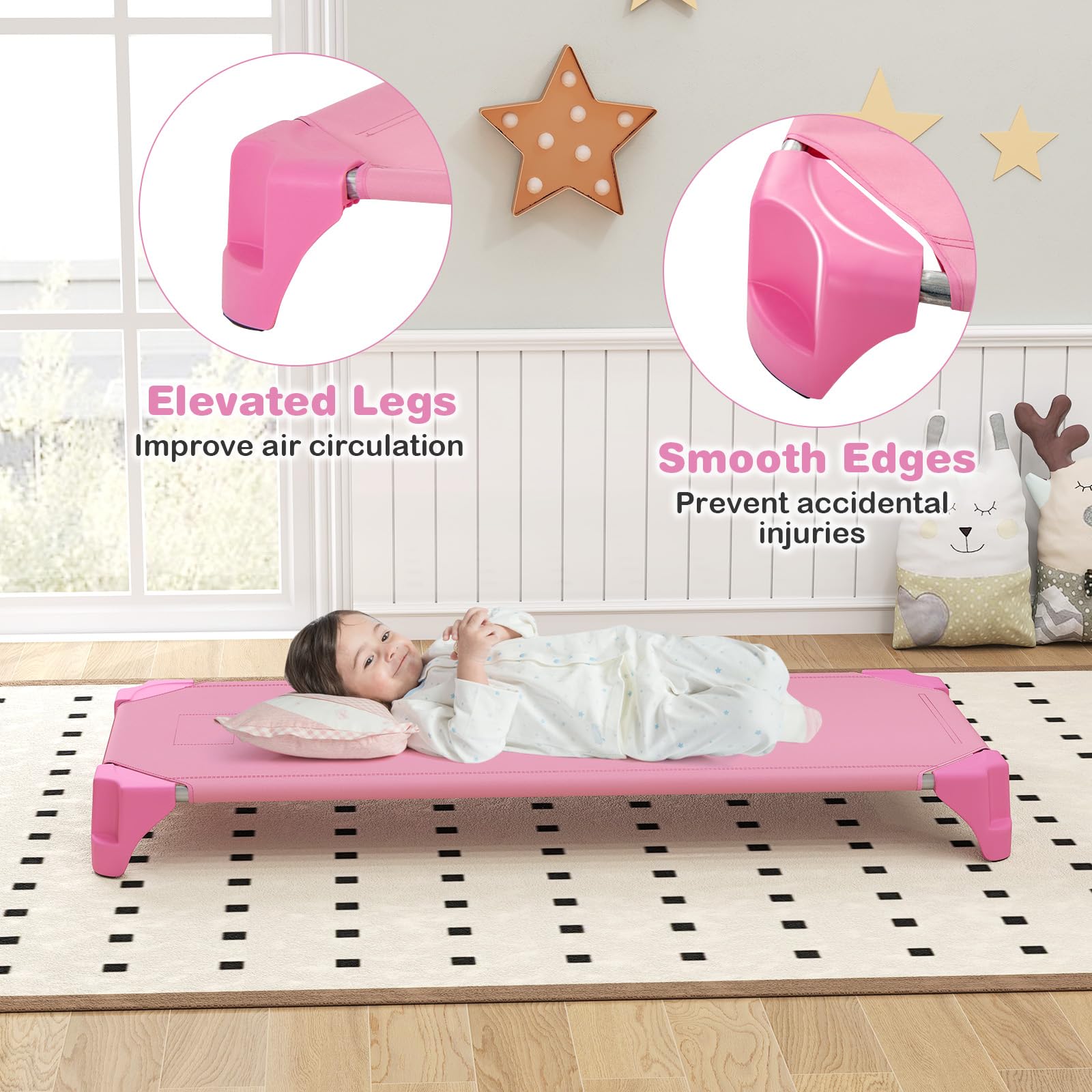 [ Sturdy Metal Frame ]: Crafted with galvanized metal pipes, each sleeping cot ensures stability and durability, supporting up to 132 lbs. Reinforced plastic corners enhance stability by preventing tipping, while non-slip foot pads protect floors from scratches. It's suitable for both preschool kids and pets.