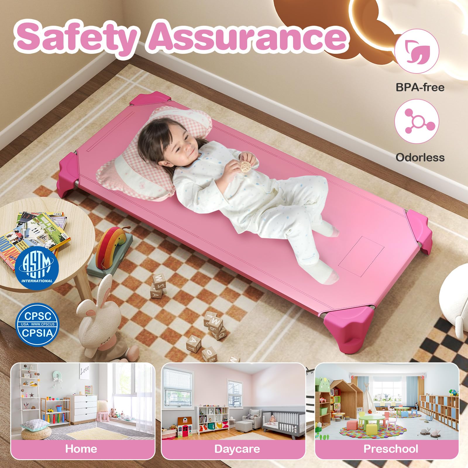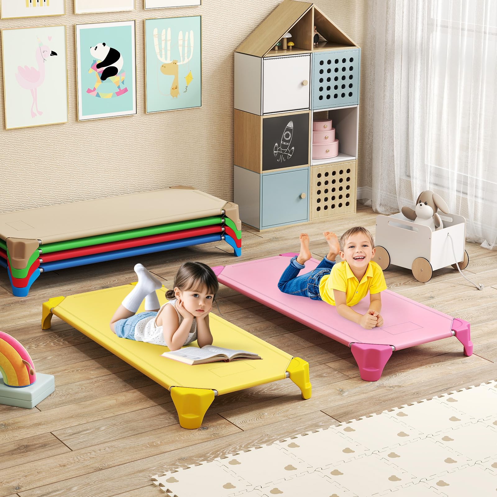 [ Versatile and Stylish for Many Scenes ]: The portable toddler sleeping cots are suitable for various settings, including classrooms, preschools, kindergartens, and daycare centers. The vibrant colors and modern design make the cots both functional and visually appealing in any space.