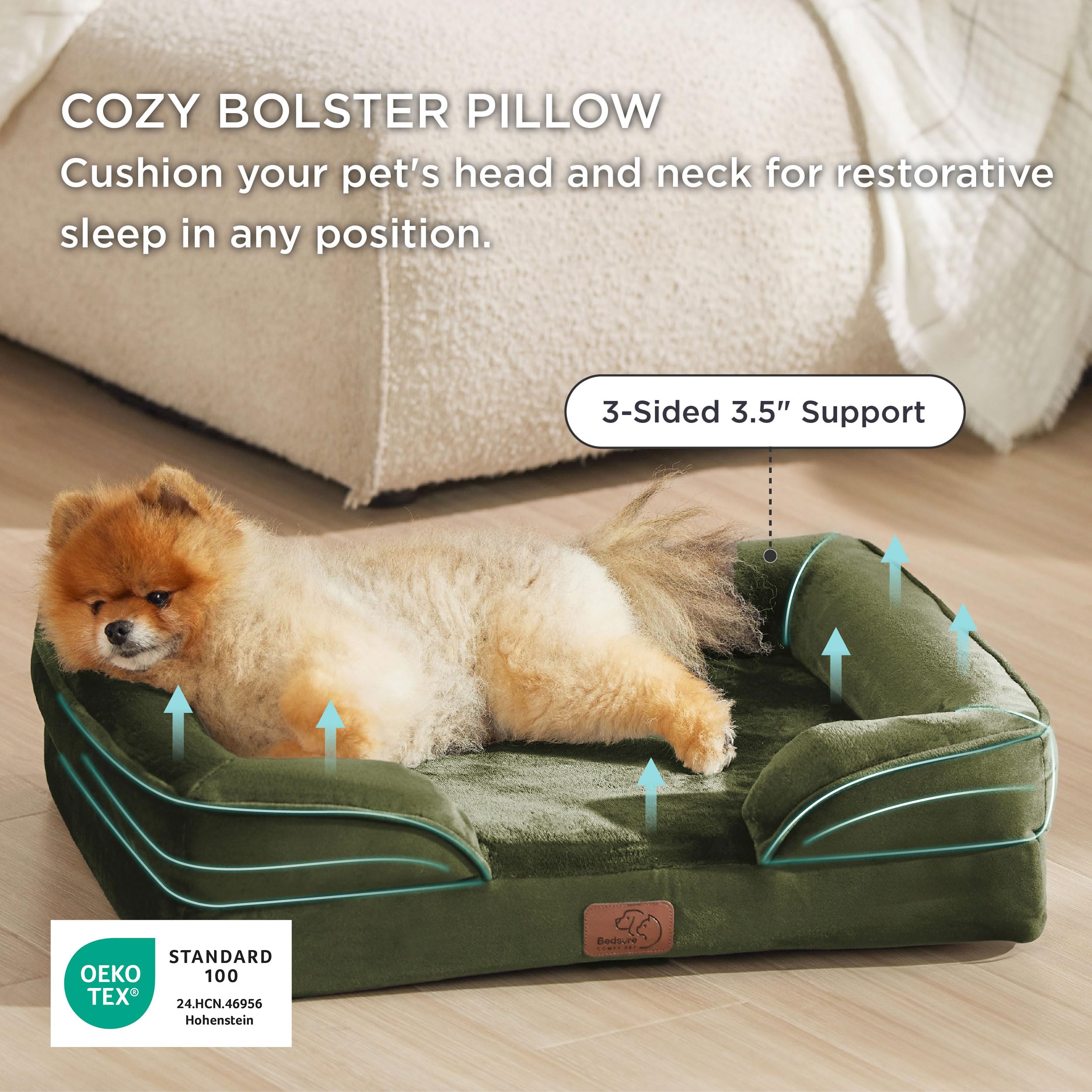 Enhanced Comfort: The 4-sided bolster design promotes ultimate comfort and security, offering your pet a variety of cozy positions to snuggle. The cushioned bolster shape is deeply filled to support your pet’s head and neck for a more restful sleep. And the lowered entrance protects your pet's knees and promotes accessibility.