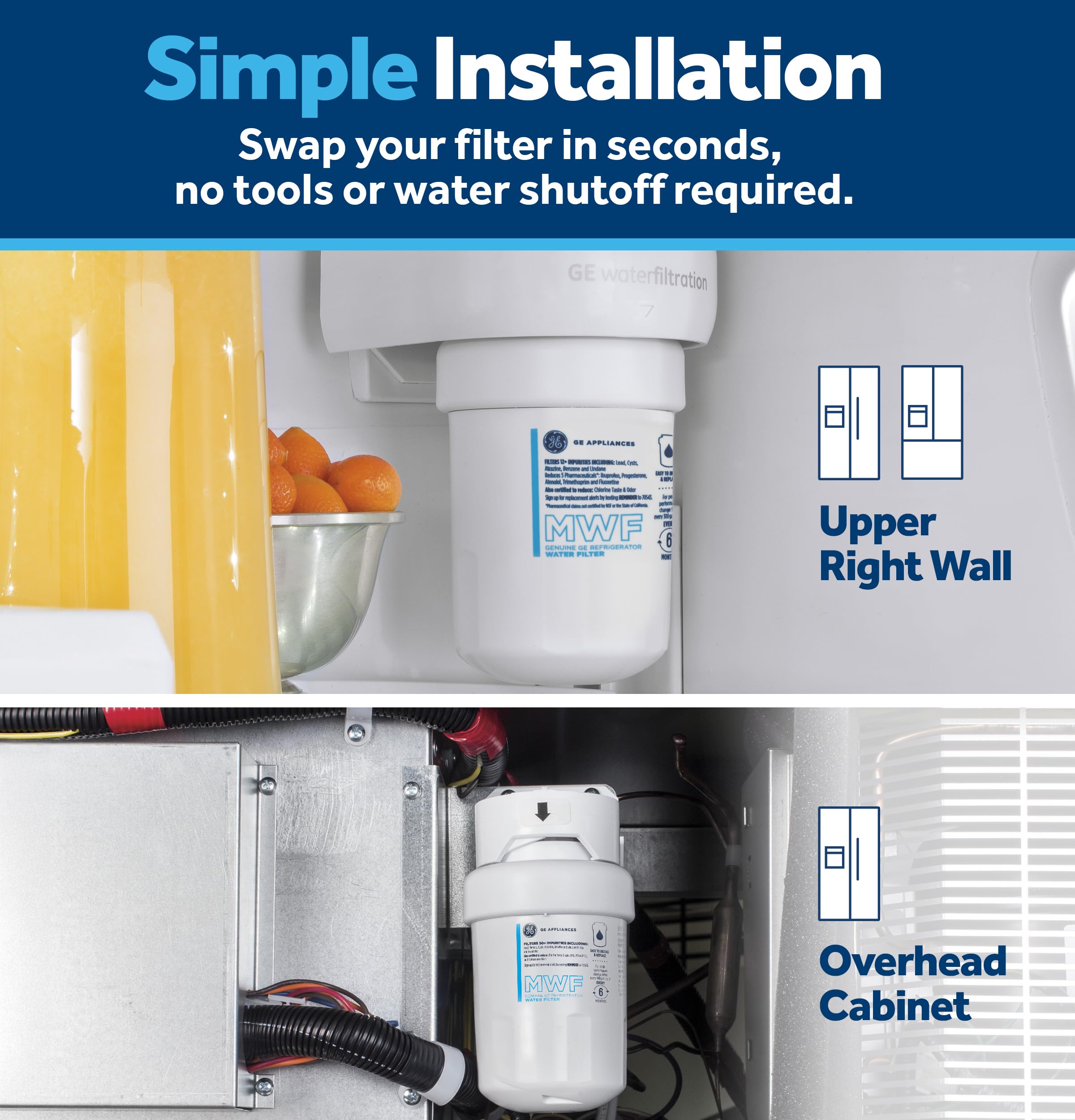GE Appliances genuine water filters are certified to NSF/ANSI Drinking Water Treatment standards to improve the quality of your home water. Imitation or counterfeit water filters can damage your water filter system and arenβt guaranteed to reduce the impurities in your water. Genuine GE water replacement filter, MWF, reduces five trace pharmaceuticals, including: ibuprofen, progesterone, atenolol, trimethoprim & fluoxetine.* (*Impurities not necessarily in all usersβ water).